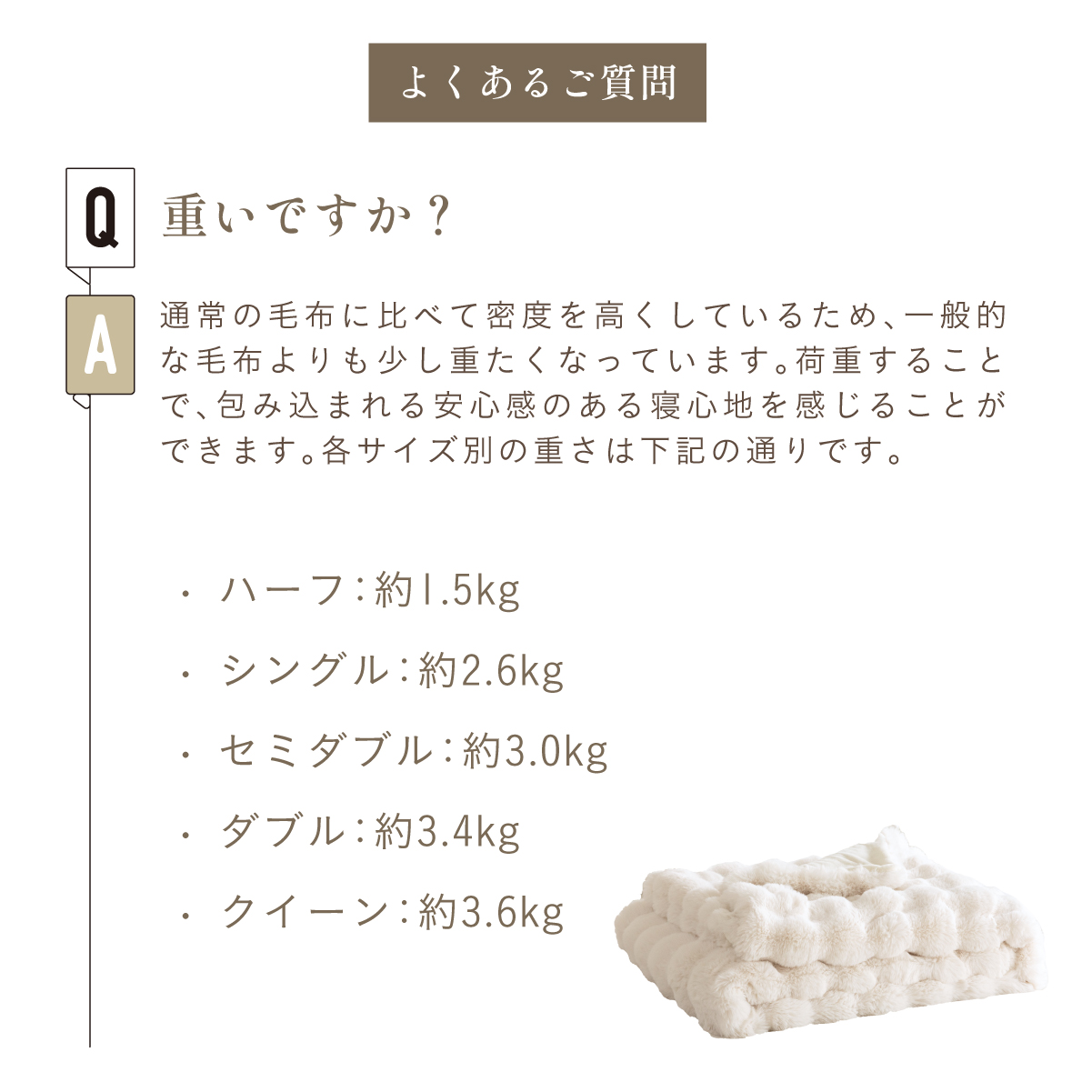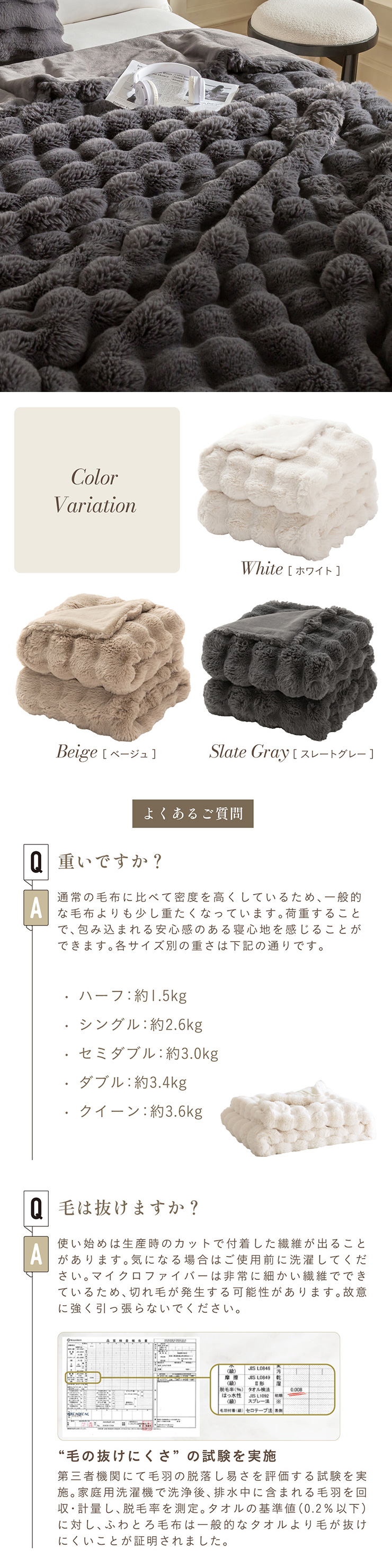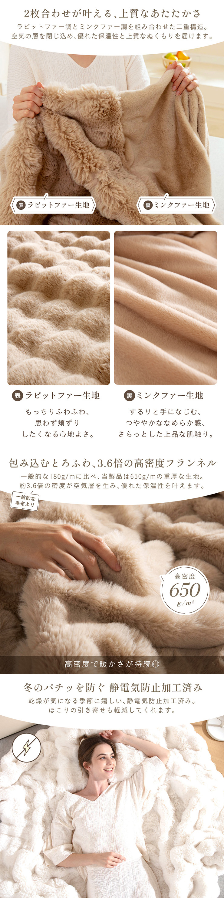 【NERUS×smart-i】触れた瞬間ふわとろ 毛布 Muir(ミューア) 選ばれ続けるやわらかさを、家族のスタンダードに 各方面で高いご評価をいただくNERUSの「ふわとろ毛布」と、 子ども家具で定評のあるインテリアブランド smart-i がタイアップ。 心地よい保温性とやさしい肌触りを、住空間に溶け込むデザインで。 ご家族皆様が安心してくつろげる、あたたかなひとときをお楽しみください。 ■美しさと機能を兼ね揃えた収納袋 クッションにもなるリニューアル仕様の収納袋。 空間に調和する佇まいとともに、お楽しみください。 ■2枚合わせが叶える、上質なあたたかさ ラビットファー調とミンクファー調を組み合わせた二重構造。 空気の層を閉じ込め、優れた保温性と上質なぬくもりを届けます。 ■包み込むとろふわ、3.6倍の高密度フランネル 一般的な180g/mに比べ、当製品は650g/mの重厚な生地。 約3.6倍の密度が空気層を生み、優れた保温性を叶えます。 ■冬のパチッを防ぐ 静電気防止加工済み 乾燥が気になる季節に嬉しい、静電気防止加工済み。 ほこりの引き寄せも軽減してくれます。 ■低ホルム仕様と国際品質基準 肌に優しい低ホルム基準、国際規格ISO9001認証工場で生産。 大切なご家族にも安心してお使いいただけます。 ■家庭用品品質表示に基づくタグがついており、安心・安全の毛布です。 「家庭用品品質表示法」は、消費者が商品の購入をする際に適切な情報提供を受けることができるように制定された法律です。 ■ご自宅でお洗濯可能 ご自宅でのお洗濯が可能で、いつでも清潔さを保てます。 また、ふわふわ感が復活し、心地よくお使いいただけます。 収納袋はシーズンオフの寝具を収納してクッションとして活用できる。 ふわとろ毛布と同じ生地を使用しているので、触り心地も抜群。 取っ手付きで、持ち運びの際にも便利です。 ファスナーが大きく開くので出し入れしやすく、枕や布団など大きめの寝具も収納することができます。 ファスナーが毛羽に埋もれてわかりにくい場合がございます。 ※開封時に毛が出てくる場合がありますが、生産時のカットで付着した浮き毛です。 ※生地の構成上、毛が抜ける事がありますが抜かないでください。 ※アレルギー等が気になる方はご購入をお控えください。 ※直射日光の当たる場所・高温多湿な場所・火気の近くでのご使用・保管は避け、風通しの良い場所でご使用ください。 ※商品の開封直後に、においが気になる場合は風通しの良い日陰でしばらく陰干ししてください。 ※湿ったまま放置するとカビの原因となりますのでご注意ください。 ※商品写真はできる限り実物の色に近づけておりますが、お使いのモニター環境、照明、製造ロット等により実際の商品と若干色味が異なる場合がございますので予めご了承ください。 ※計測方法や製造ロットによりサイズに誤差が生じる場合があります。 ※商品到着後すぐに開封し、商品に不具合等ないかご確認ください。 ※納品書・領収書は同梱いたしません。領収書はご注文履歴より発行をお願い致します。 ※デザイン、仕様、外観、価格は予告なく変更となる場合があります。 | |