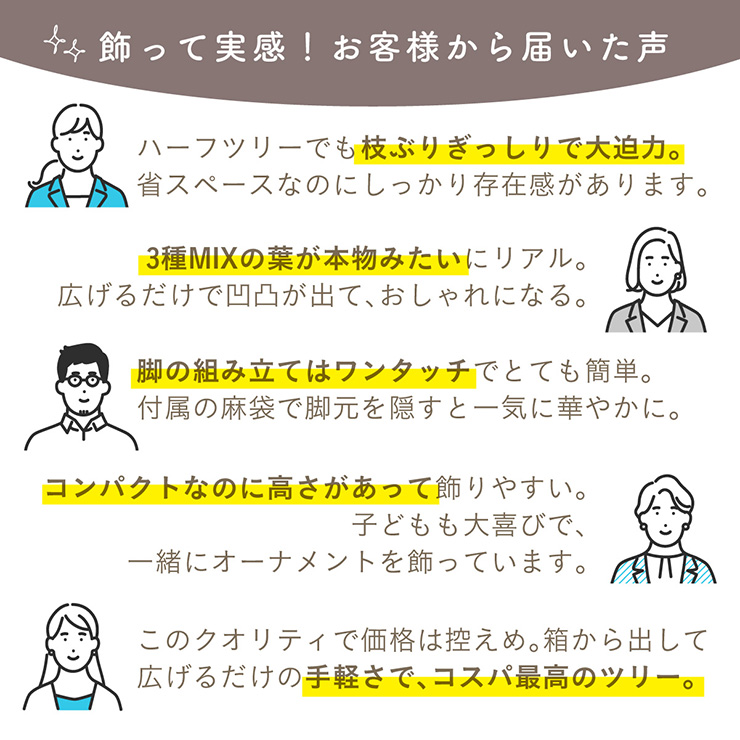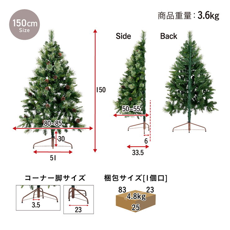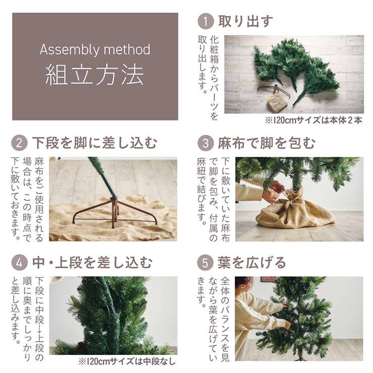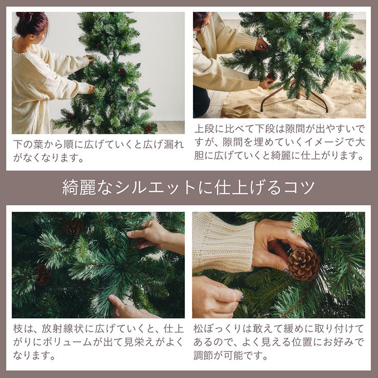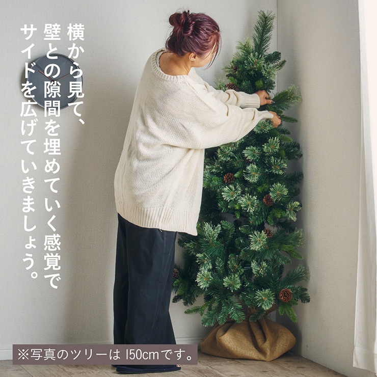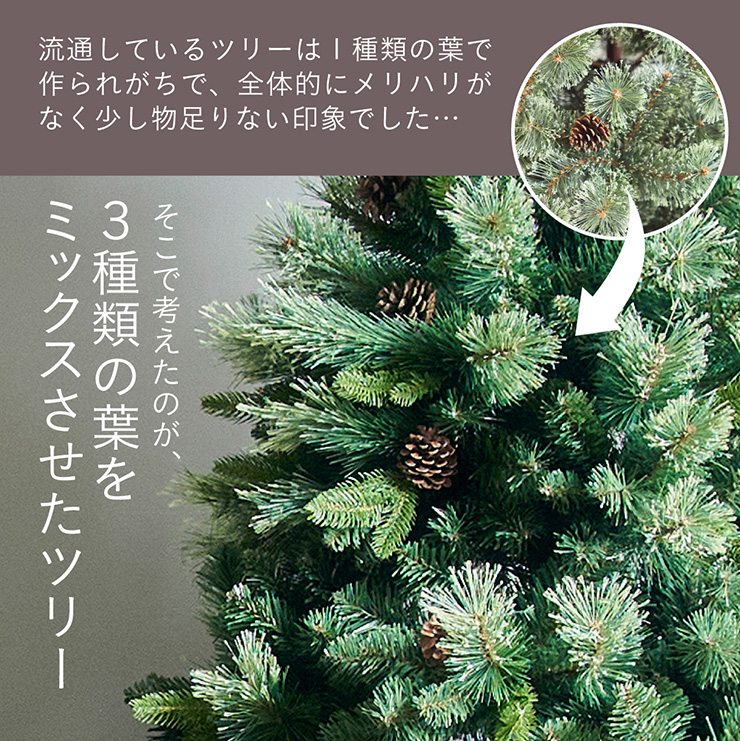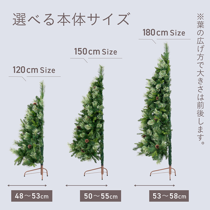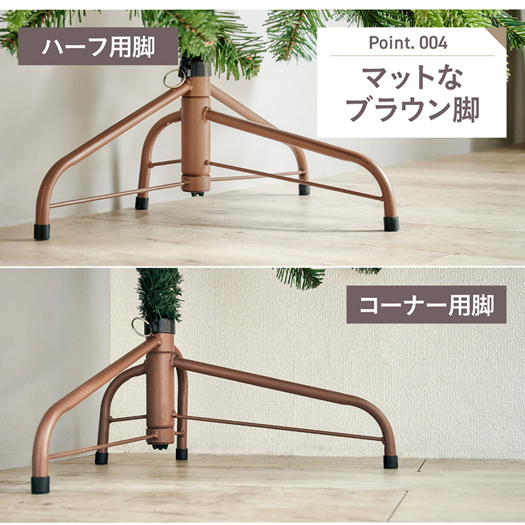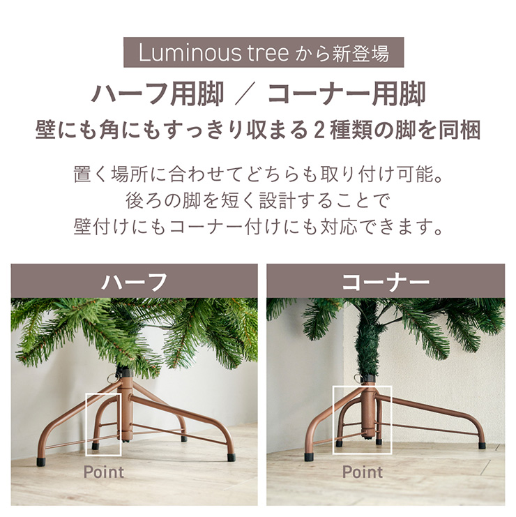 | Luminous tree(ルミナスツリー) 2wayツリー 3サイズ対応 ハーフ用脚/コーナー用脚 壁にも角にもスッキリ収まる2種類の脚を同梱 置く場所に合わせてどちらも取り付け可能。後ろの脚を短く設計することで壁付けにもコーナー付けにも対応できます。 ■こだわりの3種MIXの葉で唯一無二のボリューム感 ■リアルな葉先 ■天然の松ぼっくり ■葉で覆われた支柱 ■マットなブラウン脚 ■簡単組み立て ※こちらの商品はお客様組み立てとなります。 ※組み立て方や若干の個体差によって、表示サイズと完成形のサイズに多少の誤差が生じる場合がございます。予めご了承ください。 | |