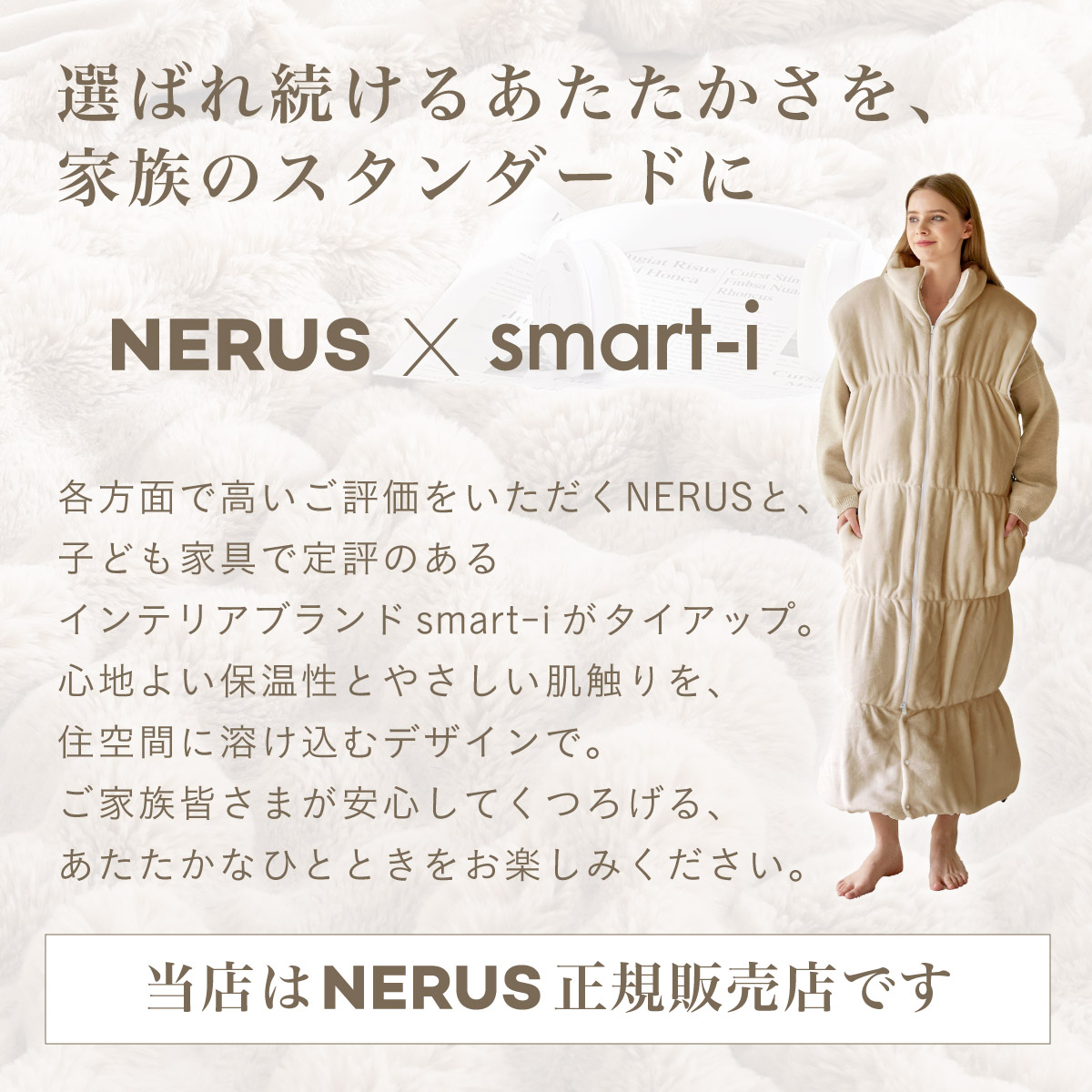 | 【NERUS×smart-i】吸湿・発熱 4way大人の着る毛布 Manon(マノン) 選ばれ続けるあたたかさを、家族のスタンダードに 各方面で高いご評価をいただくNERUSと、 子ども家具で定評のあるインテリアブランド smart-i がタイアップ。 心地よい保温性とやさしい肌触りを、住空間に溶け込むデザインで。 ご家族皆様が安心してくつろげる、あたたかなひとときをお楽しみください。 ■冬のパチッを防ぐ静電気防止加工済み 乾燥が気になる季節に嬉しい、静電気加工済み。 ほこりの引き寄せも軽減してくれます。 ■腕を動かしやすいノースリーブ 袖がないから、デスクワークや読書も快適に。 ■首元ぽかぽかハイネック 冷たい風から首を守り、じんわりあたためます。 ■簡単ファスナー開閉 前開きタイプで着脱が簡単。 誰でも使いやすい設計です。 ■足元までしっかり防寒 裾コードを締めれば、床からの冷気も入れません。 ■寝袋スタイルにもチェンジ 袖口を閉じると、全身をすっぽり包む寝袋スタイルに。 ■クッションとして使える たたんで入れれば、おしゃれなクッションに変身 ■手もあたたかポケット 中ふかふかのポケットで、冷えた指先もほっと一息 ■丸洗いできて清潔 洗濯機で丸ごと洗えて、毎日清潔に使えます。 ※開封時に毛が出てくることがありますが、生産時のカットで付着した浮き毛です。 ※生地の構成上、毛が抜ける事がありますが抜かないでください。 ※アレルギー等が気になる方はご購入をお控えください。 ※直射日光の当たる場所・高温多湿な場所・火気の近くでのご使用・保管は避け、風通しの良い場所でご使用ください。 ※商品の開封直後に、においが気になる場合は風通しの良い日陰でしばらく陰干ししてください。 ※湿ったまま放置するとカビの原因となりますのでご注意ください。 ※商品写真はできる限り実物の色に近づけておりますが、お使いのモニター環境、照明、製造ロット等により実際の商品と若干色味が異なる場合がございますので予めご了承ください。 ※計測方法や製造ロットによりサイズに誤差が生じる場合があります。 ※商品到着後すぐに開封し、商品に不具合等ないかご確認ください。 ※納品書・領収書は同梱いたしません。領収書はご注文履歴より発行をお願い致します。 ※デザイン、仕様、外観、価格は予告なく変更となる場合があります。 | |