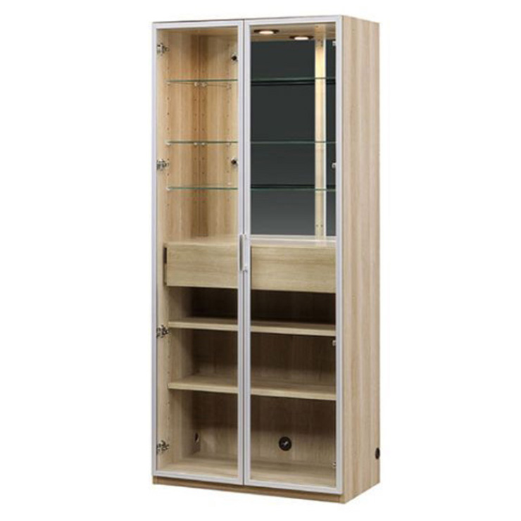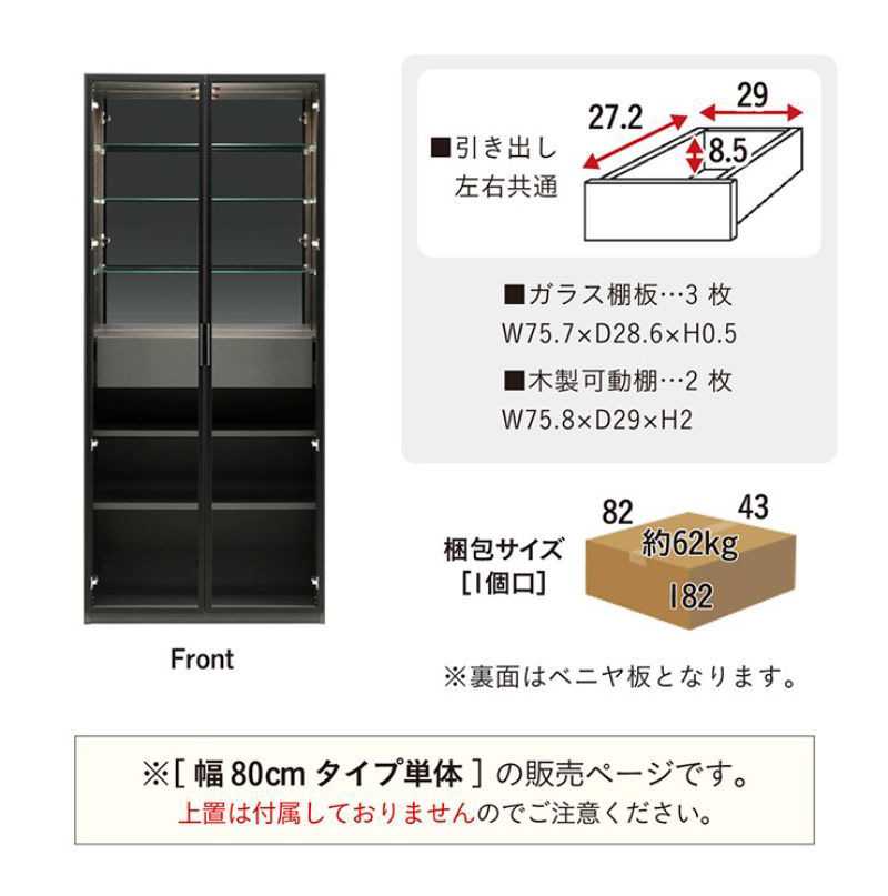 | サイズ | 全体:約W80 x D41 x H180cm(重量:約61kg) 引き出し:約W29 x D27.2 x H8.5cm ガラス板(3枚):約W75.7 x D28.6 x H0.5cm 木製可動棚(2枚):約W75.8 x D29 x H2cm 梱包サイズ:約82 x 43 x 182cm(重量:約62kg) |