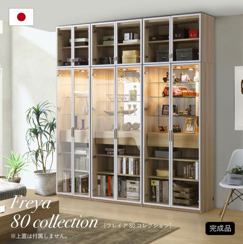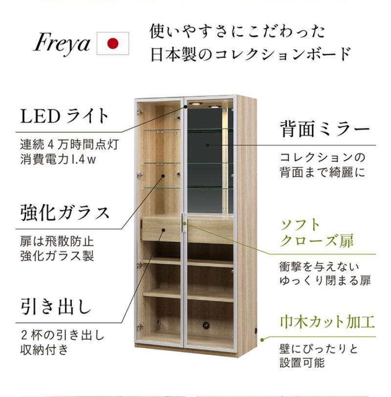 | コレクションボード 幅80cm Freya(フレイア) 使いやすさにこだわった日本製のコレクションボード ■LEDライト(連続4万時間点灯 消費電力1.4W) ■扉は飛散防止強化ガラス製 ■2杯の引出し収納付き ■背面ミラーでコレクションの背面まで綺麗に ■衝撃を与えないゆっくり閉まるソフトクローズ扉 ■巾木カット加工で壁にぴったりと設置可能 ■耐震棚ダボ付き ■配線穴付き ■安心のF☆☆☆☆(エフフォースター)ホルムアルデヒド等級の最上位規格 ※こちらの商品は完成品となります。 ※【幅80cmタイプ単体】の販売ページです。上置は付属しておりませんのでご注意ください。 ※裏面はベニヤ板となります。 | |