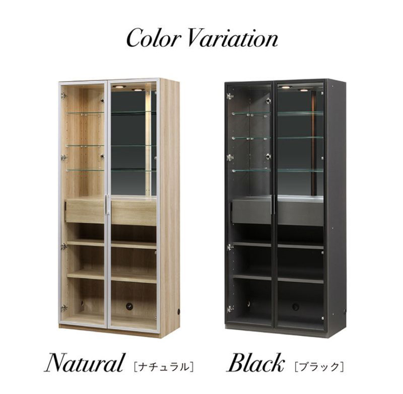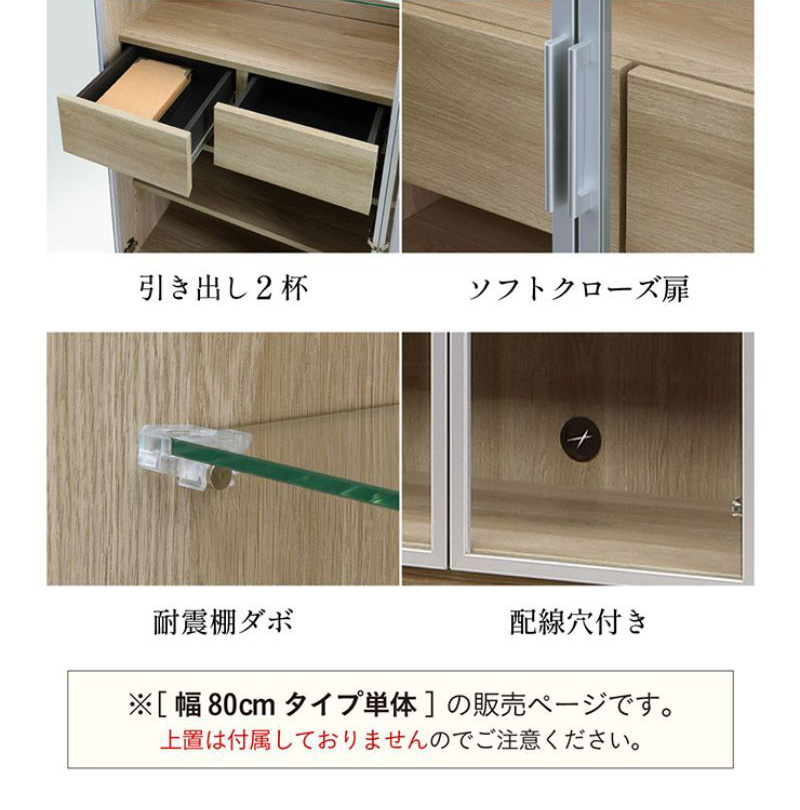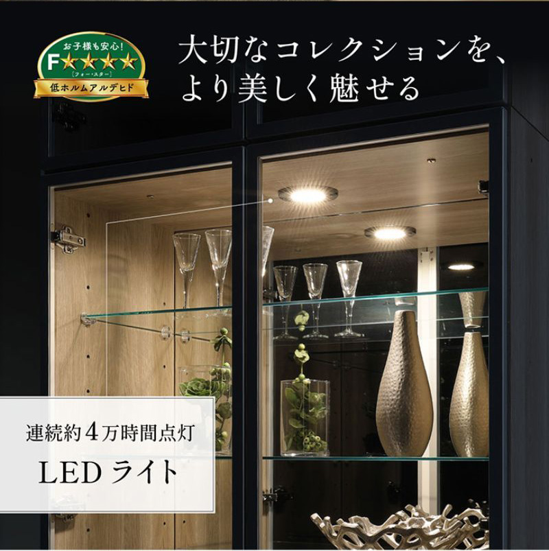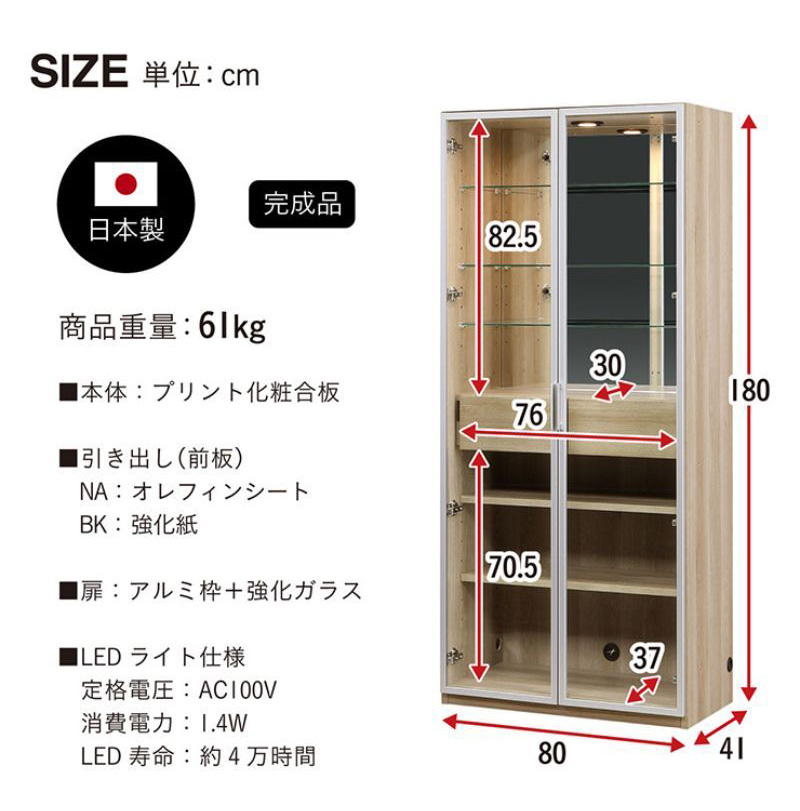 | 材質 | 本体:プリント化粧板 引き出し(前板):オレフィンシート(NA)・強化紙(BK) 扉:アルミ枠・強化ガラス LEDライト仕様:定格電圧(AC100V)・消費電力(1.4W)・LED寿命(約4万時間) |