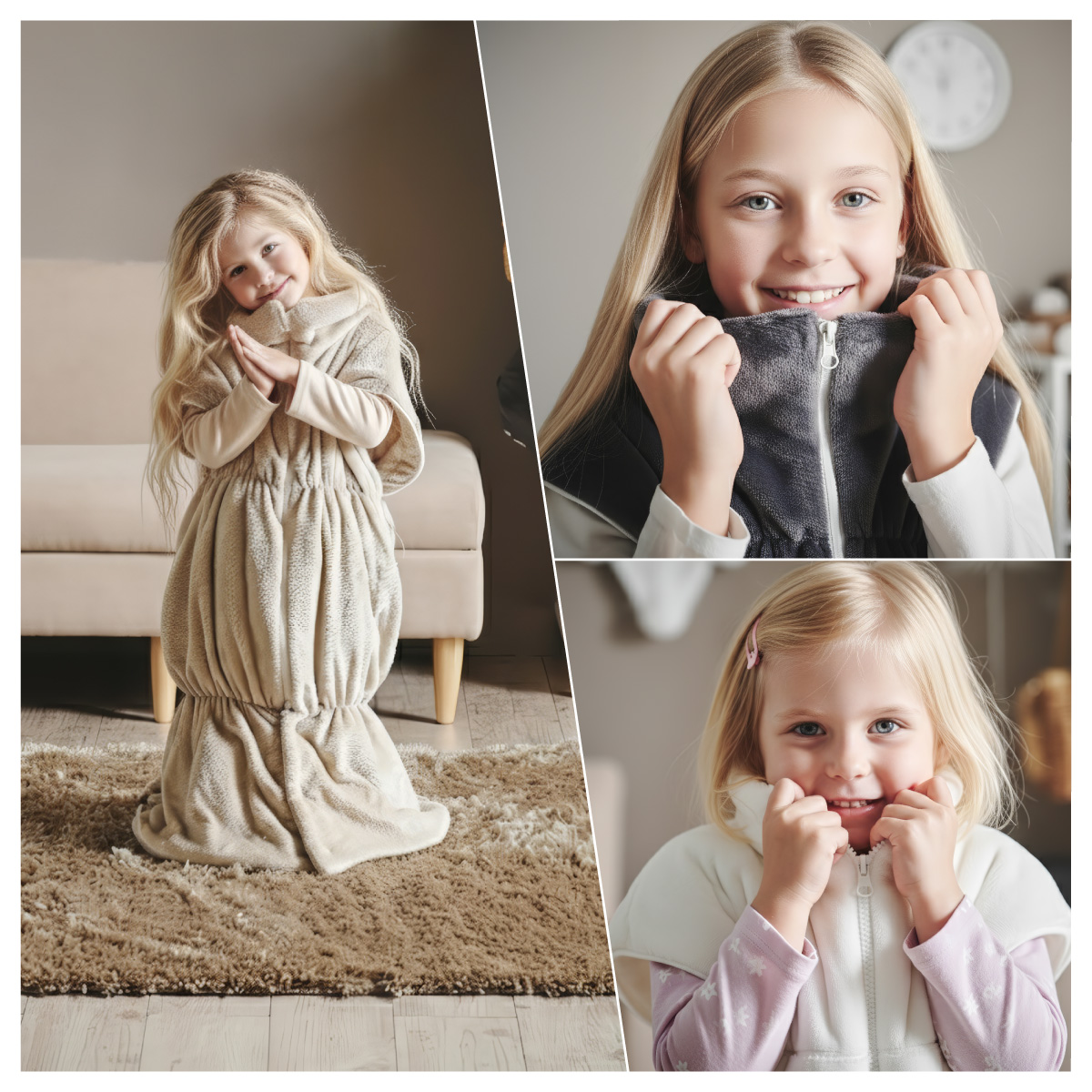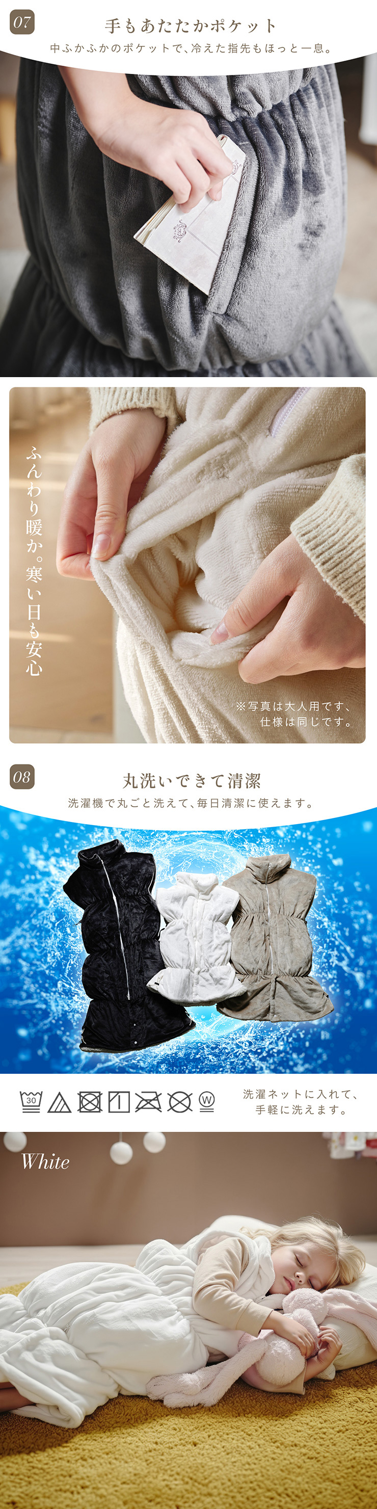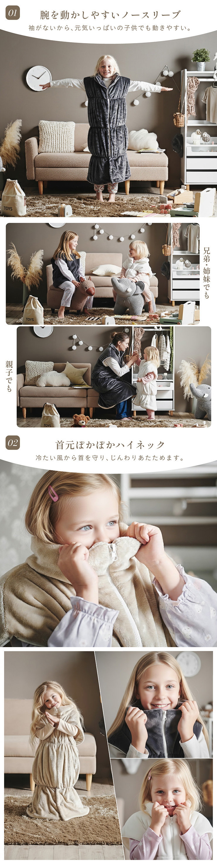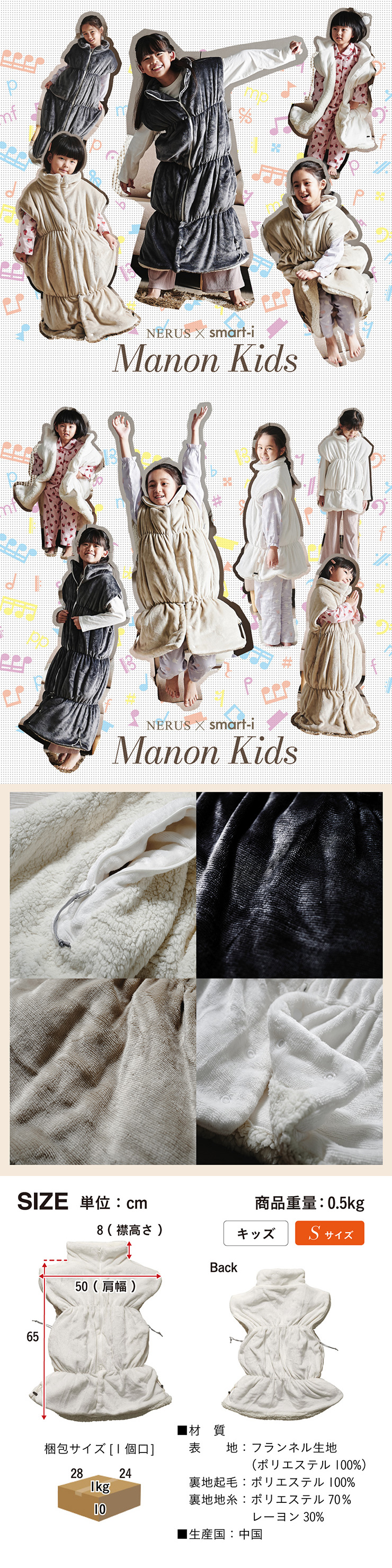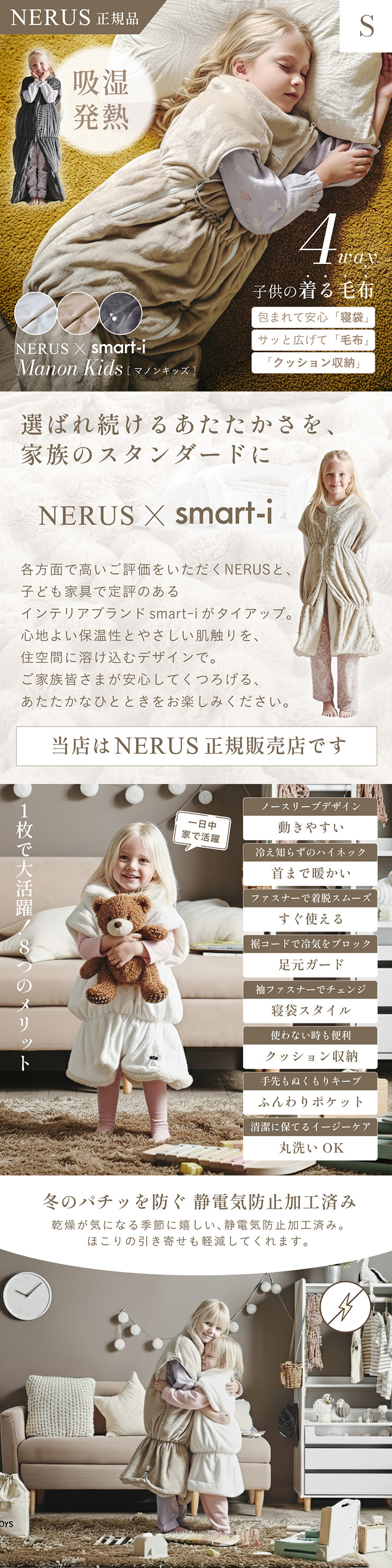 【NERUS×smart-i】吸湿・発熱 4way子供の着る毛布 Manon Kids(マノンキッズ) 選ばれ続けるあたたかさを、家族のスタンダードに 各方面で高いご評価をいただくNERUSと、 子ども家具で定評のあるインテリアブランド smart-i がタイアップ。 心地よい保温性とやさしい肌触りを、住空間に溶け込むデザインで。 ご家族皆様が安心してくつろげる、あたたかなひとときをお楽しみください。 ■冬のパチッを防ぐ静電気防止加工済み 乾燥が気になる季節に嬉しい、静電気加工済み。 ほこりの引き寄せも軽減してくれます。 ■腕を動かしやすいノースリーブ 袖がないから、デスクワークや読書も快適に。 ■首元ぽかぽかハイネック 冷たい風から首を守り、じんわりあたためます。 ■簡単ファスナー開閉 前開きタイプで着脱が簡単。 誰でも使いやすい設計です。 ■足元までしっかり防寒 裾コードを締めれば、床からの冷気も入れません。 ■寝袋スタイルにもチェンジ 袖口を閉じると、全身をすっぽり包む寝袋スタイルに。 ■クッションとして使える たたんで入れれば、おしゃれなクッションに変身 ■手もあたたかポケット 中ふかふかのポケットで、冷えた指先もほっと一息 ■丸洗いできて清潔 洗濯機で丸ごと洗えて、毎日清潔に使えます。 ※開封時に毛が出てくることがありますが、生産時のカットで付着した浮き毛です。 ※生地の構成上、毛が抜ける事がありますが抜かないでください。 ※アレルギー等が気になる方はご購入をお控えください。 ※直射日光の当たる場所・高温多湿な場所・火気の近くでのご使用・保管は避け、風通しの良い場所でご使用ください。 ※商品の開封直後に、においが気になる場合は風通しの良い日陰でしばらく陰干ししてください。 ※湿ったまま放置するとカビの原因となりますのでご注意ください。 ※商品写真はできる限り実物の色に近づけておりますが、お使いのモニター環境、照明、製造ロット等により実際の商品と若干色味が異なる場合がございますので予めご了承ください。 ※計測方法や製造ロットによりサイズに誤差が生じる場合があります。 ※商品到着後すぐに開封し、商品に不具合等ないかご確認ください。 ※納品書・領収書は同梱いたしません。領収書はご注文履歴より発行をお願い致します。 ※デザイン、仕様、外観、価格は予告なく変更となる場合があります。 | |