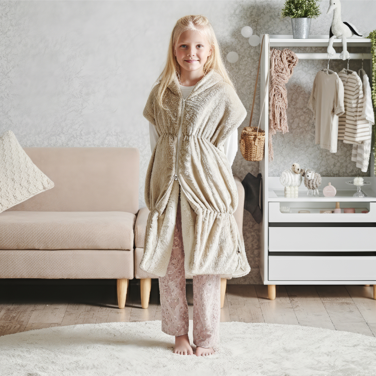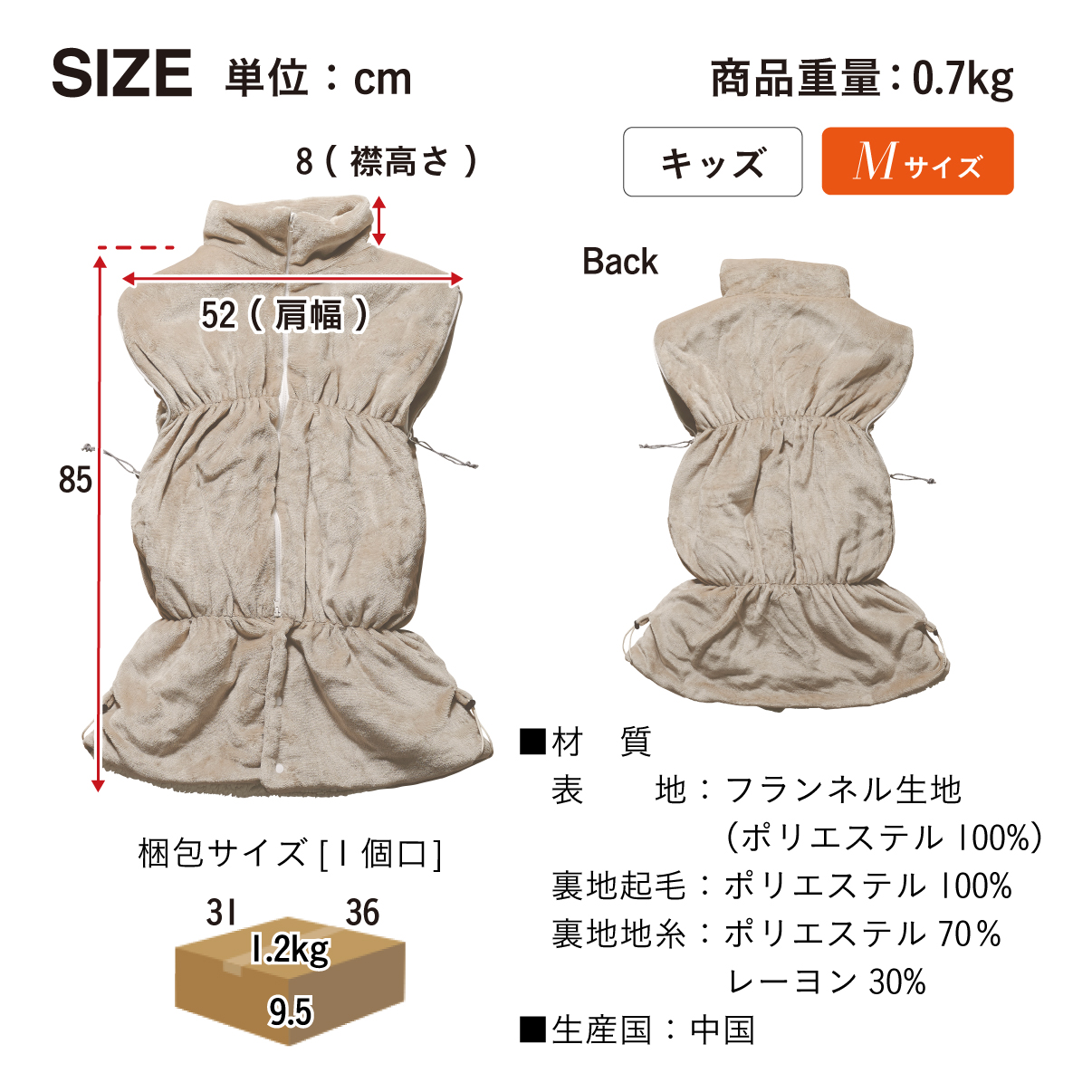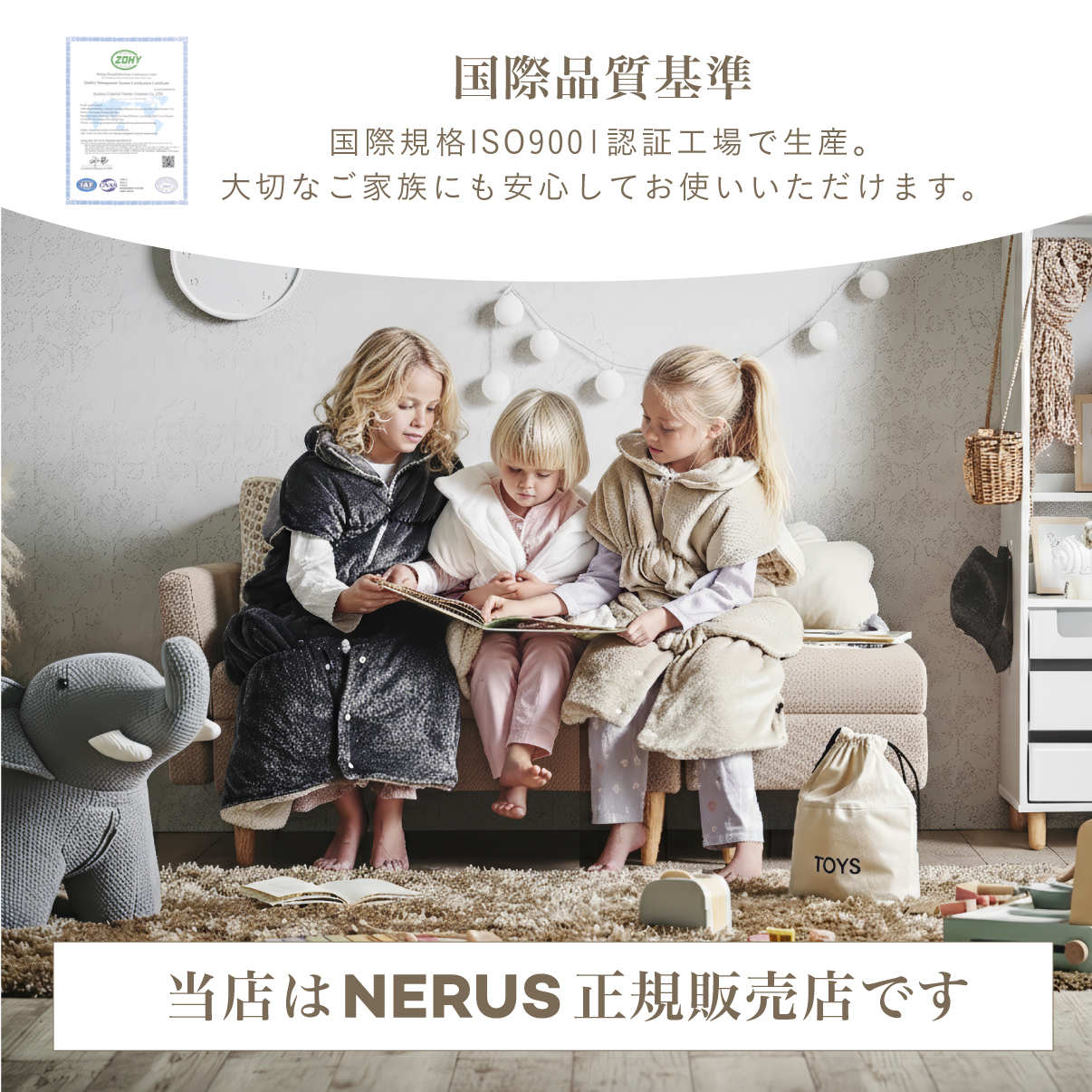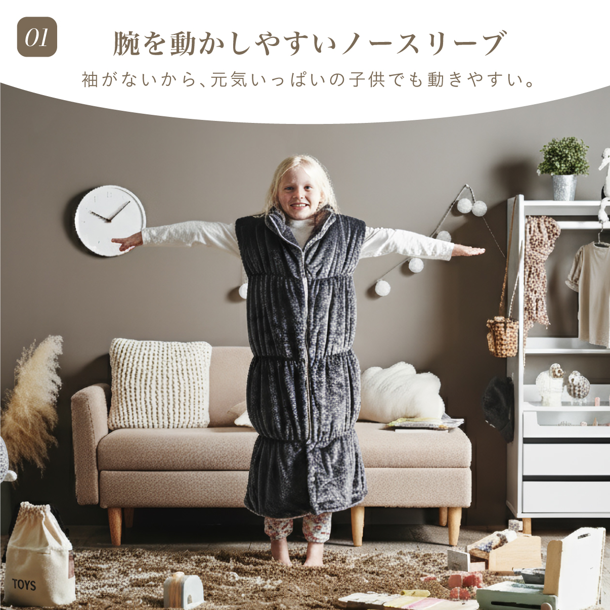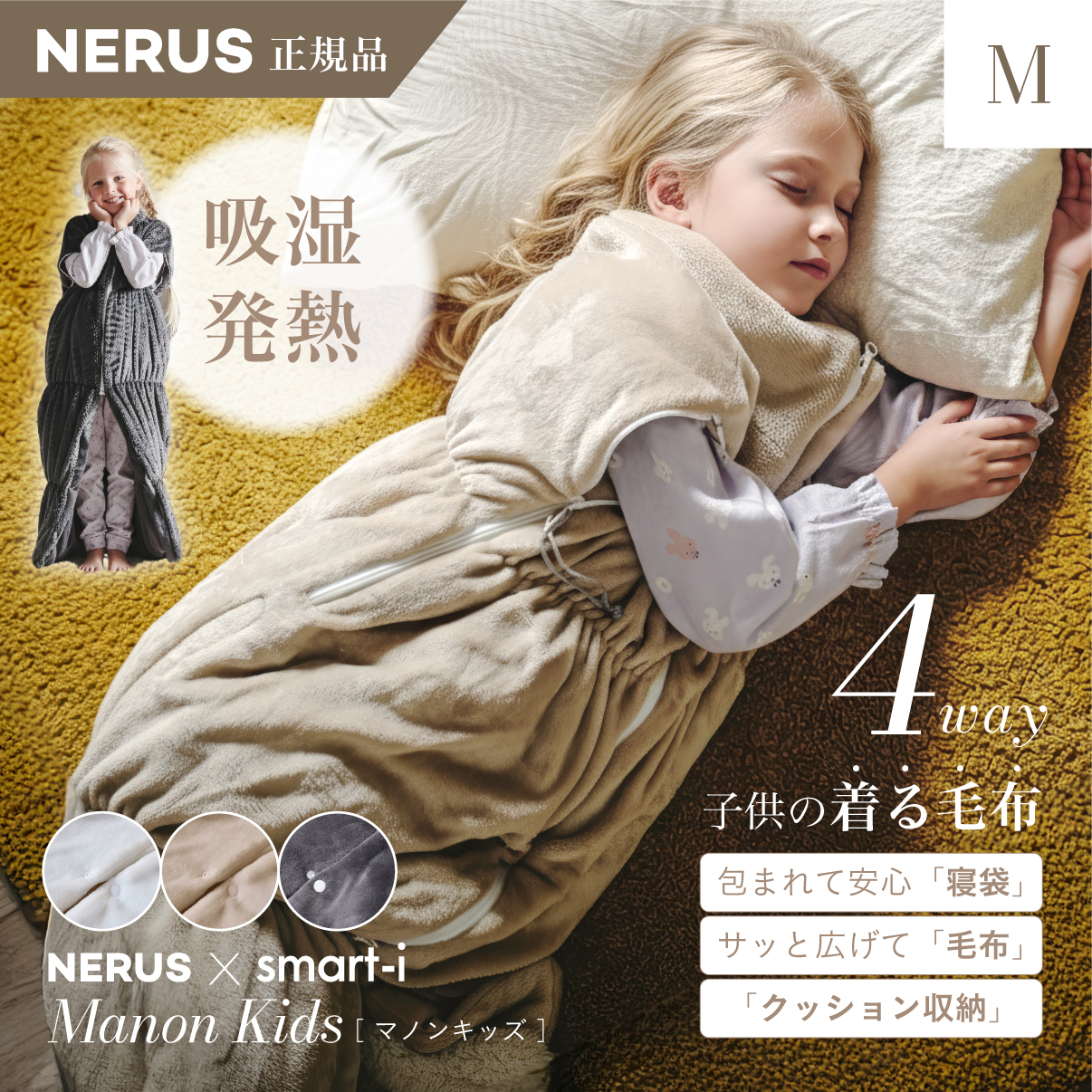 | 【NERUS×smart-i】吸湿・発熱 4way子供の着る毛布 Manon Kids(マノンキッズ) 選ばれ続けるあたたかさを、家族のスタンダードに 各方面で高いご評価をいただくNERUSと、 子ども家具で定評のあるインテリアブランド smart-i がタイアップ。 心地よい保温性とやさしい肌触りを、住空間に溶け込むデザインで。 ご家族皆様が安心してくつろげる、あたたかなひとときをお楽しみください。 ■冬のパチッを防ぐ静電気防止加工済み 乾燥が気になる季節に嬉しい、静電気加工済み。 ほこりの引き寄せも軽減してくれます。 ■腕を動かしやすいノースリーブ 袖がないから、デスクワークや読書も快適に。 ■首元ぽかぽかハイネック 冷たい風から首を守り、じんわりあたためます。 ■簡単ファスナー開閉 前開きタイプで着脱が簡単。 誰でも使いやすい設計です。 ■足元までしっかり防寒 裾コードを締めれば、床からの冷気も入れません。 ■寝袋スタイルにもチェンジ 袖口を閉じると、全身をすっぽり包む寝袋スタイルに。 ■クッションとして使える たたんで入れれば、おしゃれなクッションに変身 ■手もあたたかポケット 中ふかふかのポケットで、冷えた指先もほっと一息 ■丸洗いできて清潔 洗濯機で丸ごと洗えて、毎日清潔に使えます。 ※開封時に毛が出てくることがありますが、生産時のカットで付着した浮き毛です。 ※生地の構成上、毛が抜ける事がありますが抜かないでください。 ※アレルギー等が気になる方はご購入をお控えください。 ※直射日光の当たる場所・高温多湿な場所・火気の近くでのご使用・保管は避け、風通しの良い場所でご使用ください。 ※商品の開封直後に、においが気になる場合は風通しの良い日陰でしばらく陰干ししてください。 ※湿ったまま放置するとカビの原因となりますのでご注意ください。 ※商品写真はできる限り実物の色に近づけておりますが、お使いのモニター環境、照明、製造ロット等により実際の商品と若干色味が異なる場合がございますので予めご了承ください。 ※計測方法や製造ロットによりサイズに誤差が生じる場合があります。 ※商品到着後すぐに開封し、商品に不具合等ないかご確認ください。 ※納品書・領収書は同梱いたしません。領収書はご注文履歴より発行をお願い致します。 ※デザイン、仕様、外観、価格は予告なく変更となる場合があります。 | |