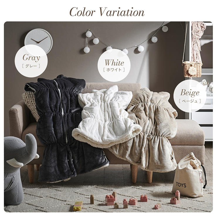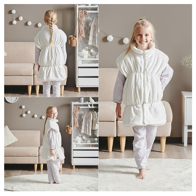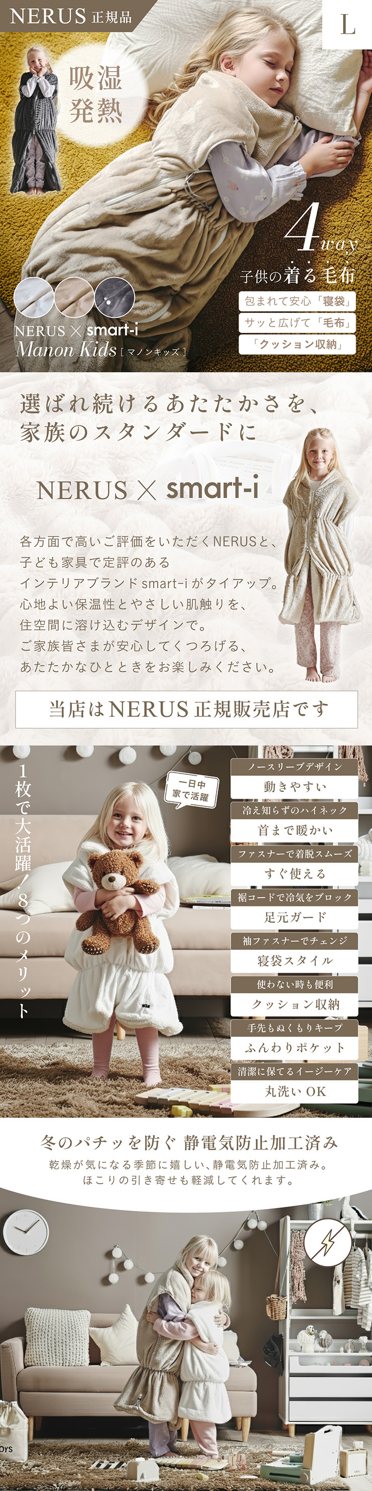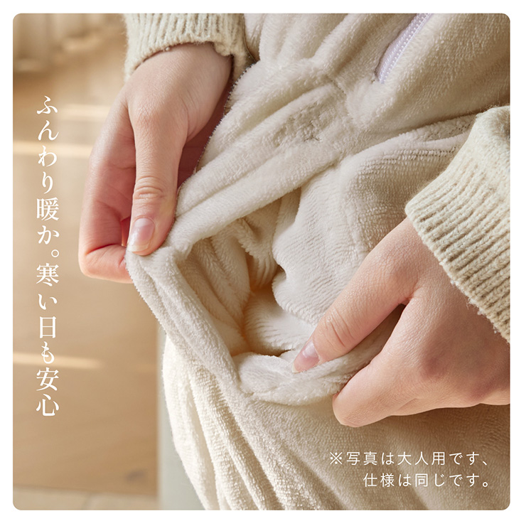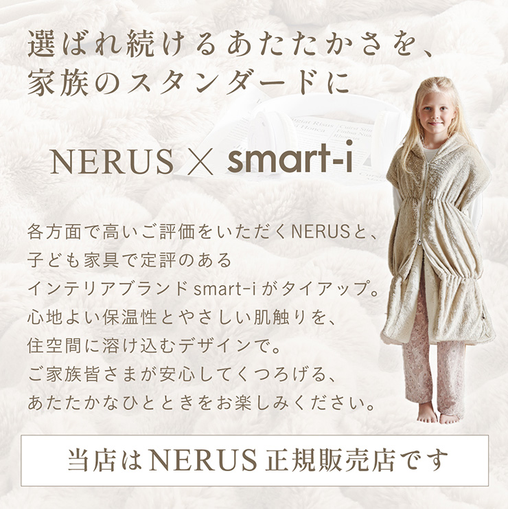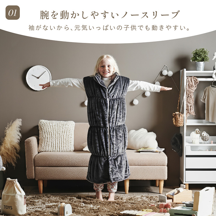 【NERUS×smart-i】吸湿・発熱 4way子供の着る毛布 Manon Kids(マノンキッズ) 選ばれ続けるあたたかさを、家族のスタンダードに 各方面で高いご評価をいただくNERUSと、 子ども家具で定評のあるインテリアブランド smart-i がタイアップ。 心地よい保温性とやさしい肌触りを、住空間に溶け込むデザインで。 ご家族皆様が安心してくつろげる、あたたかなひとときをお楽しみください。 ■冬のパチッを防ぐ静電気防止加工済み 乾燥が気になる季節に嬉しい、静電気加工済み。 ほこりの引き寄せも軽減してくれます。 ■腕を動かしやすいノースリーブ 袖がないから、デスクワークや読書も快適に。 ■首元ぽかぽかハイネック 冷たい風から首を守り、じんわりあたためます。 ■簡単ファスナー開閉 前開きタイプで着脱が簡単。 誰でも使いやすい設計です。 ■足元までしっかり防寒 裾コードを締めれば、床からの冷気も入れません。 ■寝袋スタイルにもチェンジ 袖口を閉じると、全身をすっぽり包む寝袋スタイルに。 ■クッションとして使える たたんで入れれば、おしゃれなクッションに変身 ■手もあたたかポケット 中ふかふかのポケットで、冷えた指先もほっと一息 ■丸洗いできて清潔 洗濯機で丸ごと洗えて、毎日清潔に使えます。 ※開封時に毛が出てくることがありますが、生産時のカットで付着した浮き毛です。 ※生地の構成上、毛が抜ける事がありますが抜かないでください。 ※アレルギー等が気になる方はご購入をお控えください。 ※直射日光の当たる場所・高温多湿な場所・火気の近くでのご使用・保管は避け、風通しの良い場所でご使用ください。 ※商品の開封直後に、においが気になる場合は風通しの良い日陰でしばらく陰干ししてください。 ※湿ったまま放置するとカビの原因となりますのでご注意ください。 ※商品写真はできる限り実物の色に近づけておりますが、お使いのモニター環境、照明、製造ロット等により実際の商品と若干色味が異なる場合がございますので予めご了承ください。 ※計測方法や製造ロットによりサイズに誤差が生じる場合があります。 ※商品到着後すぐに開封し、商品に不具合等ないかご確認ください。 ※納品書・領収書は同梱いたしません。領収書はご注文履歴より発行をお願い致します。 ※デザイン、仕様、外観、価格は予告なく変更となる場合があります。 | |