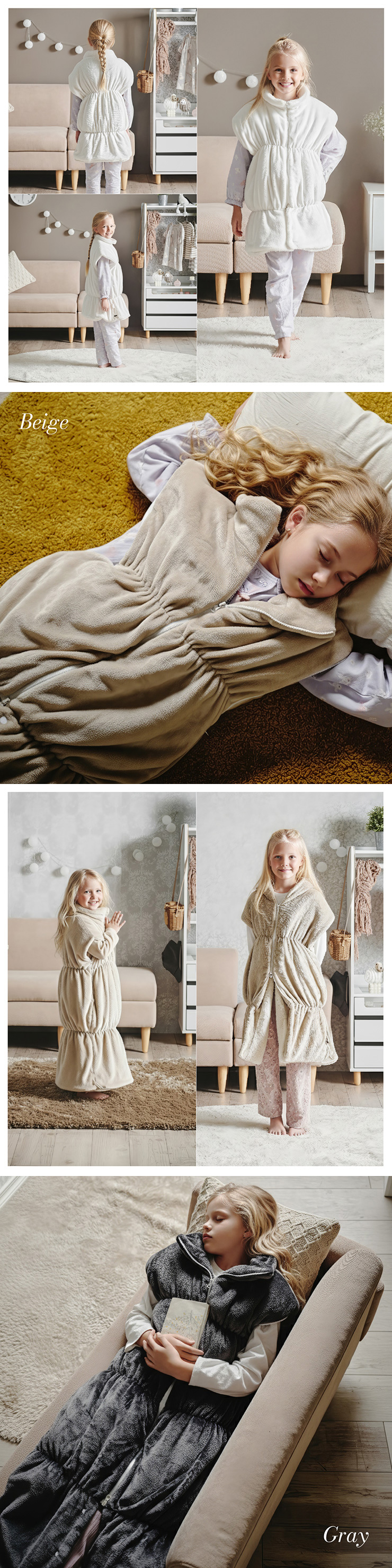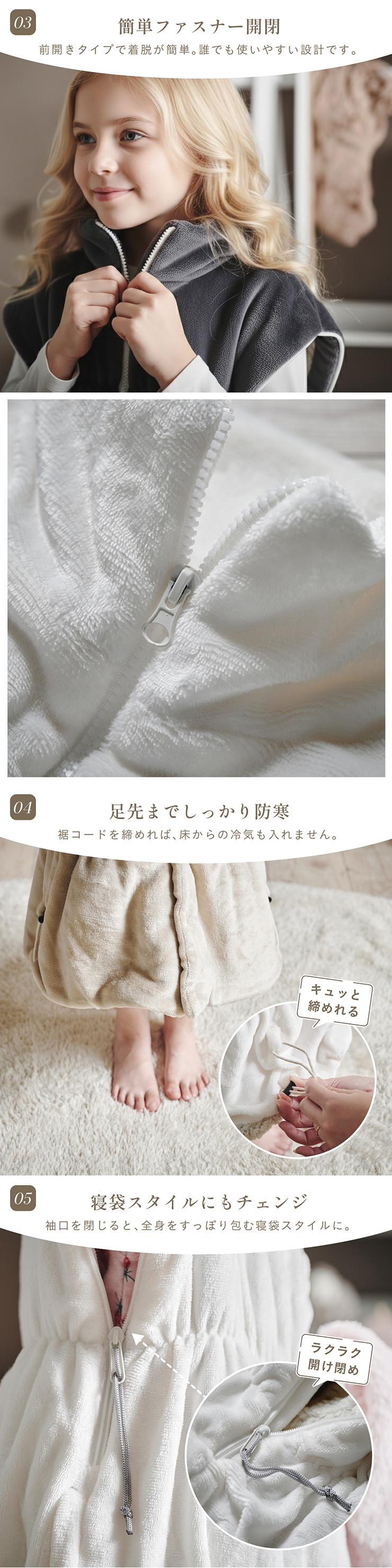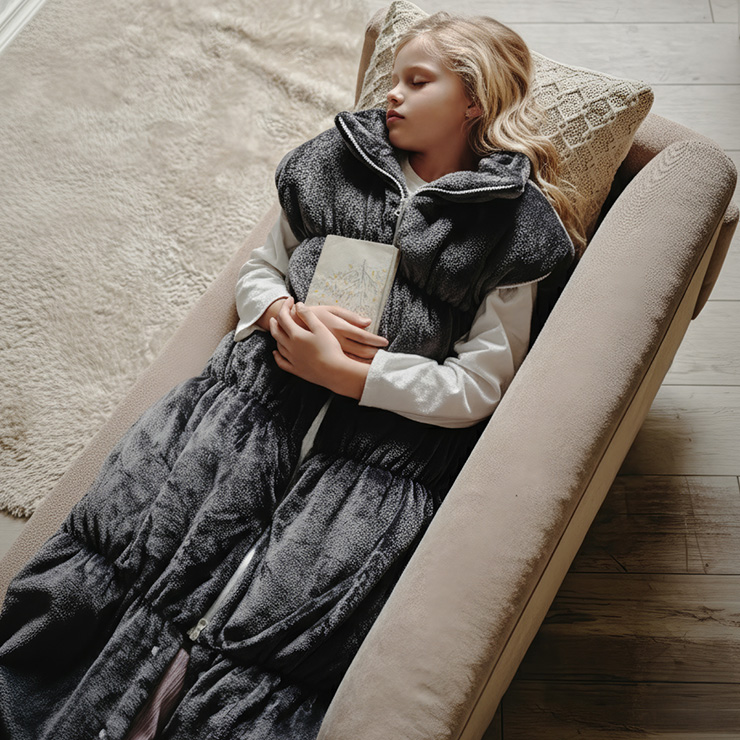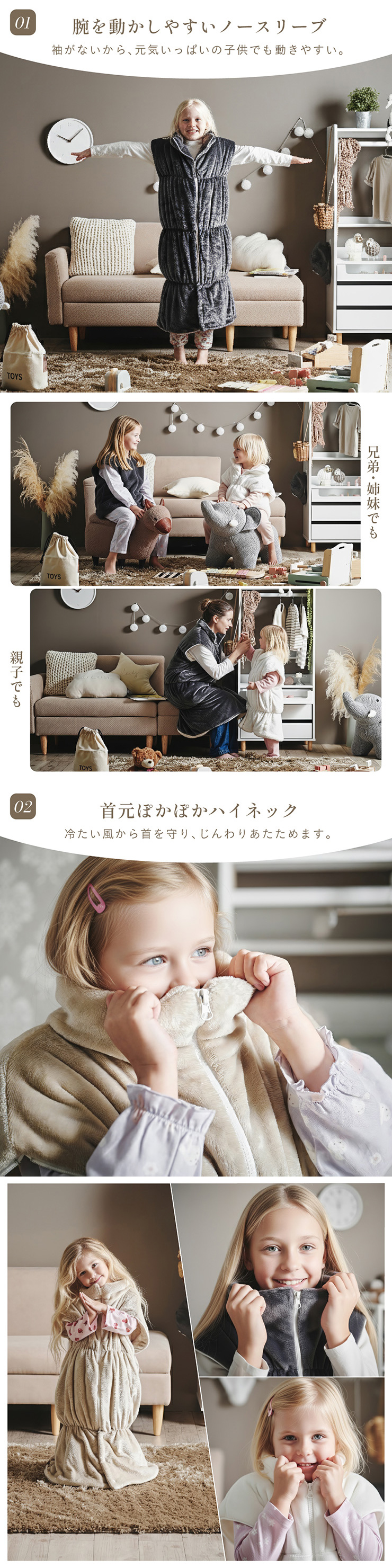 【NERUS×smart-i】吸湿・発熱 4way子供の着る毛布 Manon Kids(マノンキッズ) 選ばれ続けるあたたかさを、家族のスタンダードに 各方面で高いご評価をいただくNERUSと、 子ども家具で定評のあるインテリアブランド smart-i がタイアップ。 心地よい保温性とやさしい肌触りを、住空間に溶け込むデザインで。 ご家族皆様が安心してくつろげる、あたたかなひとときをお楽しみください。 ■冬のパチッを防ぐ静電気防止加工済み 乾燥が気になる季節に嬉しい、静電気加工済み。 ほこりの引き寄せも軽減してくれます。 ■腕を動かしやすいノースリーブ 袖がないから、デスクワークや読書も快適に。 ■首元ぽかぽかハイネック 冷たい風から首を守り、じんわりあたためます。 ■簡単ファスナー開閉 前開きタイプで着脱が簡単。 誰でも使いやすい設計です。 ■足元までしっかり防寒 裾コードを締めれば、床からの冷気も入れません。 ■寝袋スタイルにもチェンジ 袖口を閉じると、全身をすっぽり包む寝袋スタイルに。 ■クッションとして使える たたんで入れれば、おしゃれなクッションに変身 ■手もあたたかポケット 中ふかふかのポケットで、冷えた指先もほっと一息 ■丸洗いできて清潔 洗濯機で丸ごと洗えて、毎日清潔に使えます。 ※開封時に毛が出てくることがありますが、生産時のカットで付着した浮き毛です。 ※生地の構成上、毛が抜ける事がありますが抜かないでください。 ※アレルギー等が気になる方はご購入をお控えください。 ※直射日光の当たる場所・高温多湿な場所・火気の近くでのご使用・保管は避け、風通しの良い場所でご使用ください。 ※商品の開封直後に、においが気になる場合は風通しの良い日陰でしばらく陰干ししてください。 ※湿ったまま放置するとカビの原因となりますのでご注意ください。 ※商品写真はできる限り実物の色に近づけておりますが、お使いのモニター環境、照明、製造ロット等により実際の商品と若干色味が異なる場合がございますので予めご了承ください。 ※計測方法や製造ロットによりサイズに誤差が生じる場合があります。 ※商品到着後すぐに開封し、商品に不具合等ないかご確認ください。 ※納品書・領収書は同梱いたしません。領収書はご注文履歴より発行をお願い致します。 ※デザイン、仕様、外観、価格は予告なく変更となる場合があります。 | |