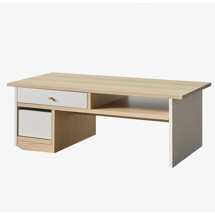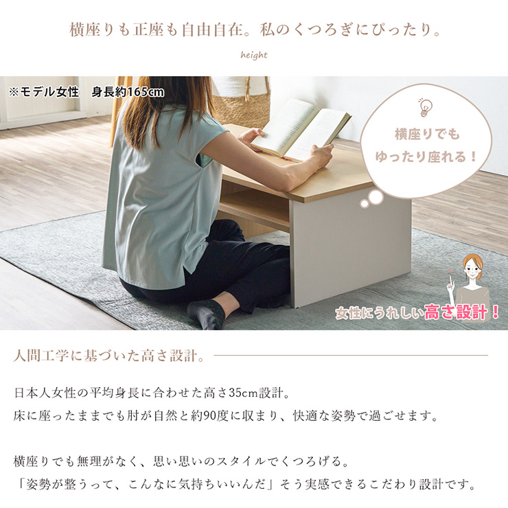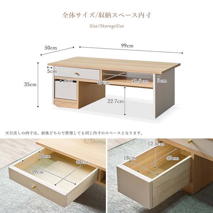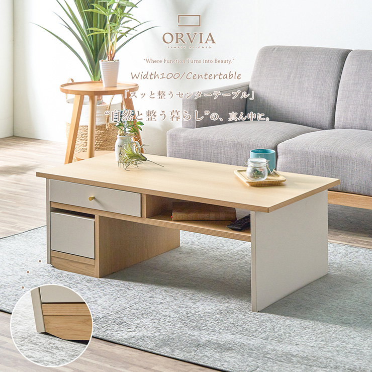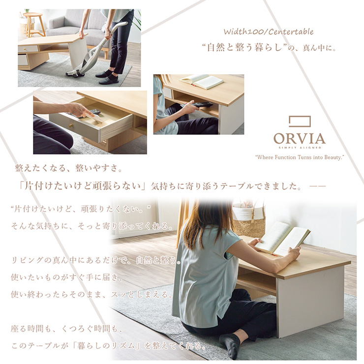 センターテーブル 完成品 幅99cm 「スッと整うセンターテーブル」 “自然と整う暮らし”の真ん中に。 整えたくなる、整えやすさ。「片づけたいけど頑張らない」気持ちに寄り添うテーブルができました。 ■スッと傾き、スッと動かせる 天板の側面には幅5cmの隙間があり、爪が長くても掴みやすく、ワンアクションで移動もラクラク! ■床に傷がつきにくいTPEキャスター使用 片側キャスター付きで、持ち上げるように片側を少し傾けるだけで移動が可能。掃除機をかけたい時もラクに持ち上げられ、力いらずでお部屋を清潔に保てます。 ■傾けやすいように片側の下部にはエッジ加工 持ち上げない限り、動いたり、傾いたりしません。 ■横座りも正座も自由自在。 日本人女性の平均身長に合わせた35cm設計。床に座ったままでも肘が自然と約90度に収まり、快適な姿勢で過ごせます。 ■サッと置ける、ちょい置きオープンスペース リモコンやティッシュ、読みかけの本など、そのまま置けてサッと手に取れるオープンスペース。前後どちらからでも取り出せます。 ■前後どちらも使える、気配り設計の引き出し収納 引き出しまで前後で引き出せる賢い収納設計に。便利な異なるサイズを2杯完備。引き出しは、強度と耐久性に優れたロッキング箱組仕様。 ■毎日使う場所だから、ラクして清潔に 天板と側面には、傷や汚れに強いメラミン化粧板を使用。水拭きだけでサッと汚れが落ちるから、お手入れも簡単。 ※こちらは完成品でのお届けとなります。 ※こちらは幅99cmセンターテーブルの単品ページです。ソファやラグ、小物などは付属しておりません。 ※引き出しの内寸は、前後どちらで使用しても同じ内寸のスペースとなります。 ※画面上のカラーはブラウザや設定により、実物とは若干異なる場合がございます。あらかじめご了承の上ご注文ください。 | |