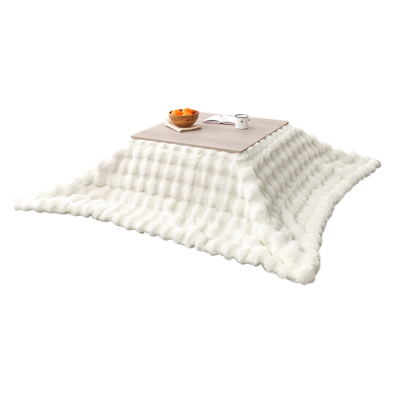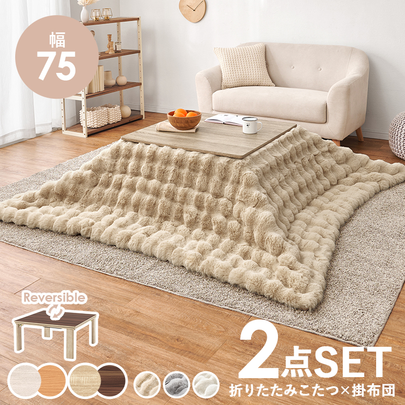 こたつ+うす掛け布団 2点セット KOT-7350-75ルナ シンプルなデザインで天板リバーシブル、収納に便利な折れ脚コタツ。ラビットファーのような、ふわもこの掛け布団セット ■KOT-7350-75 ・ワンルームにも置きやすい幅75cm ・持ち運びに便利な折りたたみ脚 ・裏表使えるリバーシブル天板 ・天板すべり止め ・エンボス加工シート ・ノコギリ跡も再現 ・中間スイッチ/石英管ヒーター ■Luna うさぎの毛並みを表現した「ラビットファー調」は、きめ細やかでうっとりするような、なめらかな肌ざわり。 ・繊維が抜けにくい構造で抜け毛が発生しにくくなっています。 ・贅沢な高密度パイルでボリューム感があり、なめらかな触り心地 ・中綿もしっかり詰め込み、薄掛け布団でも程よい厚み ・汚れても洗濯機で丸洗いできるからいつも清潔に使えます。 ・安心の低ホルム ・静電気防止加工で冬の乾燥シーズンも安心 ※お洗濯の際は、必ず洗濯ネットをご使用ください。 ※家庭用ドラム式洗濯機の場合、故障の恐れがございますのでご使用はお控えいただき、コインランドリーをご利用ください。 ※若干の個体差によって、サイズに多少の誤差が生じる場合がございます。 ※画面上のカラーはご使用ブラウザやモニターの設定により、実物とは若干異なる場合がございます。 | |