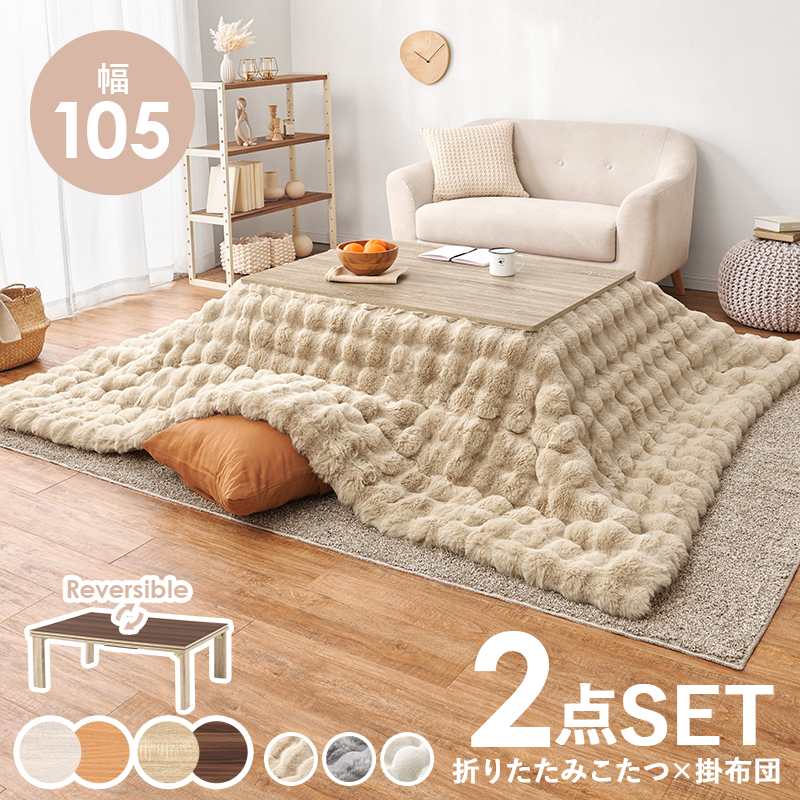 こたつ+うす掛け布団 2点セット KOT-7350-105ルナ シンプルなデザインで天板リバーシブル、収納に便利な折れ脚コタツ。ラビットファーのような、ふわもこの掛け布団セット ■KOT-7350-105 ・2~4人使いができるゆったりサイズ ・持ち運びに便利な折りたたみ脚 ・裏表使えるリバーシブル天板 ・天板すべり止め ・エンボス加工シート ・ノコギリ跡も再現 ・中間スイッチ/石英管ヒーター ■Luna うさぎの毛並みを表現した「ラビットファー調」は、きめ細やかでうっとりするような、なめらかな肌ざわり。 ・繊維が抜けにくい構造で抜け毛が発生しにくくなっています。 ・贅沢な高密度パイルでボリューム感があり、なめらかな触り心地 ・中綿もしっかり詰め込み、薄掛け布団でも程よい厚み ・汚れても洗濯機で丸洗いできるからいつも清潔に使えます。 ・安心の低ホルム ・静電気防止加工で冬の乾燥シーズンも安心 ※お洗濯の際は、必ず洗濯ネットをご使用ください。 ※家庭用ドラム式洗濯機の場合、故障の恐れがございますのでご使用はお控えいただき、コインランドリーをご利用ください。 ※若干の個体差によって、サイズに多少の誤差が生じる場合がございます。 ※画面上のカラーはご使用ブラウザやモニターの設定により、実物とは若干異なる場合がございます。 | |