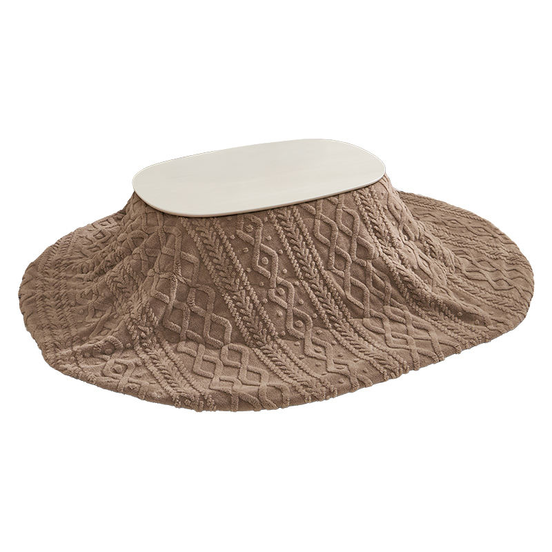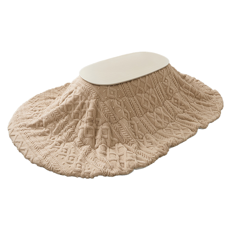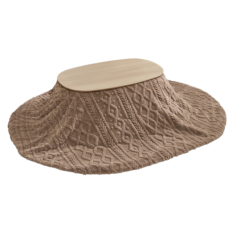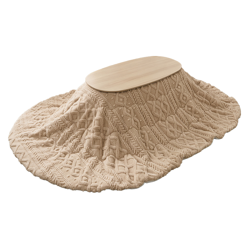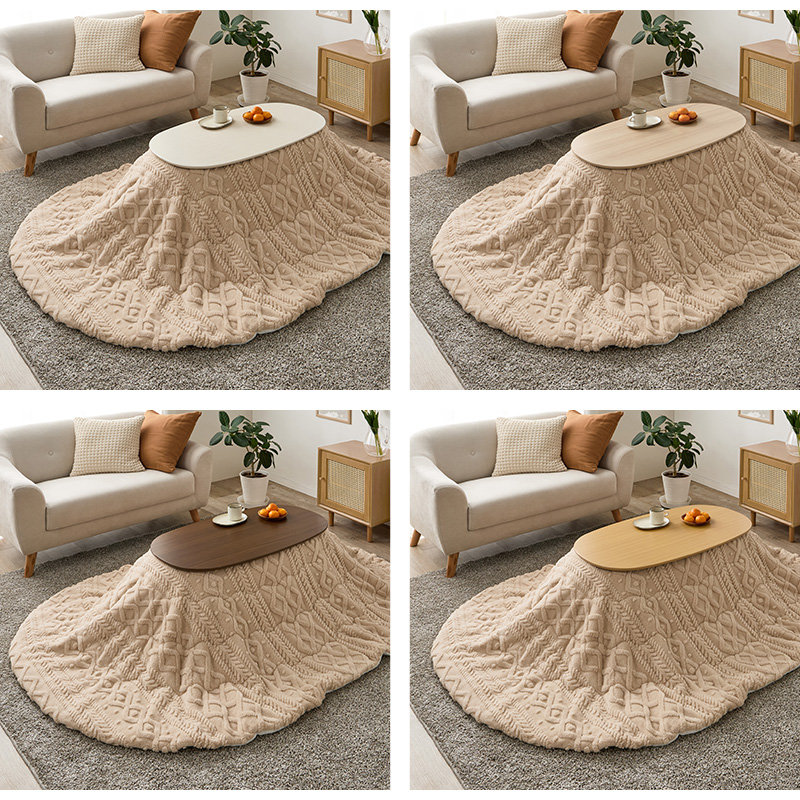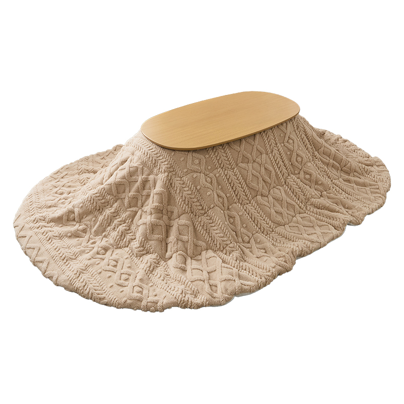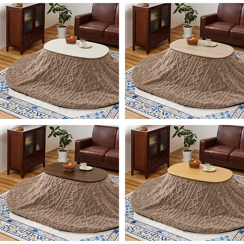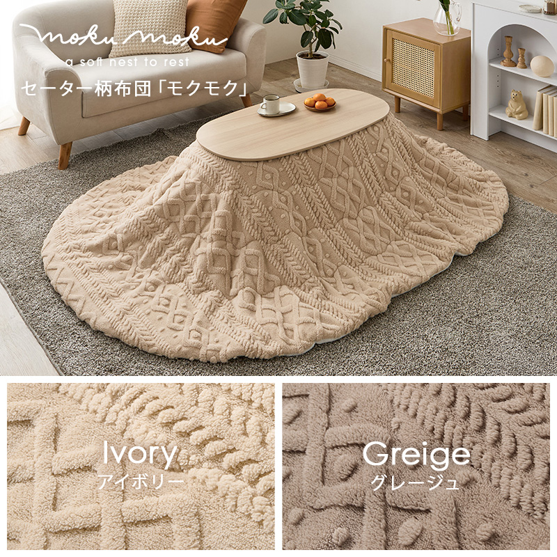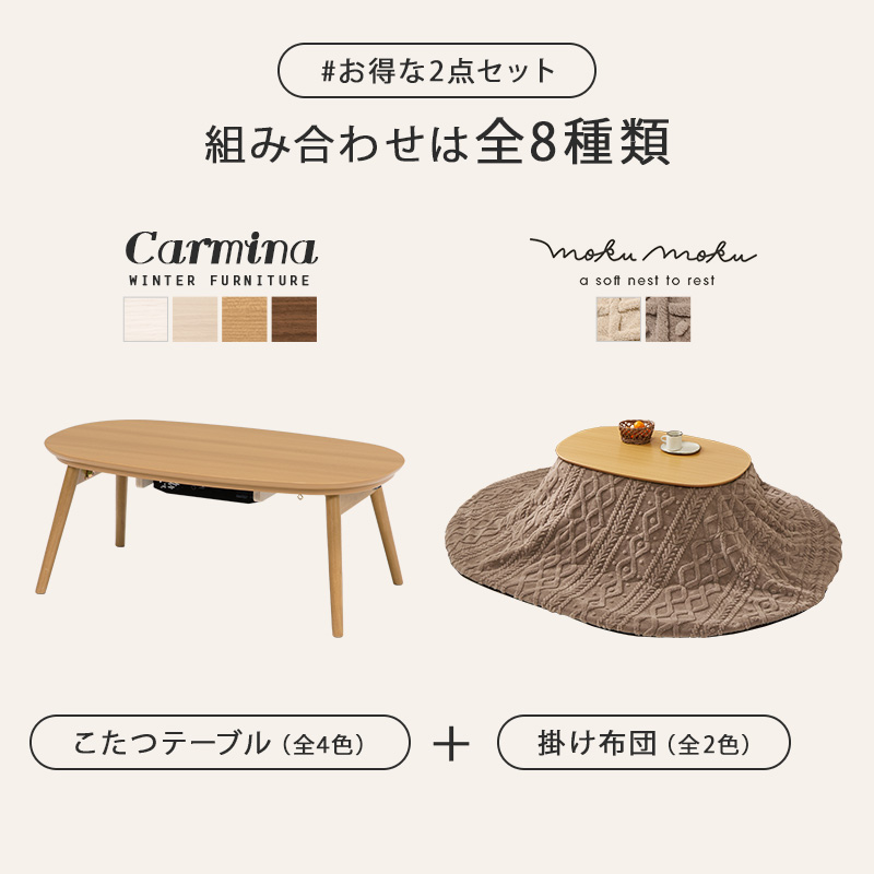 こたつ+うす掛け布団 2点セット カルミナモクモク 一人暮らしに最適なコンパクトサイズの折れ脚こたつテーブル。セーターのような立体的なデザインがおしゃれな掛け布団セット ■Carmina まるくて可愛いフォルムが特徴のオーバル型こたつ。ふんわりとした柔らかい印象のお部屋に。 ・コンパクトなサイズ感でワンルームにも置きやすいこたつです。 ・折りたたむと、厚み僅か10cmほどに。オフシーズンは収納しておくこともできます。 ・傷に強いUV加工 ・天板&布団ズレ防止 ・コードフック付き ・中間スイッチ/石英管ヒーター200W ■mokumoku ケーブルニットの凸凹を再現したジャガード織りのこたつ布団です。 ・毛足の長いボア生地でふんわり軽くて暖かい。 ・洗濯機で洗えるのでお手入れ簡単 ・安心の低ホルム ※お洗濯の際は、必ず洗濯ネットをご使用ください。 ※家庭用ドラム式洗濯機の場合、故障の恐れがございますのでご使用はお控えいただき、コインランドリーをご利用ください。 ※若干の個体差によって、サイズに多少の誤差が生じる場合がございます。 ※画面上のカラーはご使用ブラウザやモニターの設定により、実物とは若干異なる場合がございます。 | |