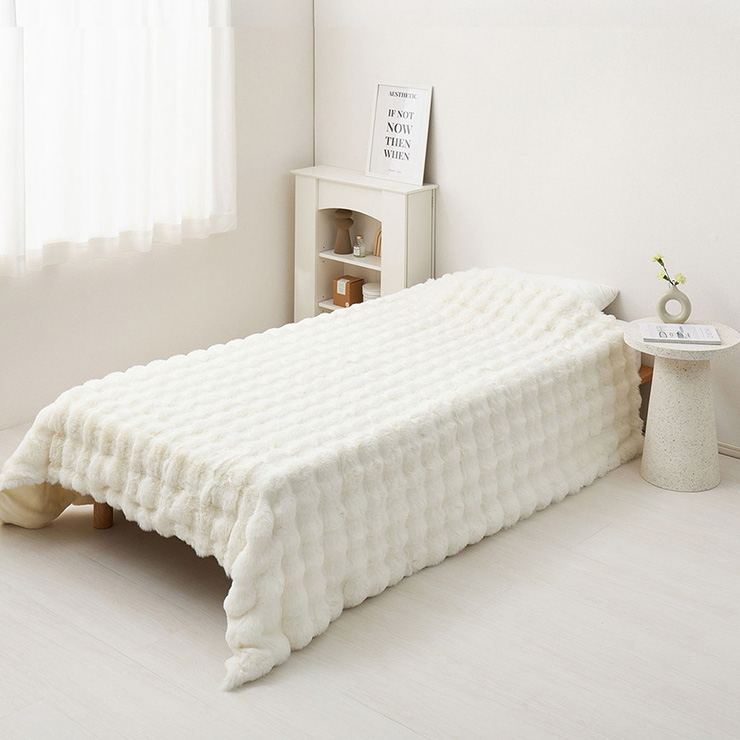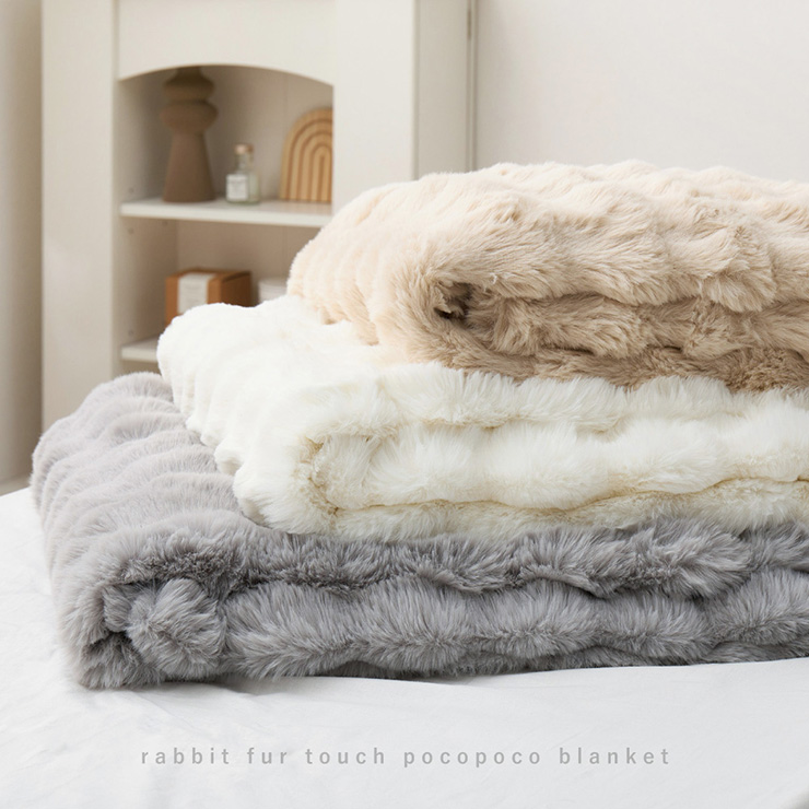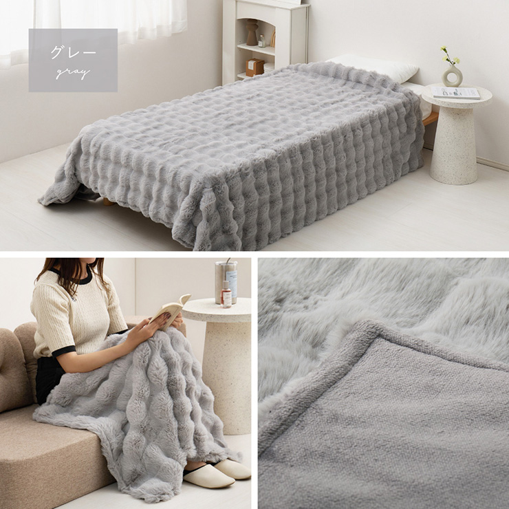ポコポコ毛布 約140×200cm ラビットファー調 ルナ うさぎの毛並みを表現した「ラビットファー調」は、きめ細やかでうっとりするような、なめらかな肌ざわり。やさしく包み込むようなふわふわタッチに、ぽこぽことした見た目も可愛いおしゃれな毛布です。 ■ぽこぽこ、ふわふわ、ふんわり贅沢な「ラビットファー調」 やさしく包み込むような、とろけるなめらかさのふわふわタッチ。ぽこぽことした、見た目も可愛いおしゃれな寝具です。ウサギの毛並みを表現した「ラビットファー調」で、きめ細かでうっとりするような、なめらかな肌触りです。 ■約3cmのロングパイル仕様 長毛のパイルでふんわり包み込まれるようなやわらかな感触に。また長い毛足が空気を多く含み、温かさを保ちます。 ・繊維が抜けにくい構造で抜け毛が発生しにくくなっています。 ・贅沢な高密度パイルでボリューム感があり、なめらかな触り心地 ・安心の低ホルム ■2枚合わせでしっかりあたたかい 内側にはなめらかタッチのフランネルを使用した合わせ毛布。2枚の生地の間に空気の層ができ、保温性にも優れています。 ■洗濯機で洗える 汚れても洗濯機で丸洗いできるからいつも清潔に使えます。 ■毛布と同色の収納袋付き 使わない時は袋に収納してクッションとしても使え、インテリアに溶け込んで、普段の置き場所にも困りません。 ※お洗濯の際は、必ず洗濯ネットをご使用ください。 ※家庭用ドラム式洗濯機の場合、故障の恐れがあございますのでご使用はお控えいただき、コインランドリーをご利用ください。 ※若干の個体差によって、サイズに多少の誤差が生じる場合がございます。 ※画面上のカラーはご使用ブラウザやモニターの設定により、実物とは若干異なる場合がございます。 ※画像で同シリーズのサイズ、形状違いを使用している場合がございます。商品サイズをご確認の上ご購入をお願いします。 | |