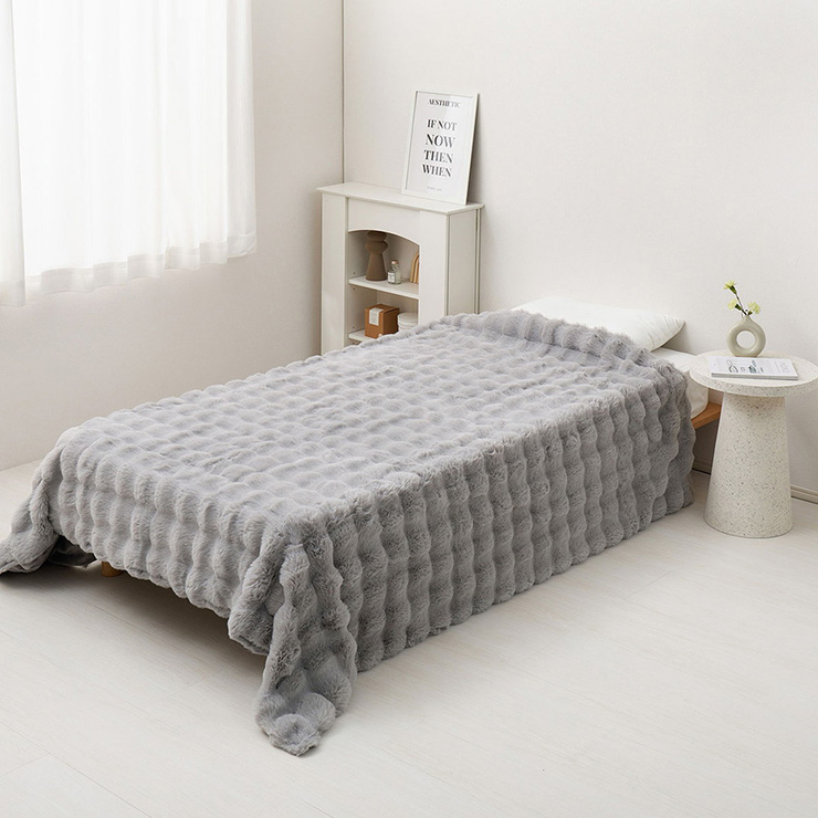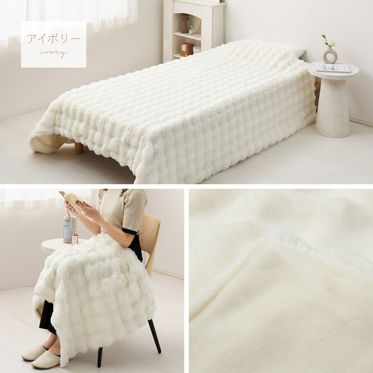 ポコポコ毛布 約160×200cm ラビットファー調 ルナ うさぎの毛並みを表現した「ラビットファー調」は、きめ細やかでうっとりするような、なめらかな肌ざわり。やさしく包み込むようなふわふわタッチに、ぽこぽことした見た目も可愛いおしゃれな毛布です。 ■ぽこぽこ、ふわふわ、ふんわり贅沢な「ラビットファー調」 やさしく包み込むような、とろけるなめらかさのふわふわタッチ。ぽこぽことした、見た目も可愛いおしゃれな寝具です。ウサギの毛並みを表現した「ラビットファー調」で、きめ細かでうっとりするような、なめらかな肌触りです。 ■約3cmのロングパイル仕様 長毛のパイルでふんわり包み込まれるようなやわらかな感触に。また長い毛足が空気を多く含み、温かさを保ちます。 ・繊維が抜けにくい構造で抜け毛が発生しにくくなっています。 ・贅沢な高密度パイルでボリューム感があり、なめらかな触り心地 ・安心の低ホルム ■2枚合わせでしっかりあたたかい 内側にはなめらかタッチのフランネルを使用した合わせ毛布。2枚の生地の間に空気の層ができ、保温性にも優れています。 ■洗濯機で洗える 汚れても洗濯機で丸洗いできるからいつも清潔に使えます。 ■毛布と同色の収納袋付き 使わない時は袋に収納してクッションとしても使え、インテリアに溶け込んで、普段の置き場所にも困りません。 ※お洗濯の際は、必ず洗濯ネットをご使用ください。 ※家庭用ドラム式洗濯機の場合、故障の恐れがあございますのでご使用はお控えいただき、コインランドリーをご利用ください。 ※若干の個体差によって、サイズに多少の誤差が生じる場合がございます。 ※画面上のカラーはご使用ブラウザやモニターの設定により、実物とは若干異なる場合がございます。 ※画像で同シリーズのサイズ、形状違いを使用している場合がございます。商品サイズをご確認の上ご購入をお願いします。 | |
