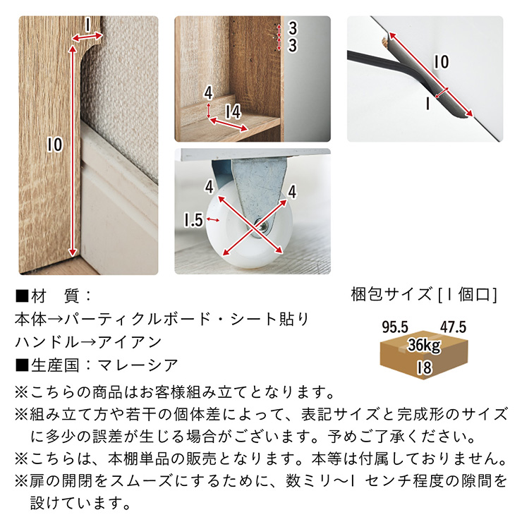 | スライド本棚 Millia(ミリア) ■スリムなのに驚きの収納力 60cmとスリム設計で、たくさんの本などを隠して収納が可能。スムーズに引き出せるように真っ直ぐ進む4つのキャスター付き。 ・コミック単行本なら約288冊(1台当たり 約96冊) ・物に合わせて調節できる可動棚 ・棚の前板はライフスタイルやお好みに合わせて着脱可能 ■左右どちらにも取り付けが可能な取っ手 設置場所や利き手に合わせて、お好みの向きに調節可能です。 ■圧迫感を感じさせない低めの設計 ・多機能な天板なので雑貨を飾るだけでなく、本などを埃や日焼けからガードしてくれます。 ・配線をスムーズにするコードスリット付き ・ストッパーがないので、ラック全体をスムーズに引き出すことができます。 ・パントリーとしても使用可能 ■detail ・取っ手 ・ネジ穴隠しシール付き ・巾木よけ ※こちらの商品はお客様組み立てとなります。 ※リアルな木目調シートを採用しております。木目や節・傷に見えるダメージ加工・ヴィンテージ加工などは全てシートデザインとなります。これらを理由とした返品・交換は行っておりませんので、予めご了承ください。 ※こちらは、本棚単品の販売となります。本などは付属しておりません。 ※扉の開閉をスムーズにするために、数ミリ~1センチ程度の隙間を設けています。 ※パントリーとしてご使用の際は、可動棚前板を取り付けてご使用ください。 ※組み立て方や若干の個体差によって、表記サイズと完成形のサイズに多少の誤差が生じる場合がございます。あらかじめご了承ください。 | |