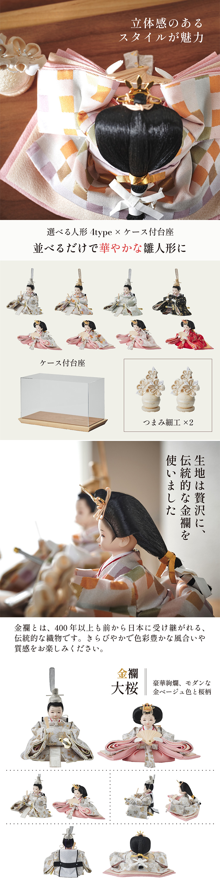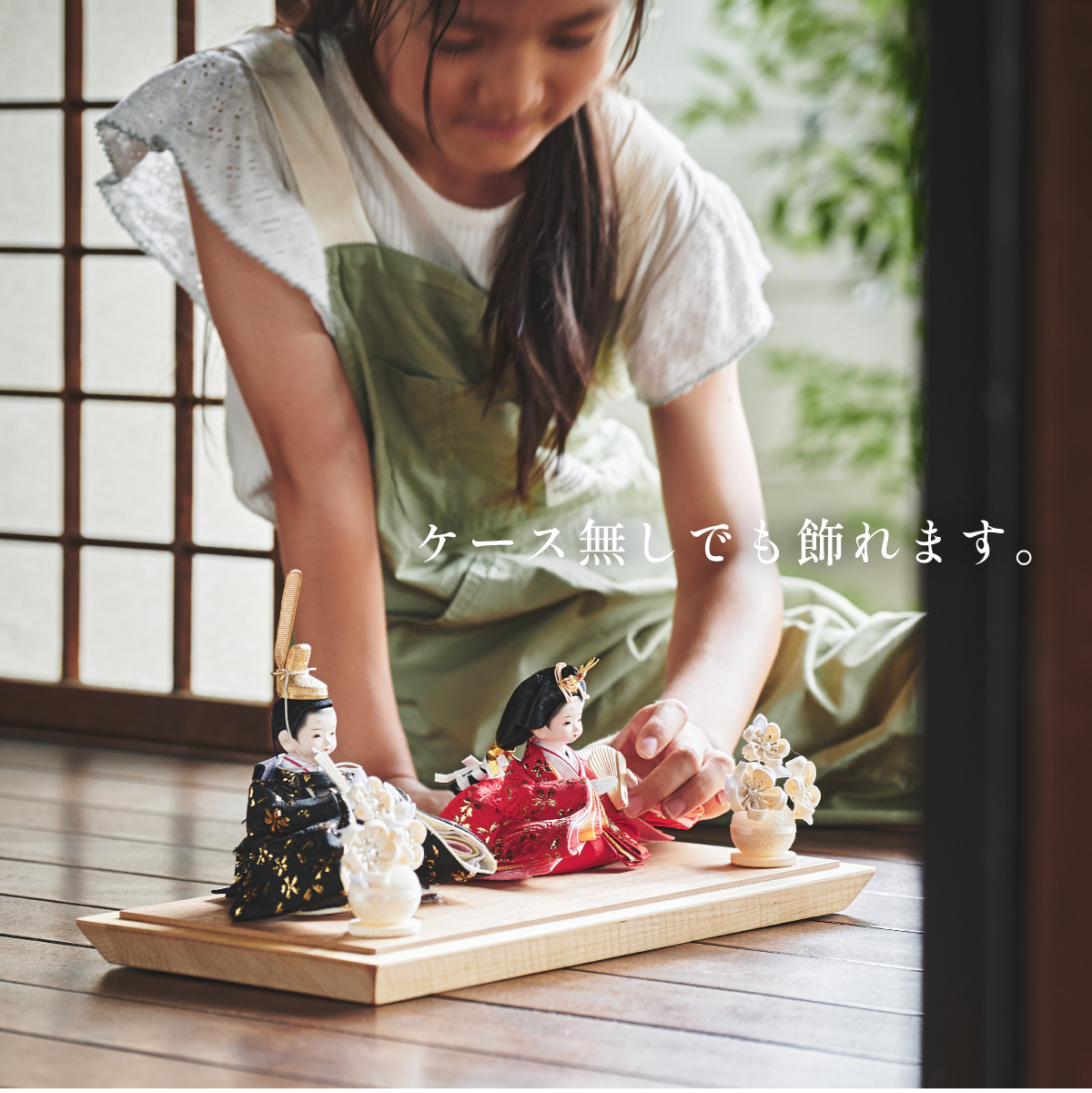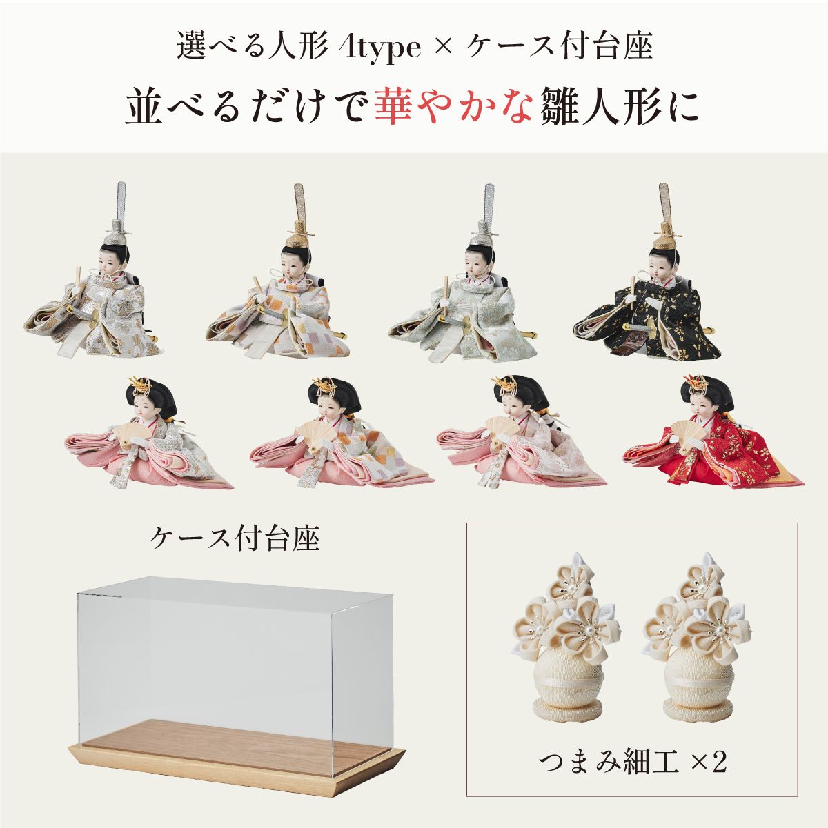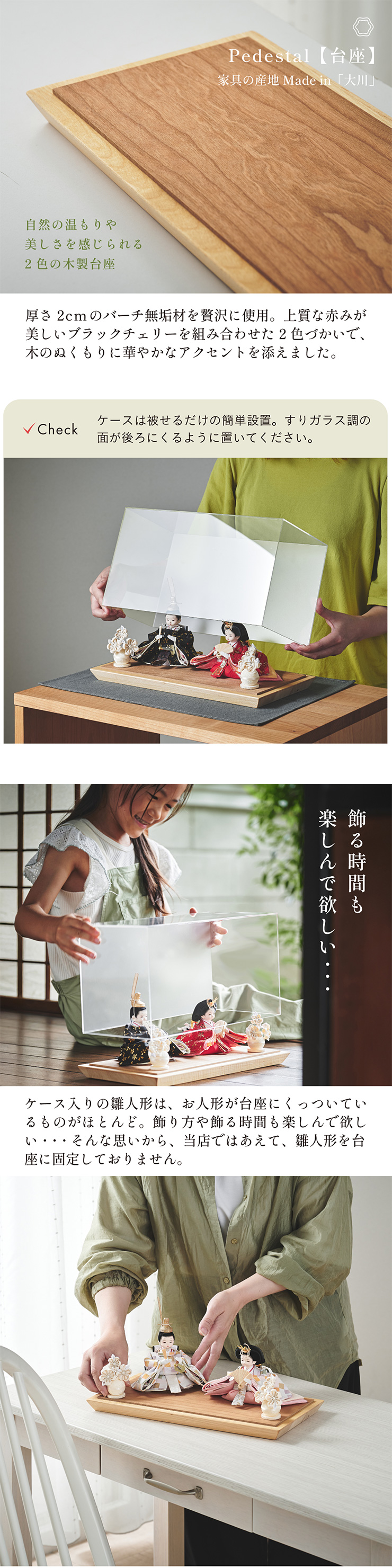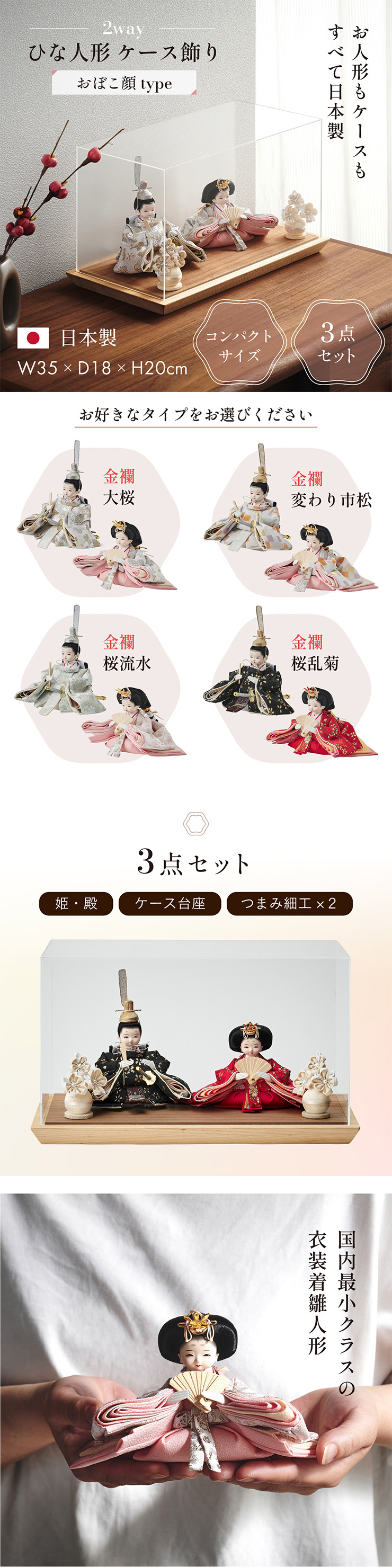 | ひな人形 ケース飾り おぼこ顔type お人形もケースもすべて日本製 国内最小クラスの衣装着雛人形 思わずお子様の面影と重ねてしまう。あどけない表情が可愛らしい、現代風の雛人形です。 ケース無しでも飾れるので、お部屋のスタイルに合わせたコーディネートをお楽しみください。 ■生地は贅沢に、伝統的な金襴を使いました。 金襴とは、400年以上も前から日本に受け継がれる、伝統的な織物です。きらびやかで色彩豊かな風合いや質感をお楽しみください。 ■Flower【花飾り】 200年以上の歴史を持つ「つまみ細工」は、小さな布をおったりつまんだりして組み合わせ、四季折々の花鳥風月を表現する、日本の伝統技術です。 ■Pedestal【台座】 厚さ2cmのバーチ無垢材を贅沢に使用。上質な赤みが美しいブラックチェリーを組み合わせた2色使いで、木のぬくもりに華やかなアクセントを添えました。 ※カビや変形、変色が早まる恐れがあるため、使用時保管時ともに、高温多湿、直射日光を避けてご愛用ください。 ※糸の染色加工の性質上、水や摩擦による色移り、色落ちすることがございますのでご注意ください。 ※水洗いはお避けください。 ※本商品は食べ物ではあリません。ロの中には絶対に入れないでください。 ※小さなお子様が手を触れない場所にお飾リください。 ※平らな安定した場所にお飾りください。 ※ギフトラッピング&熨斗には対応していませんのでご了承ください。 ※天然無垢素材の質感を生かした商材です。木目や色、節の有無など、一つひとつ違いがあります。また、湿気や乾燥などで膨張や収縮、反りなどの変化が発生する場合があります。天然素材の特徴をご理解いただいた上でご購入ください。 ※1つ1つ手作りのため、表記サイズと完成形のサイズに多少の誤差が生じる場合がございます。予めご了承ください。 ※本商品は屋内用です。屋外でのご使用はおやめください。 ※ケースにはアクリルを使用しております。アクリルはガラスに比べ、軽く割れにくい特徴がありますが、半面、静電気でホコリがつきやすい、また、キズが入リやすいといった性質があります。お手入れをされる場合は、アクリル専用のクロス等(静電気を防止するタイプも市販されています)を使用し、こすらずに、表面を優しくなでるように拭いてください。 ※職人が一つひとつ制作しております。お顔や着物、装飾品含め、すべて手作りや手描きで制作しております。そのため、お顔や衣装の柄や色目の出方などには個体差があり雰囲気が変わる場合もございます。あらかじめご了承ください。 ※金糸の小さい穴のように見える部分は、織りの際に糸がヨレることで発生する穴です。当お人形は、衣装着では業界最小クラスの設計で、価格面においても、可能な限りコストを抑えられるよう職人が鋭意努力し、製作を行っております。一点ごと手作りのため、左右が対象でないなどの個体差や、小さなほつれ、糸の飛び出しなどが発生する場合がございますが、いずれも不良品ではございません。あらかじめご了承ください。 | |