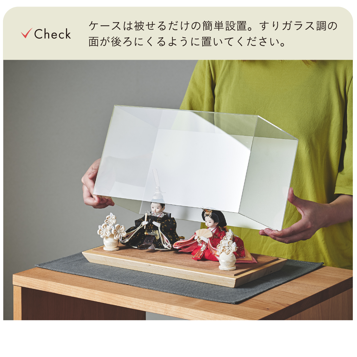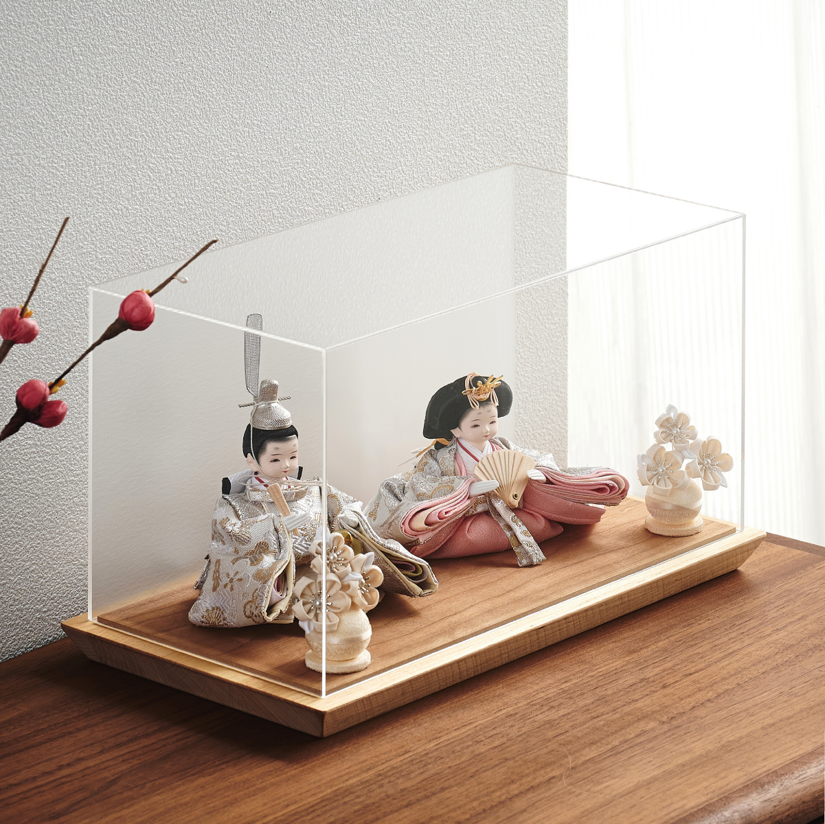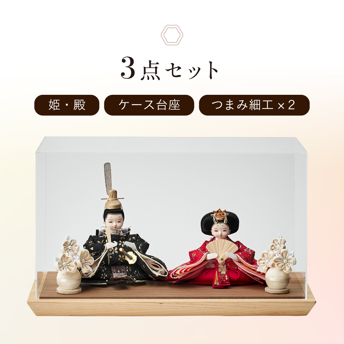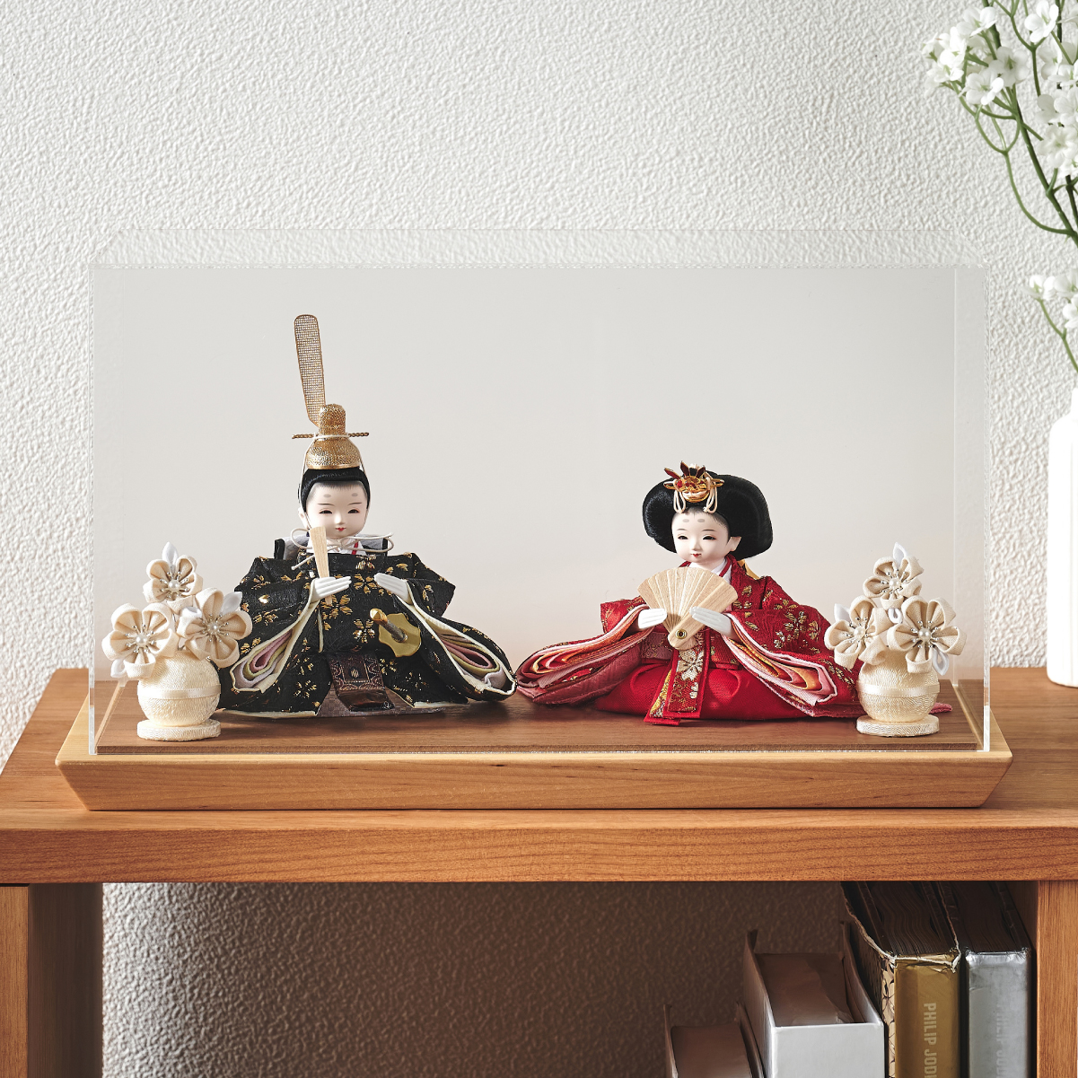 | ひな人形 ケース飾り おぼこ顔type お人形もケースもすべて日本製 国内最小クラスの衣装着雛人形 思わずお子様の面影と重ねてしまう。あどけない表情が可愛らしい、現代風の雛人形です。 ケース無しでも飾れるので、お部屋のスタイルに合わせたコーディネートをお楽しみください。 ■生地は贅沢に、伝統的な金襴を使いました。 金襴とは、400年以上も前から日本に受け継がれる、伝統的な織物です。きらびやかで色彩豊かな風合いや質感をお楽しみください。 ■Flower【花飾り】 200年以上の歴史を持つ「つまみ細工」は、小さな布をおったりつまんだりして組み合わせ、四季折々の花鳥風月を表現する、日本の伝統技術です。 ■Pedestal【台座】 厚さ2cmのバーチ無垢材を贅沢に使用。上質な赤みが美しいブラックチェリーを組み合わせた2色使いで、木のぬくもりに華やかなアクセントを添えました。 ※カビや変形、変色が早まる恐れがあるため、使用時保管時ともに、高温多湿、直射日光を避けてご愛用ください。 ※糸の染色加工の性質上、水や摩擦による色移り、色落ちすることがございますのでご注意ください。 ※水洗いはお避けください。 ※本商品は食べ物ではあリません。ロの中には絶対に入れないでください。 ※小さなお子様が手を触れない場所にお飾リください。 ※平らな安定した場所にお飾りください。 ※ギフトラッピング&熨斗には対応していませんのでご了承ください。 ※天然無垢素材の質感を生かした商材です。木目や色、節の有無など、一つひとつ違いがあります。また、湿気や乾燥などで膨張や収縮、反りなどの変化が発生する場合があります。天然素材の特徴をご理解いただいた上でご購入ください。 ※1つ1つ手作りのため、表記サイズと完成形のサイズに多少の誤差が生じる場合がございます。予めご了承ください。 ※本商品は屋内用です。屋外でのご使用はおやめください。 ※ケースにはアクリルを使用しております。アクリルはガラスに比べ、軽く割れにくい特徴がありますが、半面、静電気でホコリがつきやすい、また、キズが入リやすいといった性質があります。お手入れをされる場合は、アクリル専用のクロス等(静電気を防止するタイプも市販されています)を使用し、こすらずに、表面を優しくなでるように拭いてください。 ※職人が一つひとつ制作しております。お顔や着物、装飾品含め、すべて手作りや手描きで制作しております。そのため、お顔や衣装の柄や色目の出方などには個体差があり雰囲気が変わる場合もございます。あらかじめご了承ください。 ※金糸の小さい穴のように見える部分は、織りの際に糸がヨレることで発生する穴です。当お人形は、衣装着では業界最小クラスの設計で、価格面においても、可能な限りコストを抑えられるよう職人が鋭意努力し、製作を行っております。一点ごと手作りのため、左右が対象でないなどの個体差や、小さなほつれ、糸の飛び出しなどが発生する場合がございますが、いずれも不良品ではございません。あらかじめご了承ください。 | |