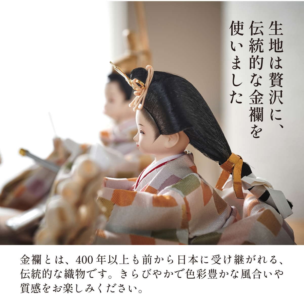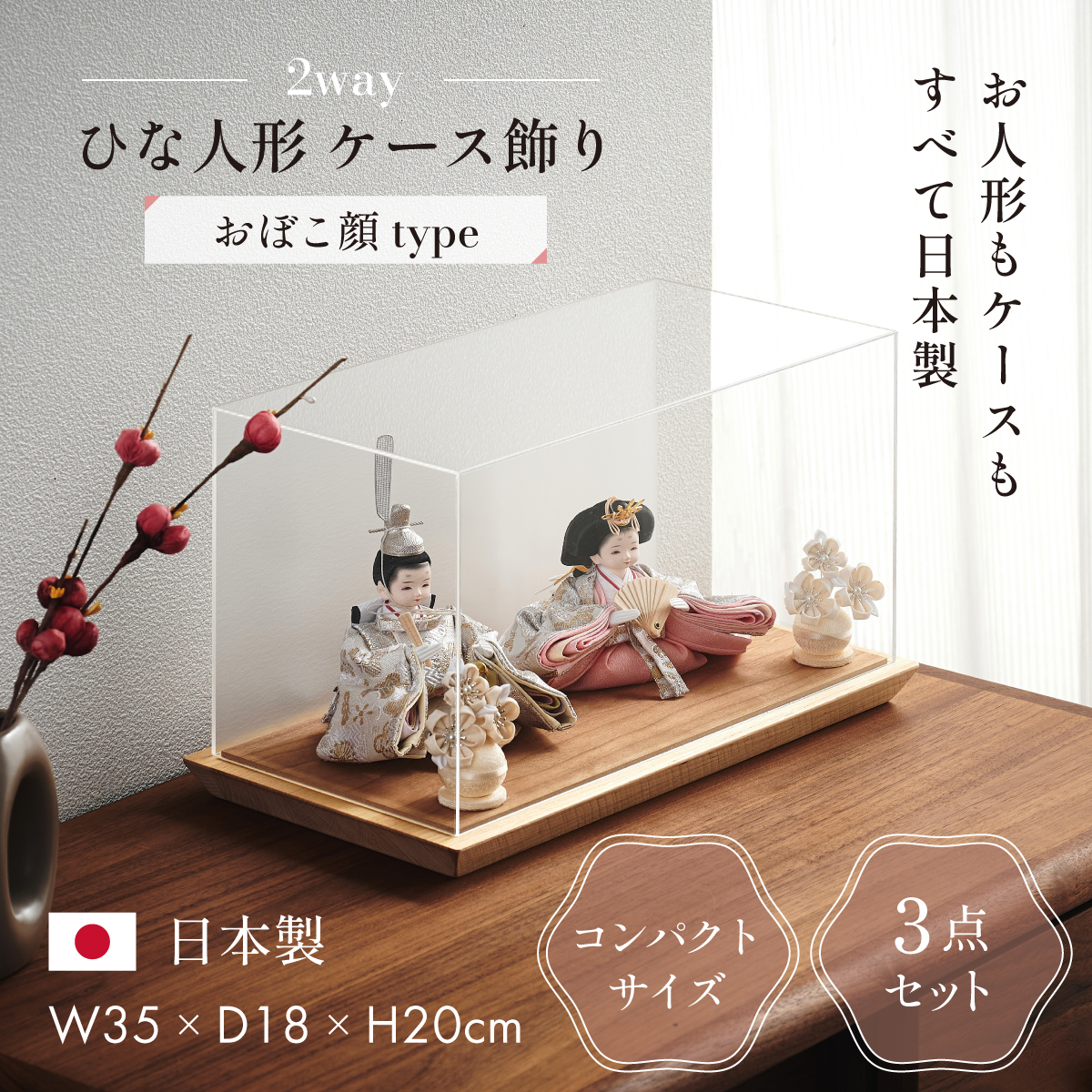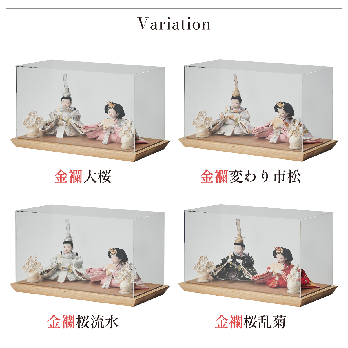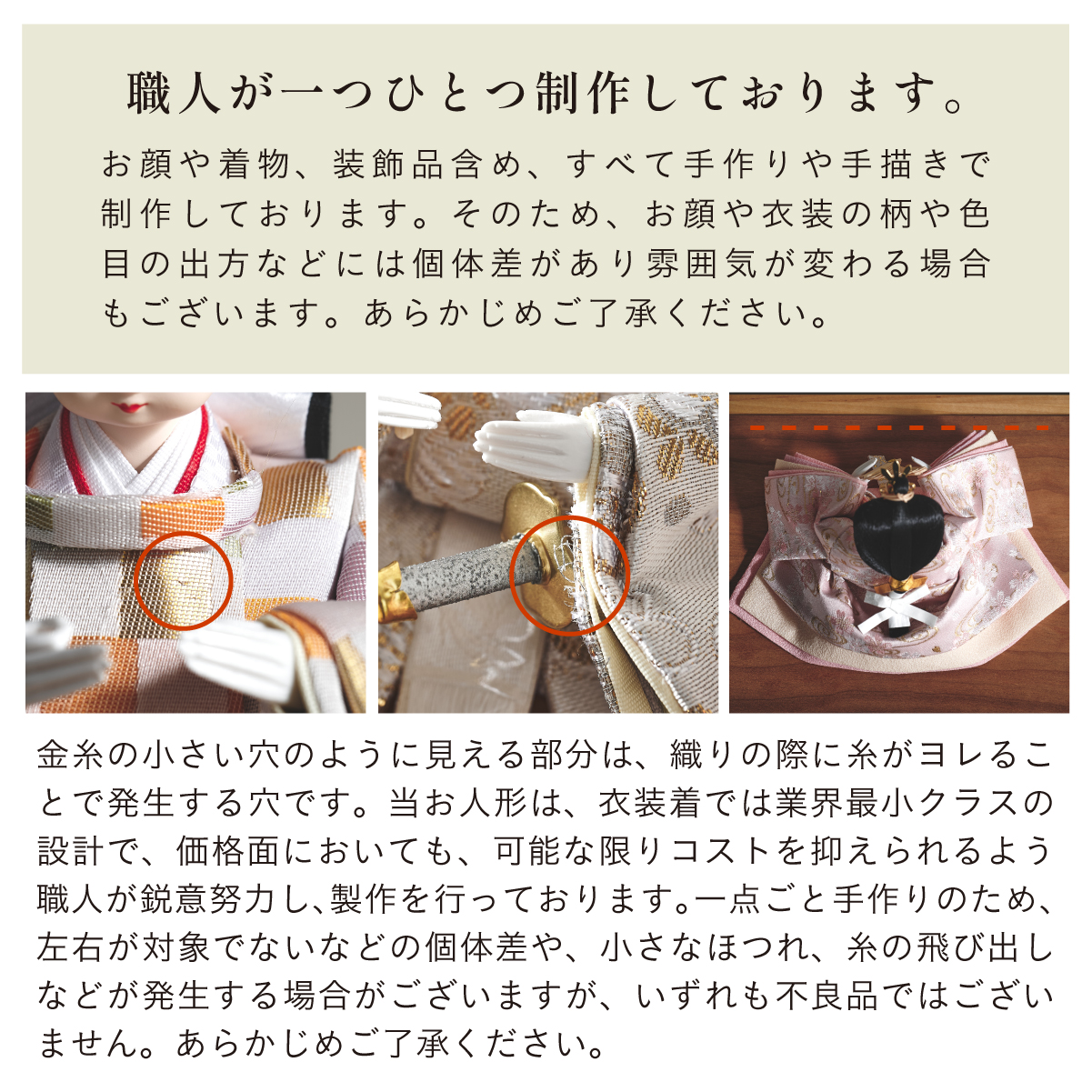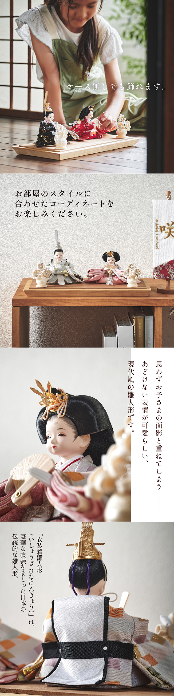 | ひな人形 ケース飾り おぼこ顔type お人形もケースもすべて日本製 国内最小クラスの衣装着雛人形 思わずお子様の面影と重ねてしまう。あどけない表情が可愛らしい、現代風の雛人形です。 ケース無しでも飾れるので、お部屋のスタイルに合わせたコーディネートをお楽しみください。 ■生地は贅沢に、伝統的な金襴を使いました。 金襴とは、400年以上も前から日本に受け継がれる、伝統的な織物です。きらびやかで色彩豊かな風合いや質感をお楽しみください。 ■Flower【花飾り】 200年以上の歴史を持つ「つまみ細工」は、小さな布をおったりつまんだりして組み合わせ、四季折々の花鳥風月を表現する、日本の伝統技術です。 ■Pedestal【台座】 厚さ2cmのバーチ無垢材を贅沢に使用。上質な赤みが美しいブラックチェリーを組み合わせた2色使いで、木のぬくもりに華やかなアクセントを添えました。 ※カビや変形、変色が早まる恐れがあるため、使用時保管時ともに、高温多湿、直射日光を避けてご愛用ください。 ※糸の染色加工の性質上、水や摩擦による色移り、色落ちすることがございますのでご注意ください。 ※水洗いはお避けください。 ※本商品は食べ物ではあリません。ロの中には絶対に入れないでください。 ※小さなお子様が手を触れない場所にお飾リください。 ※平らな安定した場所にお飾りください。 ※ギフトラッピング&熨斗には対応していませんのでご了承ください。 ※天然無垢素材の質感を生かした商材です。木目や色、節の有無など、一つひとつ違いがあります。また、湿気や乾燥などで膨張や収縮、反りなどの変化が発生する場合があります。天然素材の特徴をご理解いただいた上でご購入ください。 ※1つ1つ手作りのため、表記サイズと完成形のサイズに多少の誤差が生じる場合がございます。予めご了承ください。 ※本商品は屋内用です。屋外でのご使用はおやめください。 ※ケースにはアクリルを使用しております。アクリルはガラスに比べ、軽く割れにくい特徴がありますが、半面、静電気でホコリがつきやすい、また、キズが入リやすいといった性質があります。お手入れをされる場合は、アクリル専用のクロス等(静電気を防止するタイプも市販されています)を使用し、こすらずに、表面を優しくなでるように拭いてください。 ※職人が一つひとつ制作しております。お顔や着物、装飾品含め、すべて手作りや手描きで制作しております。そのため、お顔や衣装の柄や色目の出方などには個体差があり雰囲気が変わる場合もございます。あらかじめご了承ください。 ※金糸の小さい穴のように見える部分は、織りの際に糸がヨレることで発生する穴です。当お人形は、衣装着では業界最小クラスの設計で、価格面においても、可能な限りコストを抑えられるよう職人が鋭意努力し、製作を行っております。一点ごと手作りのため、左右が対象でないなどの個体差や、小さなほつれ、糸の飛び出しなどが発生する場合がございますが、いずれも不良品ではございません。あらかじめご了承ください。 | |