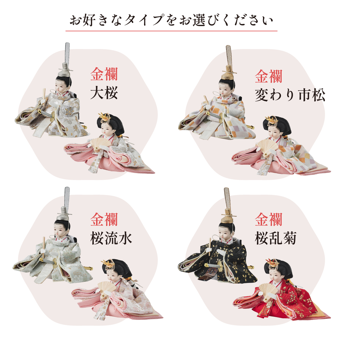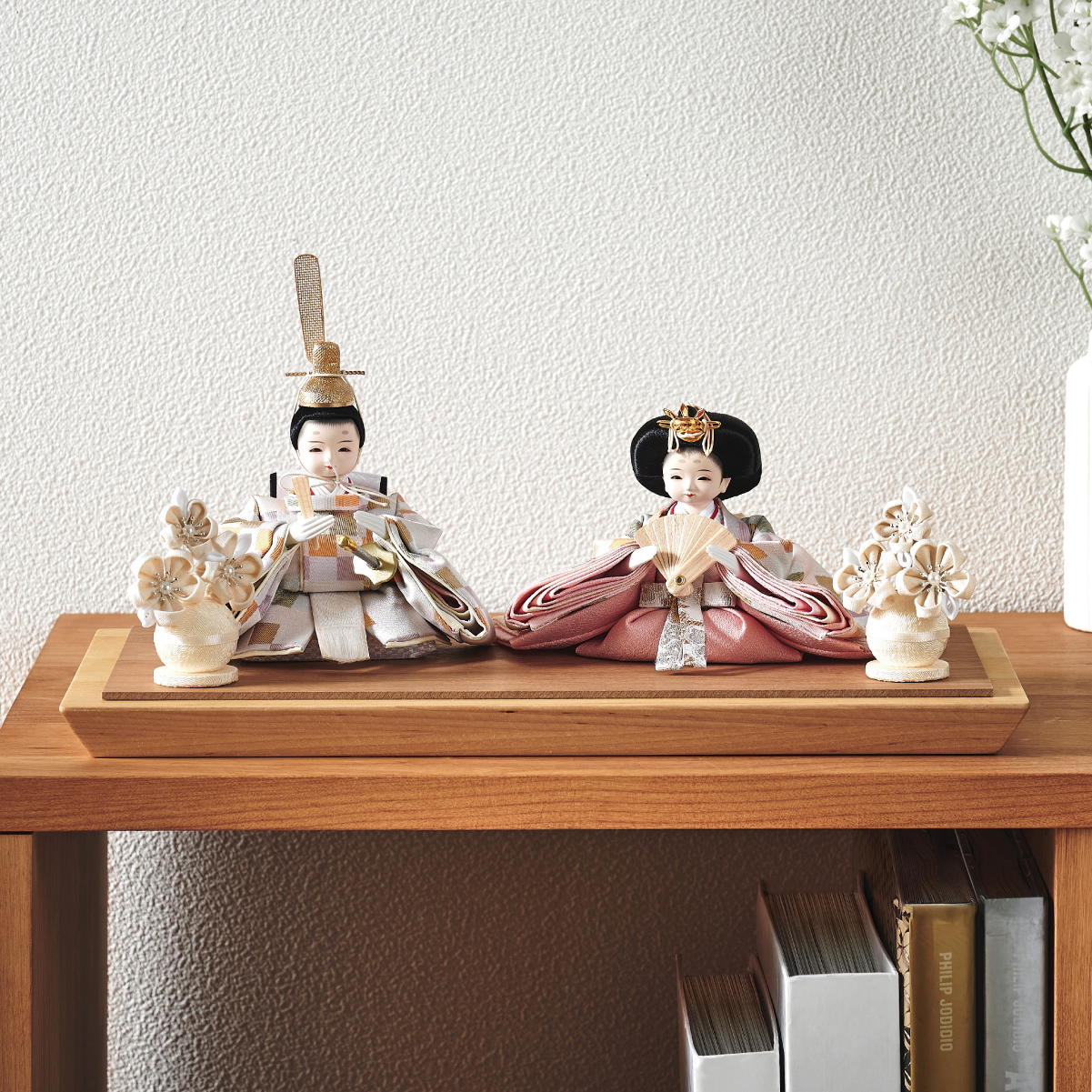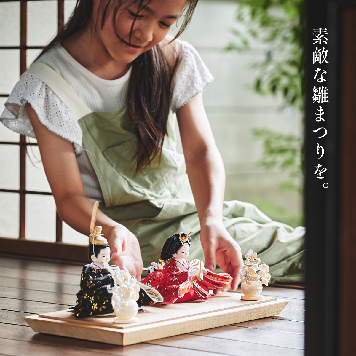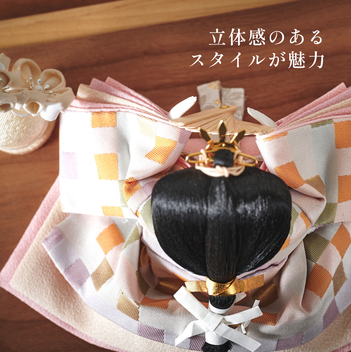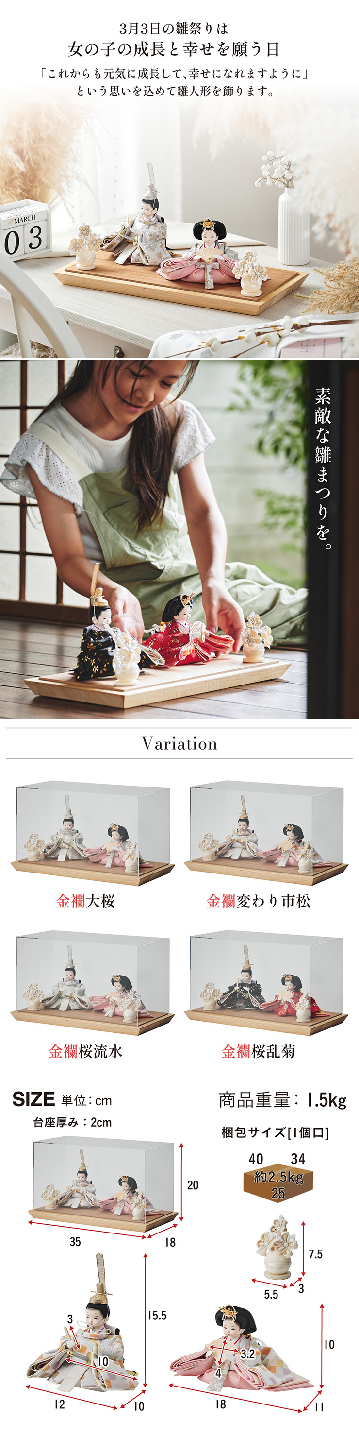 | ひな人形 ケース飾り おぼこ顔type お人形もケースもすべて日本製 国内最小クラスの衣装着雛人形 思わずお子様の面影と重ねてしまう。あどけない表情が可愛らしい、現代風の雛人形です。 ケース無しでも飾れるので、お部屋のスタイルに合わせたコーディネートをお楽しみください。 ■生地は贅沢に、伝統的な金襴を使いました。 金襴とは、400年以上も前から日本に受け継がれる、伝統的な織物です。きらびやかで色彩豊かな風合いや質感をお楽しみください。 ■Flower【花飾り】 200年以上の歴史を持つ「つまみ細工」は、小さな布をおったりつまんだりして組み合わせ、四季折々の花鳥風月を表現する、日本の伝統技術です。 ■Pedestal【台座】 厚さ2cmのバーチ無垢材を贅沢に使用。上質な赤みが美しいブラックチェリーを組み合わせた2色使いで、木のぬくもりに華やかなアクセントを添えました。 ※カビや変形、変色が早まる恐れがあるため、使用時保管時ともに、高温多湿、直射日光を避けてご愛用ください。 ※糸の染色加工の性質上、水や摩擦による色移り、色落ちすることがございますのでご注意ください。 ※水洗いはお避けください。 ※本商品は食べ物ではあリません。ロの中には絶対に入れないでください。 ※小さなお子様が手を触れない場所にお飾リください。 ※平らな安定した場所にお飾りください。 ※ギフトラッピング&熨斗には対応していませんのでご了承ください。 ※天然無垢素材の質感を生かした商材です。木目や色、節の有無など、一つひとつ違いがあります。また、湿気や乾燥などで膨張や収縮、反りなどの変化が発生する場合があります。天然素材の特徴をご理解いただいた上でご購入ください。 ※1つ1つ手作りのため、表記サイズと完成形のサイズに多少の誤差が生じる場合がございます。予めご了承ください。 ※本商品は屋内用です。屋外でのご使用はおやめください。 ※ケースにはアクリルを使用しております。アクリルはガラスに比べ、軽く割れにくい特徴がありますが、半面、静電気でホコリがつきやすい、また、キズが入リやすいといった性質があります。お手入れをされる場合は、アクリル専用のクロス等(静電気を防止するタイプも市販されています)を使用し、こすらずに、表面を優しくなでるように拭いてください。 ※職人が一つひとつ制作しております。お顔や着物、装飾品含め、すべて手作りや手描きで制作しております。そのため、お顔や衣装の柄や色目の出方などには個体差があり雰囲気が変わる場合もございます。あらかじめご了承ください。 ※金糸の小さい穴のように見える部分は、織りの際に糸がヨレることで発生する穴です。当お人形は、衣装着では業界最小クラスの設計で、価格面においても、可能な限りコストを抑えられるよう職人が鋭意努力し、製作を行っております。一点ごと手作りのため、左右が対象でないなどの個体差や、小さなほつれ、糸の飛び出しなどが発生する場合がございますが、いずれも不良品ではございません。あらかじめご了承ください。 | |
