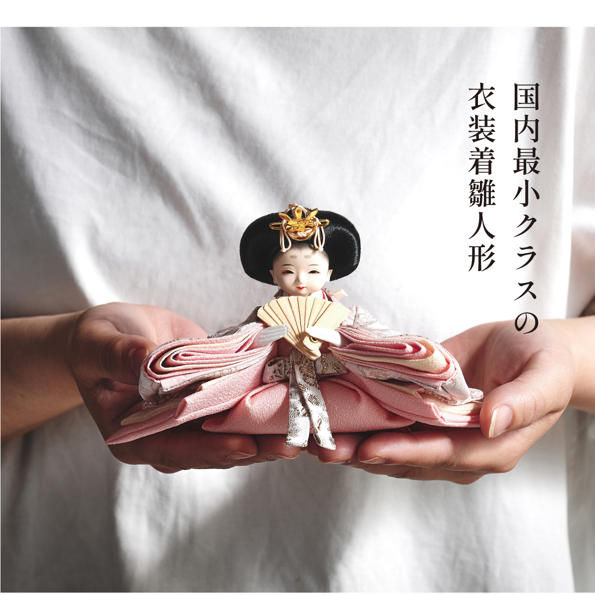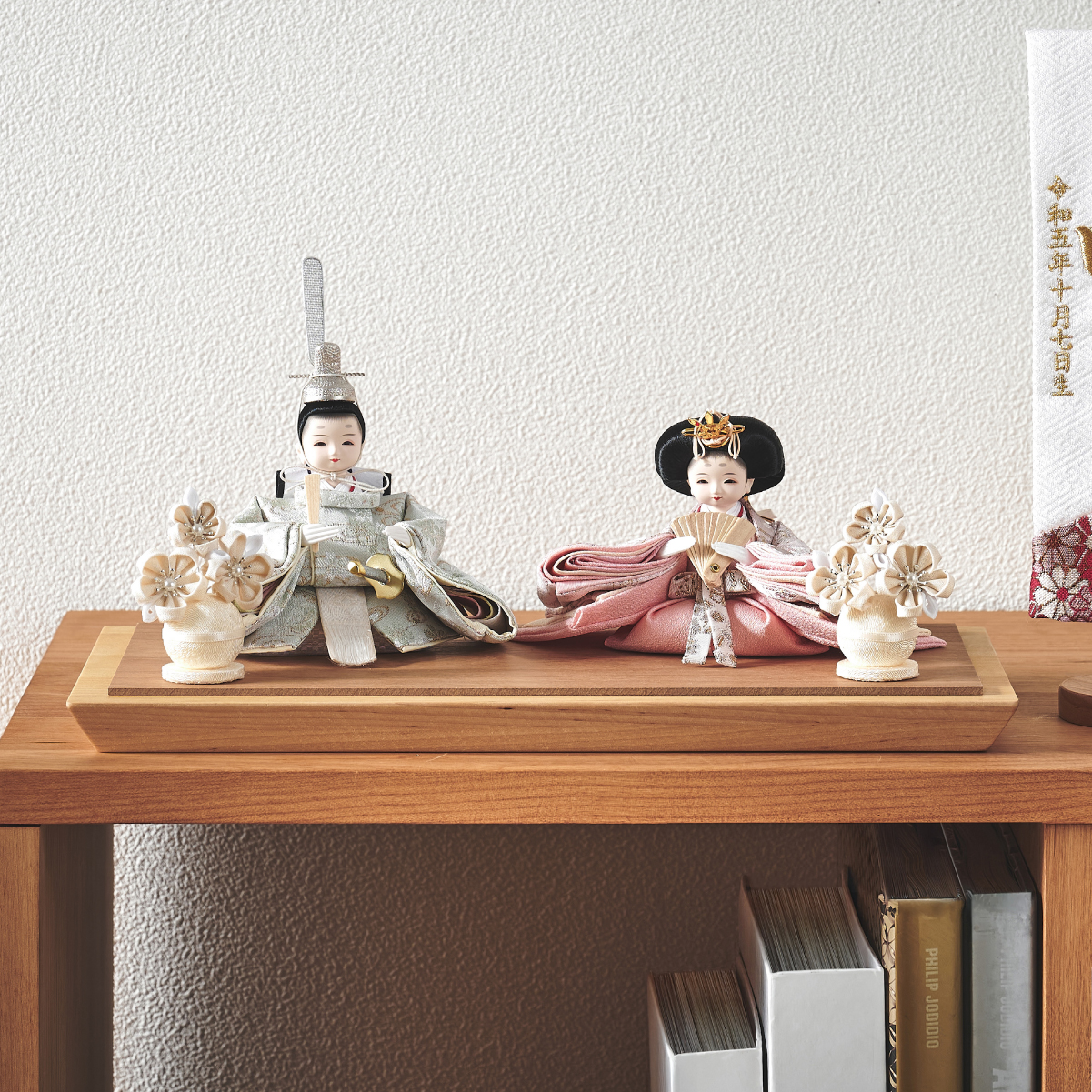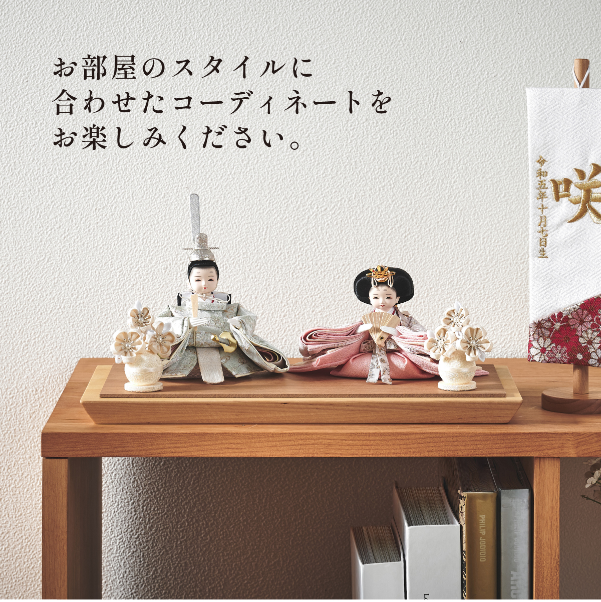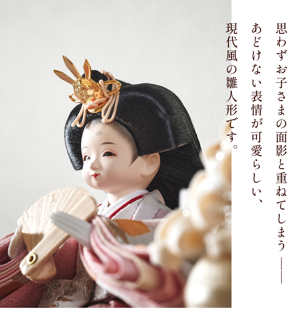 | ひな人形 ケース飾り おぼこ顔type お人形もケースもすべて日本製 国内最小クラスの衣装着雛人形 思わずお子様の面影と重ねてしまう。あどけない表情が可愛らしい、現代風の雛人形です。 ケース無しでも飾れるので、お部屋のスタイルに合わせたコーディネートをお楽しみください。 ■生地は贅沢に、伝統的な金襴を使いました。 金襴とは、400年以上も前から日本に受け継がれる、伝統的な織物です。きらびやかで色彩豊かな風合いや質感をお楽しみください。 ■Flower【花飾り】 200年以上の歴史を持つ「つまみ細工」は、小さな布をおったりつまんだりして組み合わせ、四季折々の花鳥風月を表現する、日本の伝統技術です。 ■Pedestal【台座】 厚さ2cmのバーチ無垢材を贅沢に使用。上質な赤みが美しいブラックチェリーを組み合わせた2色使いで、木のぬくもりに華やかなアクセントを添えました。 ※カビや変形、変色が早まる恐れがあるため、使用時保管時ともに、高温多湿、直射日光を避けてご愛用ください。 ※糸の染色加工の性質上、水や摩擦による色移り、色落ちすることがございますのでご注意ください。 ※水洗いはお避けください。 ※本商品は食べ物ではあリません。ロの中には絶対に入れないでください。 ※小さなお子様が手を触れない場所にお飾リください。 ※平らな安定した場所にお飾りください。 ※ギフトラッピング&熨斗には対応していませんのでご了承ください。 ※天然無垢素材の質感を生かした商材です。木目や色、節の有無など、一つひとつ違いがあります。また、湿気や乾燥などで膨張や収縮、反りなどの変化が発生する場合があります。天然素材の特徴をご理解いただいた上でご購入ください。 ※1つ1つ手作りのため、表記サイズと完成形のサイズに多少の誤差が生じる場合がございます。予めご了承ください。 ※本商品は屋内用です。屋外でのご使用はおやめください。 ※ケースにはアクリルを使用しております。アクリルはガラスに比べ、軽く割れにくい特徴がありますが、半面、静電気でホコリがつきやすい、また、キズが入リやすいといった性質があります。お手入れをされる場合は、アクリル専用のクロス等(静電気を防止するタイプも市販されています)を使用し、こすらずに、表面を優しくなでるように拭いてください。 ※職人が一つひとつ制作しております。お顔や着物、装飾品含め、すべて手作りや手描きで制作しております。そのため、お顔や衣装の柄や色目の出方などには個体差があり雰囲気が変わる場合もございます。あらかじめご了承ください。 ※金糸の小さい穴のように見える部分は、織りの際に糸がヨレることで発生する穴です。当お人形は、衣装着では業界最小クラスの設計で、価格面においても、可能な限りコストを抑えられるよう職人が鋭意努力し、製作を行っております。一点ごと手作りのため、左右が対象でないなどの個体差や、小さなほつれ、糸の飛び出しなどが発生する場合がございますが、いずれも不良品ではございません。あらかじめご了承ください。 | |