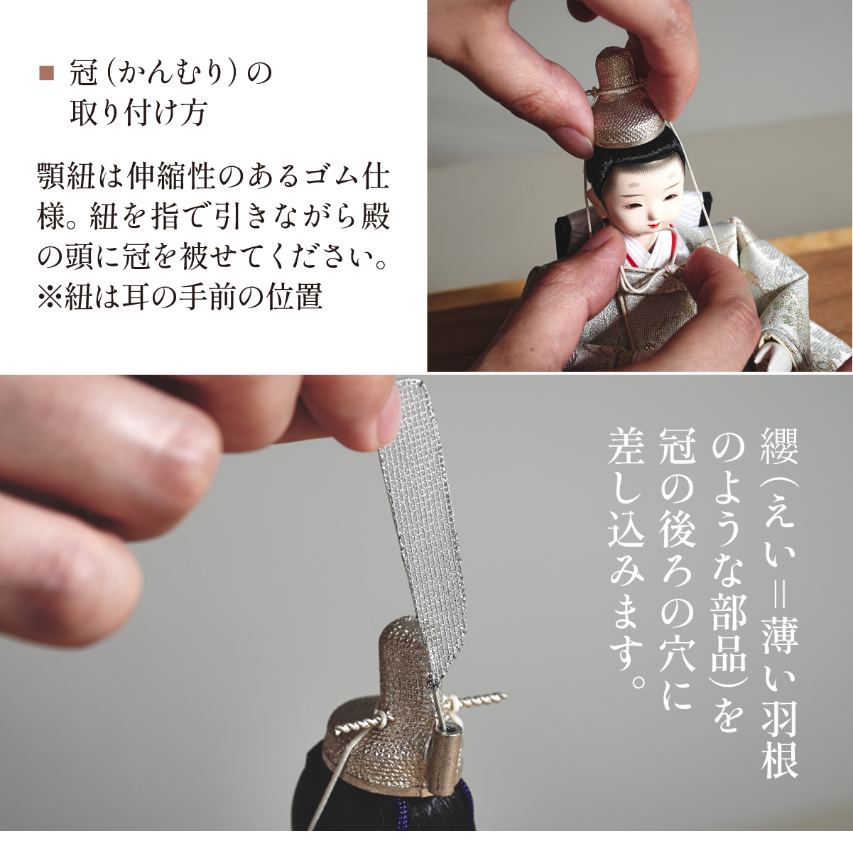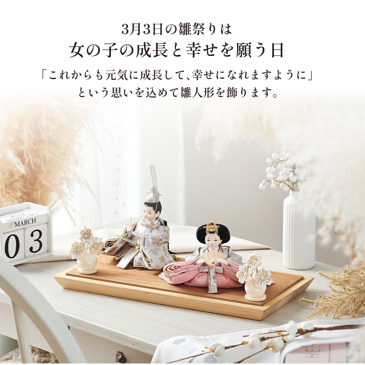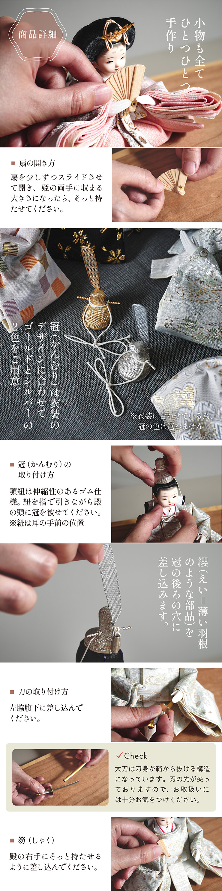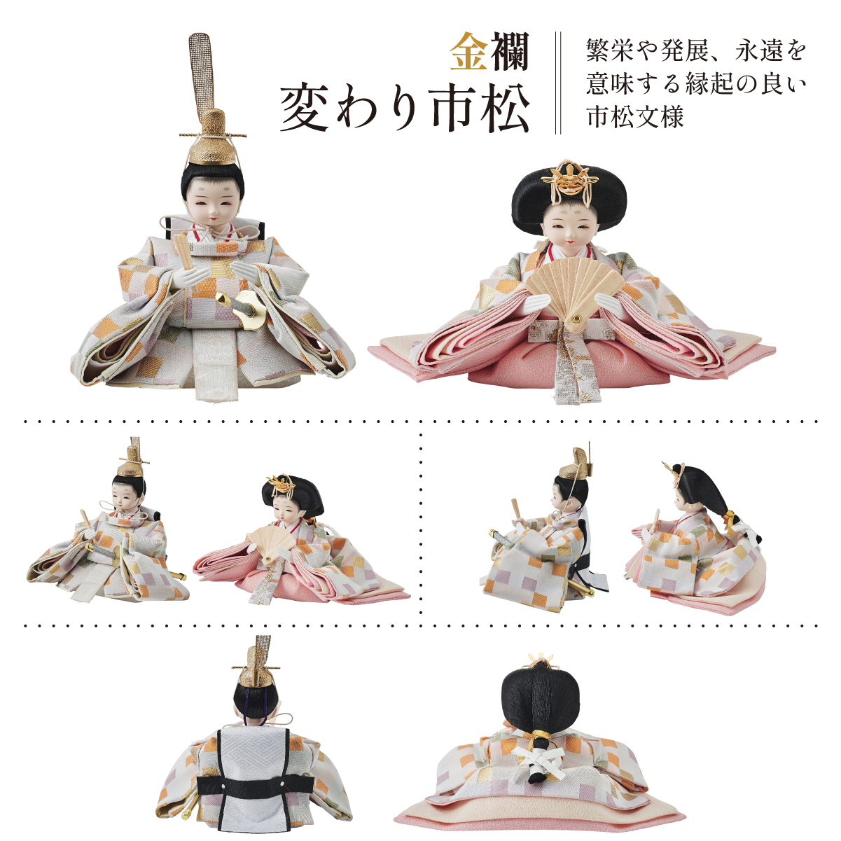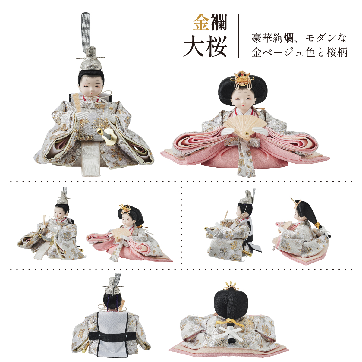 | ひな人形 ケース飾り おぼこ顔type お人形もケースもすべて日本製 国内最小クラスの衣装着雛人形 思わずお子様の面影と重ねてしまう。あどけない表情が可愛らしい、現代風の雛人形です。 ケース無しでも飾れるので、お部屋のスタイルに合わせたコーディネートをお楽しみください。 ■生地は贅沢に、伝統的な金襴を使いました。 金襴とは、400年以上も前から日本に受け継がれる、伝統的な織物です。きらびやかで色彩豊かな風合いや質感をお楽しみください。 ■Flower【花飾り】 200年以上の歴史を持つ「つまみ細工」は、小さな布をおったりつまんだりして組み合わせ、四季折々の花鳥風月を表現する、日本の伝統技術です。 ■Pedestal【台座】 厚さ2cmのバーチ無垢材を贅沢に使用。上質な赤みが美しいブラックチェリーを組み合わせた2色使いで、木のぬくもりに華やかなアクセントを添えました。 ※カビや変形、変色が早まる恐れがあるため、使用時保管時ともに、高温多湿、直射日光を避けてご愛用ください。 ※糸の染色加工の性質上、水や摩擦による色移り、色落ちすることがございますのでご注意ください。 ※水洗いはお避けください。 ※本商品は食べ物ではあリません。ロの中には絶対に入れないでください。 ※小さなお子様が手を触れない場所にお飾リください。 ※平らな安定した場所にお飾りください。 ※ギフトラッピング&熨斗には対応していませんのでご了承ください。 ※天然無垢素材の質感を生かした商材です。木目や色、節の有無など、一つひとつ違いがあります。また、湿気や乾燥などで膨張や収縮、反りなどの変化が発生する場合があります。天然素材の特徴をご理解いただいた上でご購入ください。 ※1つ1つ手作りのため、表記サイズと完成形のサイズに多少の誤差が生じる場合がございます。予めご了承ください。 ※本商品は屋内用です。屋外でのご使用はおやめください。 ※ケースにはアクリルを使用しております。アクリルはガラスに比べ、軽く割れにくい特徴がありますが、半面、静電気でホコリがつきやすい、また、キズが入リやすいといった性質があります。お手入れをされる場合は、アクリル専用のクロス等(静電気を防止するタイプも市販されています)を使用し、こすらずに、表面を優しくなでるように拭いてください。 ※職人が一つひとつ制作しております。お顔や着物、装飾品含め、すべて手作りや手描きで制作しております。そのため、お顔や衣装の柄や色目の出方などには個体差があり雰囲気が変わる場合もございます。あらかじめご了承ください。 ※金糸の小さい穴のように見える部分は、織りの際に糸がヨレることで発生する穴です。当お人形は、衣装着では業界最小クラスの設計で、価格面においても、可能な限りコストを抑えられるよう職人が鋭意努力し、製作を行っております。一点ごと手作りのため、左右が対象でないなどの個体差や、小さなほつれ、糸の飛び出しなどが発生する場合がございますが、いずれも不良品ではございません。あらかじめご了承ください。 | |