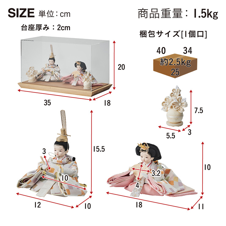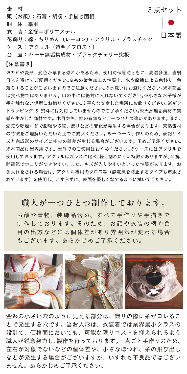 | 材質・素材 | 頭(お顔):石膏・胡粉・手描き面相 胴体:藁胴 衣装:金襴=ポリエステル 花飾り:綿・ちりめん(レーヨン)・アクリル・プラスチック ケース:アクリル(透明/フロスト) 台座:バーチ無垢集成材・ブラックチェリー突板 |