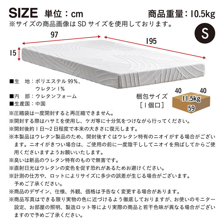 | 【NERUS×smart-i】高反発マットレス シングルサイズ Unity(ユニティ) 快適な眠りが、明日のあなたをつくる。 新しい一日のはじまりを、ここから。 高い反発力で身体をしっかり支える 高反発マットレス 高反発ウレタンは身体をしっかり支えながら沈み込みすぎず寝返りを防げない弾力が特徴です。 高純度ウレタンのほどよい反発力で軽やかな寝返りと安定した寝返りをサポートします。 ■3D高密度ウレタンを使用 ・内部の密度が高いほど、高反発で寝心地の良いマットレスと言えます。NERUSは高密度の30Dを採用しています。 ・ウレタンの硬さは220Nと硬めの寝心地。身体の負担を軽減し、寝返りをサポートします。 ■ちょうどいい硬さで体圧分散 NERUSマットレスは、適度な硬さで全身をバランスよく支え、理想の寝姿勢をキープできます。 ■毎日使っても元の厚みをキープ 復元率98%で不純物の少ない高品質のウレタンフォームを使用することで、高い耐久性を実現しました。へたりにくく長くお使いいただけます。 ■竹炭入りウレタン 消臭・抗菌・調湿機能 においや湿気・汚れなどを吸着する働きがある竹炭をウレタンに配合。快適にご使用いただけます。 ■底付き感のない、贅沢な寝心地 眠りを支える極厚15cm フローリングやすのこに直接敷いても底つき感を感じにくくなっています。 ■肌に触れるたび、心地よく。高級ニット生地 上質なニット生地を採用し、ただに触れるたびにやさしさを感じる仕上がりに。伸縮性があり、寝返りの動きにも自然にフィットします。 通気性にも優れ、季節を問わず快適な寝心地を保ちます。裏面すべり止め付き ■洗えるカバー カバーは取り外してご家庭の洗濯機で丸洗い可能です。清潔にお使いいただけます。 外カバーの内側には、通気性のよいインナーカバー採用。ウレタンフォームを湿気や汚れから守り、型崩れを防ぎます。 ■安心安全へのこだわり ・ISO認定工場で生産 ・ノンホルムアルデヒド ・サーティピュア認定ウレタン使用 ・ウレタン復元率98%でへたりにくい ■長くお使いいただくために 3~6ヶ月に一度を目安に、マットレスの上下をローテーションすることをおすすめします。 また、風通しのよい場所で陰干しをすると、より清潔に保てます。定期的なケアで寝心地と耐久性が長く続きます。 ■搬入しやすい圧縮梱包でお届け 搬入が簡単な圧縮梱包でお届けします。ごみを最小限に抑え環境に優しい仕様です。 ※サイズの商品画像はSDサイズを使用しております。 ※圧縮袋は一度開封すると再圧縮できません。 ※開封する際はハサミを使用し、ケガ等に十分気をつけながら行ってください。 ※開封後約1日~2日程度で本来の大きさに復元します。 ※本製品はウレタン製品のため、開封後すぐはウレタン特有のニオイがする場合がございます。ニオイがきつい場合は、ご使用の前に一度陰干ししてニオイを飛ばしてからご使用くださいますようお願いいたします。 ※臭いは新品のウレタン特有のもので無害です。 ※直射日光はウレタンの変色を促す恐れがあるためお避けください。 ※カバーを洗濯する時は、洗濯ネットに入れてください。 ※マットレスは片面仕様です。裏返してご使用はできません。 ※計測の仕方や、ロットによりサイズに多少の誤差が生じる場合がございます。予めご了承ください。 ※商品のデザイン、仕様、外観、価格は予告なく変更する場合があります。 ※商品写真はできる限り実物の色に近づけるよう徹底しておりますが、お使いのモニター設定、お部屋の照明、製造ロット等により実際の商品と若干色味が異なる場合がございますので予めご了承ください。 | |