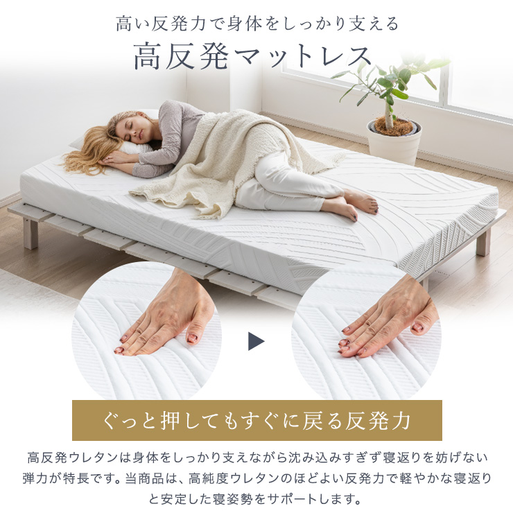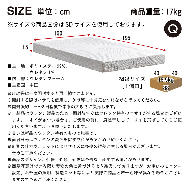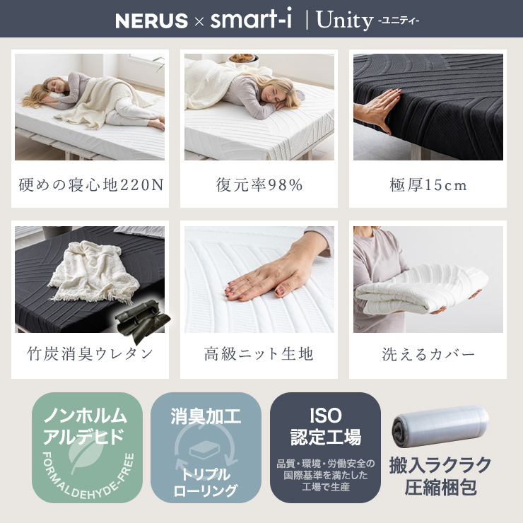 | 【NERUS×smart-i】高反発マットレス クイーンサイズ Unity(ユニティ) 快適な眠りが、明日のあなたをつくる。 新しい一日のはじまりを、ここから。 高い反発力で身体をしっかり支える 高反発マットレス 高反発ウレタンは身体をしっかり支えながら沈み込みすぎず寝返りを防げない弾力が特徴です。 高純度ウレタンのほどよい反発力で軽やかな寝返りと安定した寝返りをサポートします。 ■3D高密度ウレタンを使用 ・内部の密度が高いほど、高反発で寝心地の良いマットレスと言えます。NERUSは高密度の30Dを採用しています。 ・ウレタンの硬さは220Nと硬めの寝心地。身体の負担を軽減し、寝返りをサポートします。 ■ちょうどいい硬さで体圧分散 NERUSマットレスは、適度な硬さで全身をバランスよく支え、理想の寝姿勢をキープできます。 ■毎日使っても元の厚みをキープ 復元率98%で不純物の少ない高品質のウレタンフォームを使用することで、高い耐久性を実現しました。へたりにくく長くお使いいただけます。 ■竹炭入りウレタン 消臭・抗菌・調湿機能 においや湿気・汚れなどを吸着する働きがある竹炭をウレタンに配合。快適にご使用いただけます。 ■底付き感のない、贅沢な寝心地 眠りを支える極厚15cm フローリングやすのこに直接敷いても底つき感を感じにくくなっています。 ■肌に触れるたび、心地よく。高級ニット生地 上質なニット生地を採用し、ただに触れるたびにやさしさを感じる仕上がりに。伸縮性があり、寝返りの動きにも自然にフィットします。 通気性にも優れ、季節を問わず快適な寝心地を保ちます。裏面すべり止め付き ■洗えるカバー カバーは取り外してご家庭の洗濯機で丸洗い可能です。清潔にお使いいただけます。 外カバーの内側には、通気性のよいインナーカバー採用。ウレタンフォームを湿気や汚れから守り、型崩れを防ぎます。 ■安心安全へのこだわり ・ISO認定工場で生産 ・ノンホルムアルデヒド ・サーティピュア認定ウレタン使用 ・ウレタン復元率98%でへたりにくい ■長くお使いいただくために 3~6ヶ月に一度を目安に、マットレスの上下をローテーションすることをおすすめします。 また、風通しのよい場所で陰干しをすると、より清潔に保てます。定期的なケアで寝心地と耐久性が長く続きます。 ■搬入しやすい圧縮梱包でお届け 搬入が簡単な圧縮梱包でお届けします。ごみを最小限に抑え環境に優しい仕様です。 ※サイズの商品画像はSDサイズを使用しております。 ※圧縮袋は一度開封すると再圧縮できません。 ※開封する際はハサミを使用し、ケガ等に十分気をつけながら行ってください。 ※開封後約1日~2日程度で本来の大きさに復元します。 ※本製品はウレタン製品のため、開封後すぐはウレタン特有のニオイがする場合がございます。ニオイがきつい場合は、ご使用の前に一度陰干ししてニオイを飛ばしてからご使用くださいますようお願いいたします。 ※臭いは新品のウレタン特有のもので無害です。 ※直射日光はウレタンの変色を促す恐れがあるためお避けください。 ※カバーを洗濯する時は、洗濯ネットに入れてください。 ※マットレスは片面仕様です。裏返してご使用はできません。 ※計測の仕方や、ロットによりサイズに多少の誤差が生じる場合がございます。予めご了承ください。 ※商品のデザイン、仕様、外観、価格は予告なく変更する場合があります。 ※商品写真はできる限り実物の色に近づけるよう徹底しておりますが、お使いのモニター設定、お部屋の照明、製造ロット等により実際の商品と若干色味が異なる場合がございますので予めご了承ください。 | |