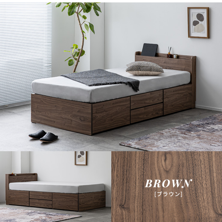 | 引き出し収納付きベッド Tirole(ティロール) フレーム単品S 大容量の収納付きベッド お部屋に合わせて選べる4つのカラー。 ヘッドボードには小物を置いたり、スマホを立てられる溝付きデザイン。 さらに、2口のスライドコンセントを装備。 ベッド下までしっかり活用できる収納設計。 左右どちらにも付け替えできる引き出しで、使いやすく、たっぷりしまえます。 通気性の良いすのこ仕様で、湿気がこもりにくく快適な寝心地を叶えます。 寝るとしまうを、もっと快適に。5つのポイント ・小物置きに便利なヘッドボード ・スマホ充電OK!コンセント付き ・通気性抜群のすのこ床板 ・左右変換可能な引き出し収納 ・フリーで使えるベッド下収納 ■使い分けできる4杯の引き出し 引き出しは大容量の合計約139L。 オフシーズンの寝具や衣類も浅型と深型の引き出しを使い分けてすっきり収納できます。 ■小物や薄手衣類の収納に浅型引き出し タオルやインナーなど薄手の収納にちょうどいい深さです。 開閉スムーズなスライドレール付き ■寝具や季節物の収納に深型引き出し バッグや寝具など大きめの物もすっぽり収納できます。 軽く引き出せるキャスター付き ■左右組み替え可能 お部屋の間取りに合わせて引き出しの位置を左右に組み替えられます。 ■取り出し簡単フリースペース ネジ止め不要の差し込み色すのこ すのこはネジで固定をしない差し込み式。 簡単に外せるから収納物を上から取り出せます。 ※中央に固定の仕切りがあるため長物の収納はできません。 ■通気性のいいすのこ 風通しの良いすのこ構造で空気がしっかり通る設計です。 湿気がこもりにくく、寝具を快適に保ちます。 ■便利なヘッドボード 小物を置ける便利なヘッドボード。 2口のスライドコンセント付きでホコリが入りにくく安全にお使いいただけます。 ■スマホを立てられる溝付きデザイン スマホを立てられる溝付きデザイン。 動画視聴にも便利です。 ■安心して使える設計 耐荷重は約200kg。 しっかりとした造りで安定感のある眠りをしっかりサポート。 マットレスはもちろん、敷布団でも安心してお使いいただけます。 優しい設計傷防止付き 脚裏には傷防止パーツを採用。 設置時や位置調整の際も床を傷つけにくい仕様です。 壁にぴったりつけられる巾木よけ設計 背面に巾木よけを設けているため、壁際にもすっきり設置できます。 ※こちらの商品はお客様組み立てとなります。 ※組み立て方や若干の個体差によって、表記サイズと完成形のサイズに多少の誤差が生じる場合がございます。あらかじめご了承ください。 | |