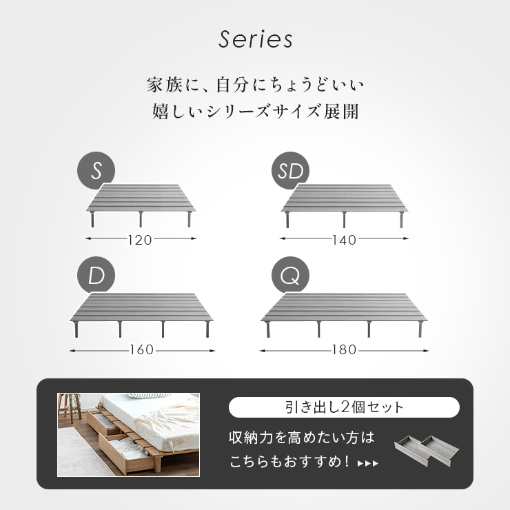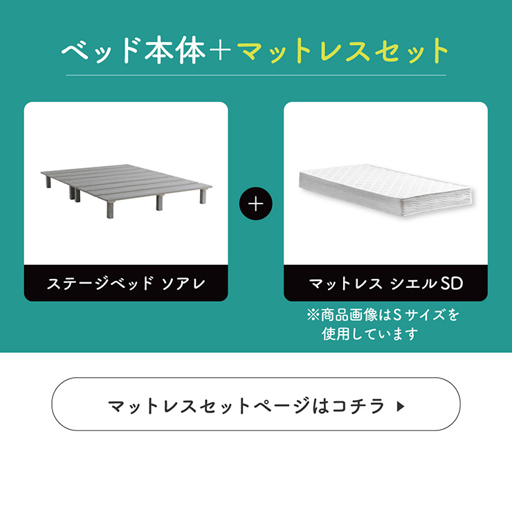| ステージベッド Soares(ソアレ) 現代の暮らしにちょうどいいステージベッド ■美しい木目調 少しマットな質感と温かみある木目調が織りなす、洗礼デザイン ■無駄のないシンプルデザイン すっきりと見せてくれる直線的なフレーム ・床面の空きスペースは、スマホの充電やメガネや本などの小物置きに! ・ベッド下スペースがあるのでお掃除ロボットOK!床下収納にもお使いいただけます。 ■レイアウト自由自在 ヘッドレスだから、壁付けも中央配置もOKなフレキシブルベッド マットレスの置き方やレイアウトで様々なスタイルが可能です。 ■開放感のあるロースタイル 限られたスペースにも、余白を生むデザイン。低めの設計が、天井を高く感じさせ、視線を緩やかに。 ■通気性の良いすのこ 通気性の良いすのこ構造で、寝具も長持ち。清潔さと快適さを、兼ね備えます。 ■敷布団の使用もOK!耐荷重200kg、安定構想 頑丈なつくりで、安定性も確保。安心して使える強さを両立しました。 ■暮らしやすさを両立 ・面取り加工 ・脚部フェルト付き ※こちらの商品はお客様組み立てとなります。 ※組み立て方や若干の個体差によって、表記サイズと完成形のサイズに多少の誤差が生じる場合がございます。予めご了承ください。 ※マットレスの幅をぴったりに置きたい場合、1サイズ上げたサイズをご購入ください。 ※お掃除ロボットを使用する場合は、高さをご確認ください。 | |