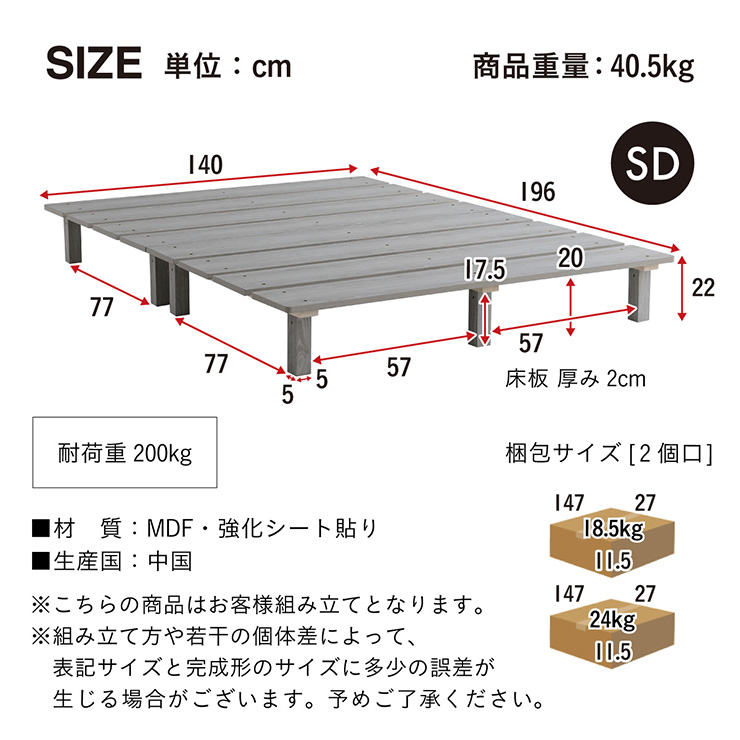 | サイズ | 本体:約W140 x D196 x H22cm(重量:約40.5kg) 床板の厚み:約2cm 耐荷重:200kg 梱包サイズ:約147 x 27 x 11.5cm(重量:約18.5kg)・約147 x 27 x 11.5cm(重量:約24kg) |