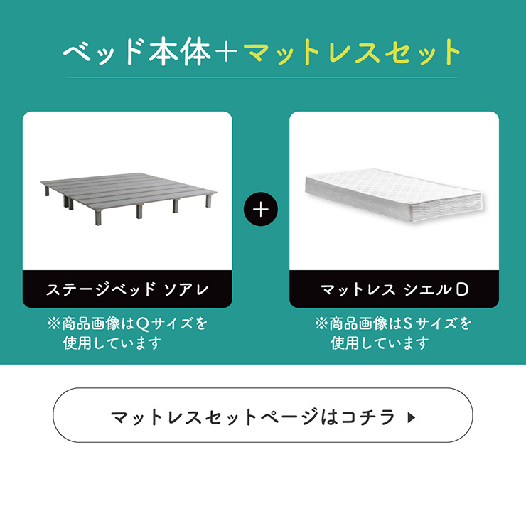 | ステージベッド Soares(ソアレ) 現代の暮らしにちょうどいいステージベッド ■美しい木目調 少しマットな質感と温かみある木目調が織りなす、洗礼デザイン ■無駄のないシンプルデザイン すっきりと見せてくれる直線的なフレーム ・床面の空きスペースは、スマホの充電やメガネや本などの小物置きに! ・ベッド下スペースがあるのでお掃除ロボットOK!床下収納にもお使いいただけます。 ■レイアウト自由自在 ヘッドレスだから、壁付けも中央配置もOKなフレキシブルベッド マットレスの置き方やレイアウトで様々なスタイルが可能です。 ■開放感のあるロースタイル 限られたスペースにも、余白を生むデザイン。低めの設計が、天井を高く感じさせ、視線を緩やかに。 ■通気性の良いすのこ 通気性の良いすのこ構造で、寝具も長持ち。清潔さと快適さを、兼ね備えます。 ■敷布団の使用もOK!耐荷重200kg、安定構想 頑丈なつくりで、安定性も確保。安心して使える強さを両立しました。 ■暮らしやすさを両立 ・面取り加工 ・脚部フェルト付き ※サイズの商品画像はQサイズを使用しております。 ※こちらの商品はお客様組み立てとなります。 ※組み立て方や若干の個体差によって、表記サイズと完成形のサイズに多少の誤差が生じる場合がございます。予めご了承ください。 ※マットレスの幅をぴったりに置きたい場合、1サイズ上げたサイズをご購入ください。 ※お掃除ロボットを使用する場合は、高さをご確認ください。 | |