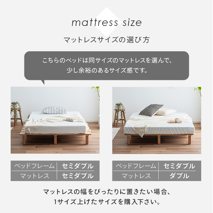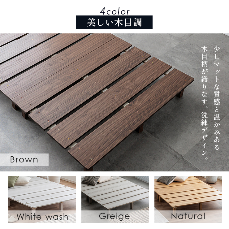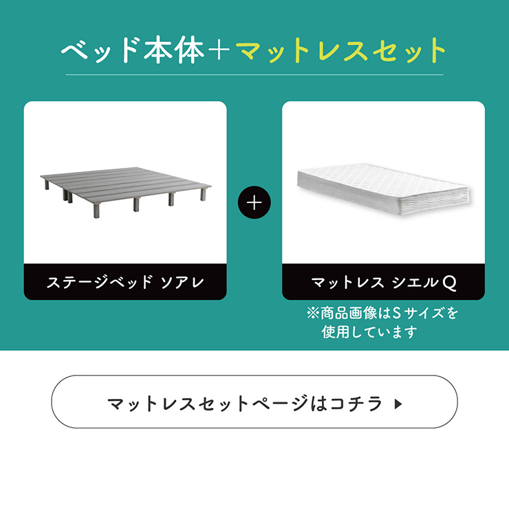 | ステージベッド Soares(ソアレ) 現代の暮らしにちょうどいいステージベッド ■美しい木目調 少しマットな質感と温かみある木目調が織りなす、洗礼デザイン ■無駄のないシンプルデザイン すっきりと見せてくれる直線的なフレーム ・床面の空きスペースは、スマホの充電やメガネや本などの小物置きに! ・ベッド下スペースがあるのでお掃除ロボットOK!床下収納にもお使いいただけます。 ■レイアウト自由自在 ヘッドレスだから、壁付けも中央配置もOKなフレキシブルベッド マットレスの置き方やレイアウトで様々なスタイルが可能です。 ■開放感のあるロースタイル 限られたスペースにも、余白を生むデザイン。低めの設計が、天井を高く感じさせ、視線を緩やかに。 ■通気性の良いすのこ 通気性の良いすのこ構造で、寝具も長持ち。清潔さと快適さを、兼ね備えます。 ■敷布団の使用もOK!耐荷重200kg、安定構想 頑丈なつくりで、安定性も確保。安心して使える強さを両立しました。 ■暮らしやすさを両立 ・面取り加工 ・脚部フェルト付き ※こちらの商品はお客様組み立てとなります。 ※組み立て方や若干の個体差によって、表記サイズと完成形のサイズに多少の誤差が生じる場合がございます。予めご了承ください。 ※マットレスの幅をぴったりに置きたい場合、1サイズ上げたサイズをご購入ください。 ※お掃除ロボットを使用する場合は、高さをご確認ください。 | |