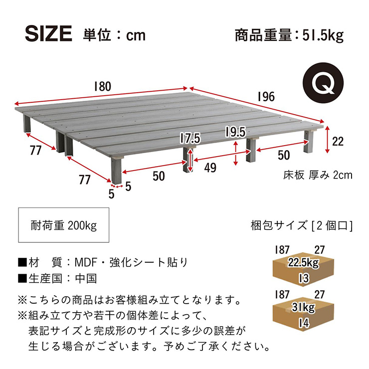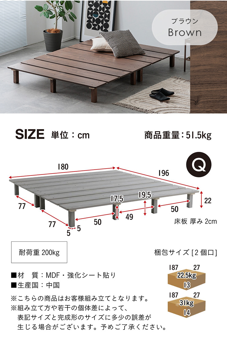 | サイズ | 本体:約W180 x D196 x H22cm(重量:約51.5kg) 床板の厚み:約2cm 耐荷重:200kg 梱包サイズ:約187 x 27 x 13cm(重量:約22.5kg)・約187 x 27 x 14cm(重量:約31kg) |