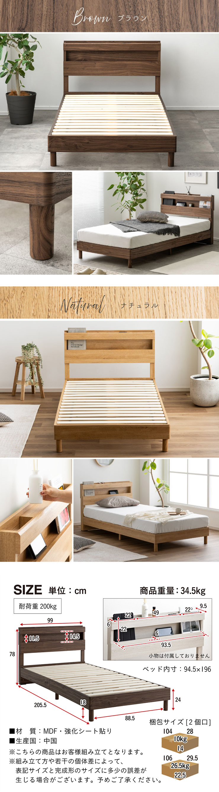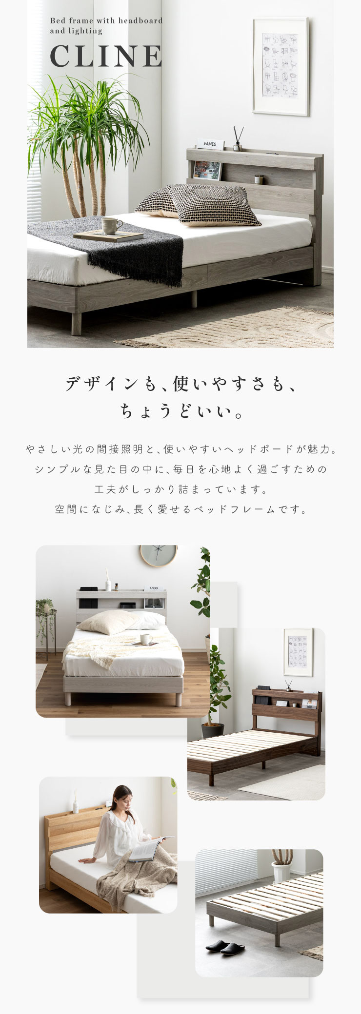 | 宮付きシングルベッド Cline(クライン) デザインも、使いやすさも、ちょうどいい。 やさしい光の間接照明と、使いやすいヘッドボードが魅力。 シンプルな見た目の中に、毎日を心地よく過ごすための工夫がしっかり詰まっています。 空間になじみ、長く愛せるベッドフレームです。 寝るとしまうを、もっと快適に。5つのポイント ・小物置きに便利なヘッドボード ・スマホ充電OK!コンセント付き ・通気性抜群のすのこ床板 ・左右変換可能な引き出し収納 ・フリーで使えるベッド下収納 ■Check Point ・お部屋に開放感が生まれるインテリアになじむナチュラルデザイン ・寝る前の時間も、もっと快適に。コンセント・照明付きのヘッドボード ・機能面もスマートに充実。毎日を快適にする、充実の機能性 ■ミニマルデザインで空間にゆとり シンプルなデザインは圧迫感を抑え、空間にゆとりを生み出します。 落ち着いたトーンの素材感が、心地良い開放感を演出します。 ■立ち座りしやすいちょうどいい高さ 立ち座りがスムーズで心地よく、朝の支度や就寝前の動きも快適に。 毎日にちょうどいい高さなんです。 ■こだわりの質感と洗練されたカラー 木目調の質感にもこだわり、自然なぬくもりと落ち着いたトーンでインテリアにすっとなじむ仕上がりに。 素材の深みと色合いが、ミニマルな空間をより上質に引き立てます。 ■寝る前の時間も、もっと快適に。コンセント・照明付きのヘッドボード 寝る前に読みたい本屋、メガネ・スマホなどの小物をサッと置ける便利な宮付き。 ベッドまわりがすっきり片付き、毎日の寝室時間がより快適に。 お気に入りの雑誌やディフューザーを飾って、自分だけのくつろぎ空間に。 好きなアイテムを並べるだけで、毎日のベッドまわりがちょっと特別に感じられます。 スライドカバー式コンセント付き <スマホの充電に便利な1口コンセント付き。br> スマホスタンドとしても スマホを立てかけられるスリット構造です。 ■やわらかな灯りで、癒しの空間に やわらかく灯る間接照明で、寝室を落ち着いた雰囲気に。 夜のリラックスタイムにもぴったりな、癒しのあかりです。 ■床面はすのこ仕様で通気性抜群 素材にはMDF&強化シートを採用。 美しさと強さを両立したハイブリッド素材で、キズや汚れに強いのが特徴です。 ベッド下は、ちょい置きスペースに。 かごやボックスを置いて、日用品や季節小物をすっきり。 見た目もきれいに、暮らし上手な空間づくりが叶います。 掃除もラクラク。 ホコリが溜まりやすいベッド下も、無理なくお手入れできて清潔をキープ ※こちらの商品はお客様組み立てとなります。 ※組み立て方や若干の個体差によって、表記サイズと完成形のサイズに多少の誤差が生じる場合がございます。あらかじめご了承ください。 | |