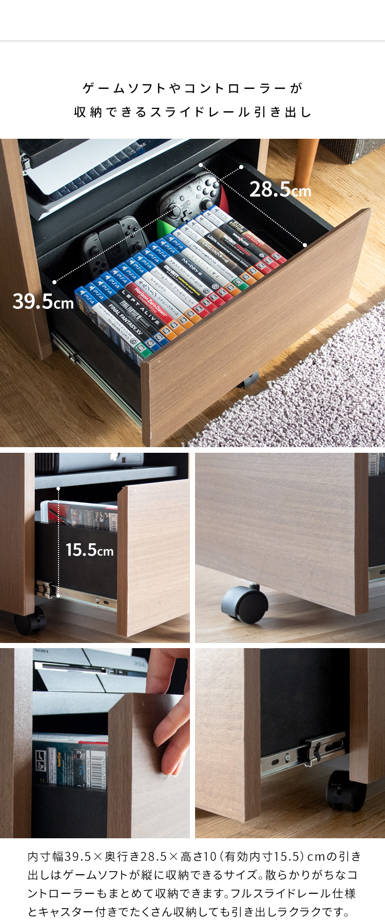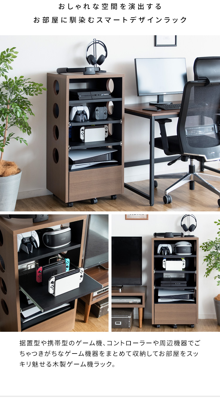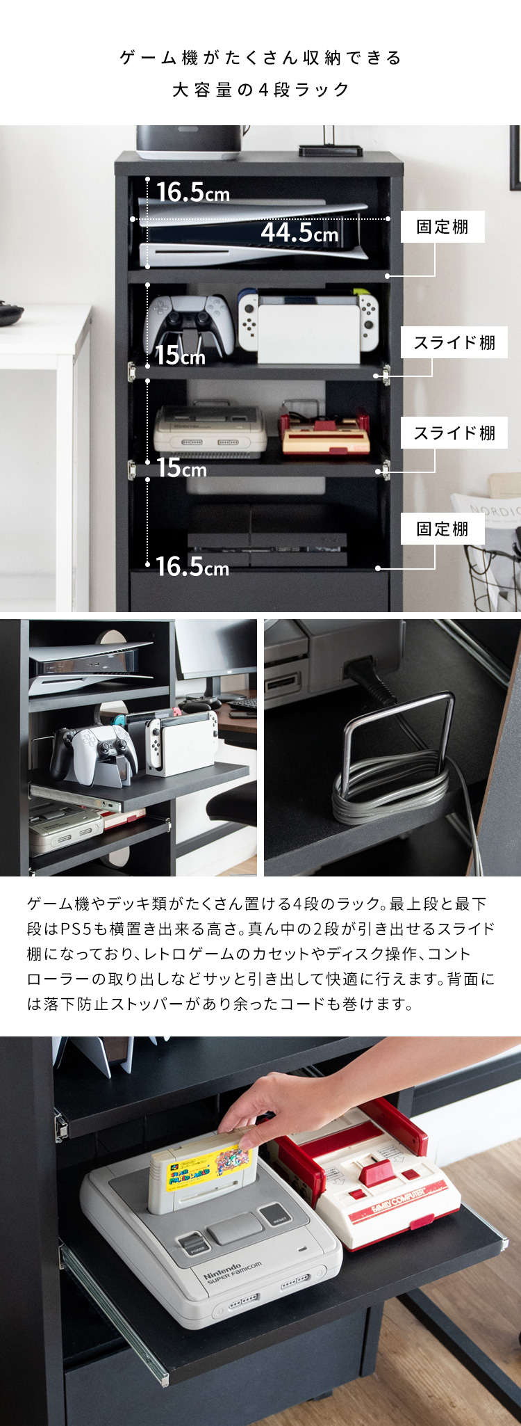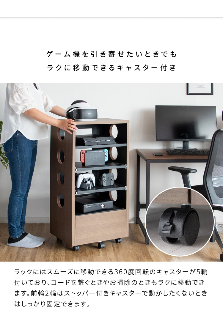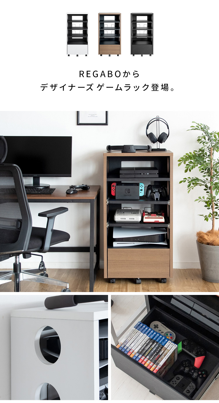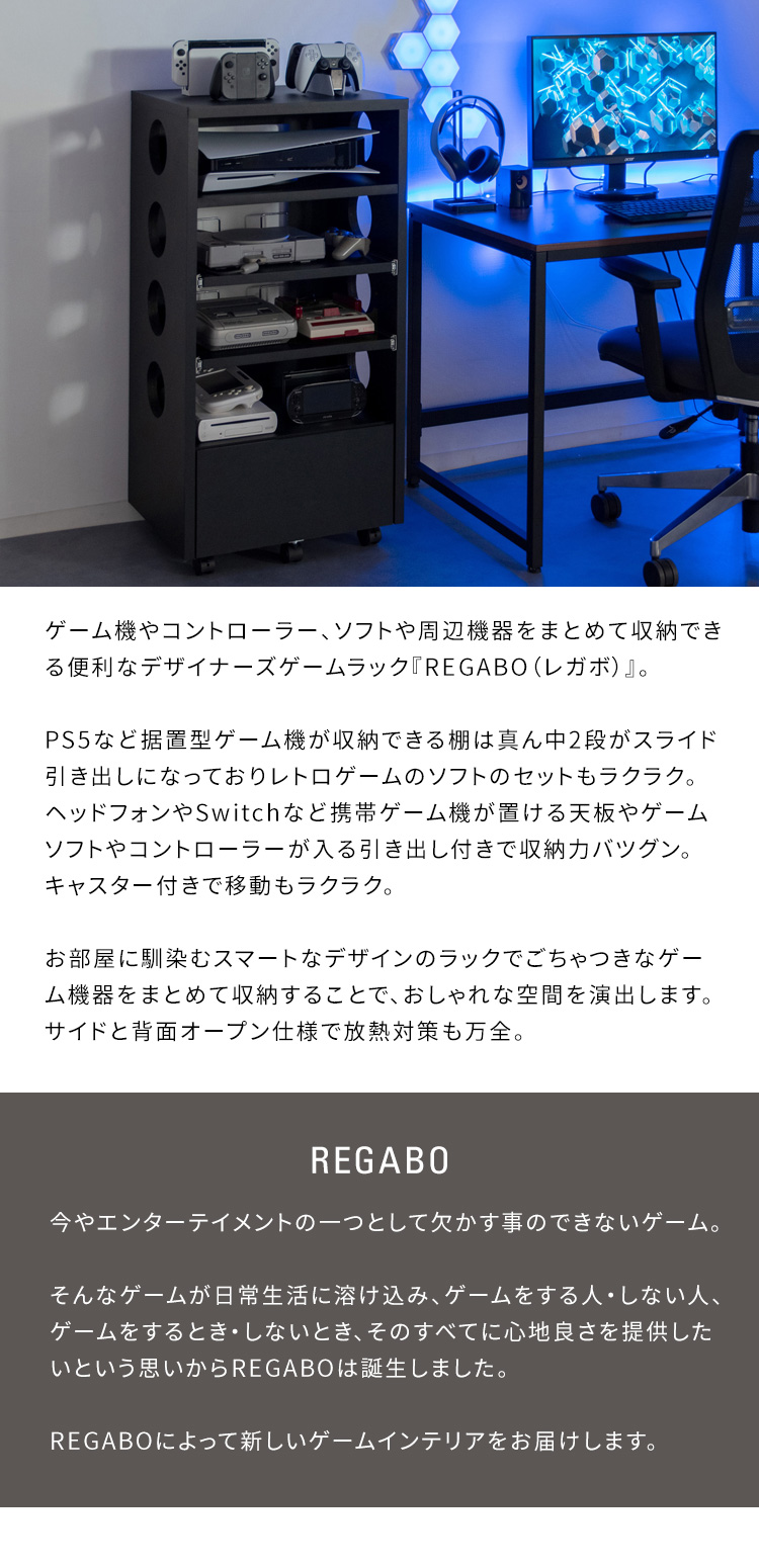 | デザイナーズゲームラック REGABO(レガボ) ゲーム機やコントローラー、ソフトや周辺機器をまとめて収納できる便利なデザイナーズゲームラック『REGABO(レガボ)』 PS5など据置型ゲーム機が収納できる棚は真ん中2段がスライド引き出しになっておりレトロゲームのソフトのセットもラクラク。 ヘッドフォンやSwitchなど携帯ゲーム機が置ける天板やゲームソフトやコントローラーが入る引き出し付きで収納力バツグン。キャスター付きで移動もラクラク。 お部屋に馴染むスマートなデザインのラックでごちゃつきなゲーム機器をまとめて収納することで、おしゃれな空間を演出します。サイドと背面オープン仕様で放熱対策も万全。 ■お部屋になじむスマートデザイン 据え置き型や携帯型ゲーム機、コントローラーや周辺機器でごちゃつきがちなゲーム機器をまとめて収納してお部屋をすっきり見せる木製ゲーム機ラック。 ゲーム機がたくさん収納できるのでゲーム生活が快適に。 ■ヘッドフォンや周辺機器もサッと置けて取り出せる天板 ヘッドフォンや周辺機器、携帯ゲーム機など色々置ける便利な天板。switchのリングフィットやVRゴーグルなどゲーム時に使いたいものをサッと取り出せます。 ■ゲーム機がたくさん収納できる大容量4段ラック ゲーム機やデッキ類がたくさん置ける4段ラック。最上段はPS5も横置きできる高さ。 真ん中の2段が引き出せるスライド棚になっており、レトロゲームのカセットやディスク操作、コントローラーの取り出しなどサッと引き出して快適に行えます。 背面には落下防止のストッパーがあり余ったコードも巻けます。 ■ゲームソフトやコントローラーが収納できるスライドレール引き出し 引き出しはゲームソフトが縦に収納できるサイズ。散らかりがちなコントローラーもまとめて収納できます。 フルスライドレール仕様とキャスター付きでたくさん収納しても引き出しラクラク。 ■ゲーム機を引き寄せたい時でも楽に移動できるキャスター付き ラックにはスムーズに移動できる360度回転のキャスターが5輪付いており、コードを繋ぐ時やお掃除の時もラクに移動できます。 前輪2輪はストッパー付きキャスターで動かしたくない時はしっかりと固定できます。 ■オープン仕様で放熱対策も万全 サイドと背面が空いたオープン仕様でゲーム機使用中の放熱対策もバッチリ ■長く使えるこだわり素材と設計 ・傷に強い合成樹脂貼りの素材でゲーム機を安心して置けます。 ・背面にはガタツキ防止器具付きで引き出しの出し入れも快適です。 ※こちらの商品はお客様組み立てとなります。組み立て時間:約30分 ※この製品は株式会社ソニー及び任天堂株式会社のライセンス商品ではありません。 ※PS5は株式会社ソニー・インタラクティブエンタティンメントの商標、SwitchはNintendoSwitchは任天堂の商標です。 ※本製品は収納ラックのみです。ゲーム本体やコントローラーなどは含まれておりません。 ※若干の個体差によって、表記サイズと完成形のサイズに多少の誤差が生じる場合がございます。 | |
