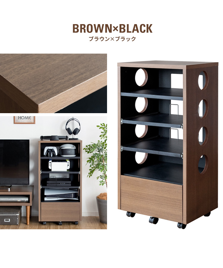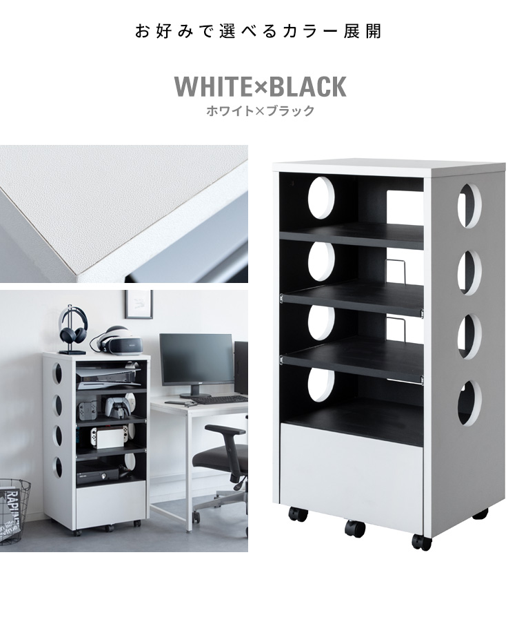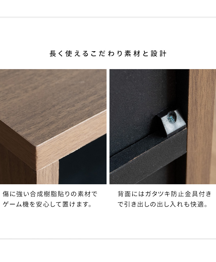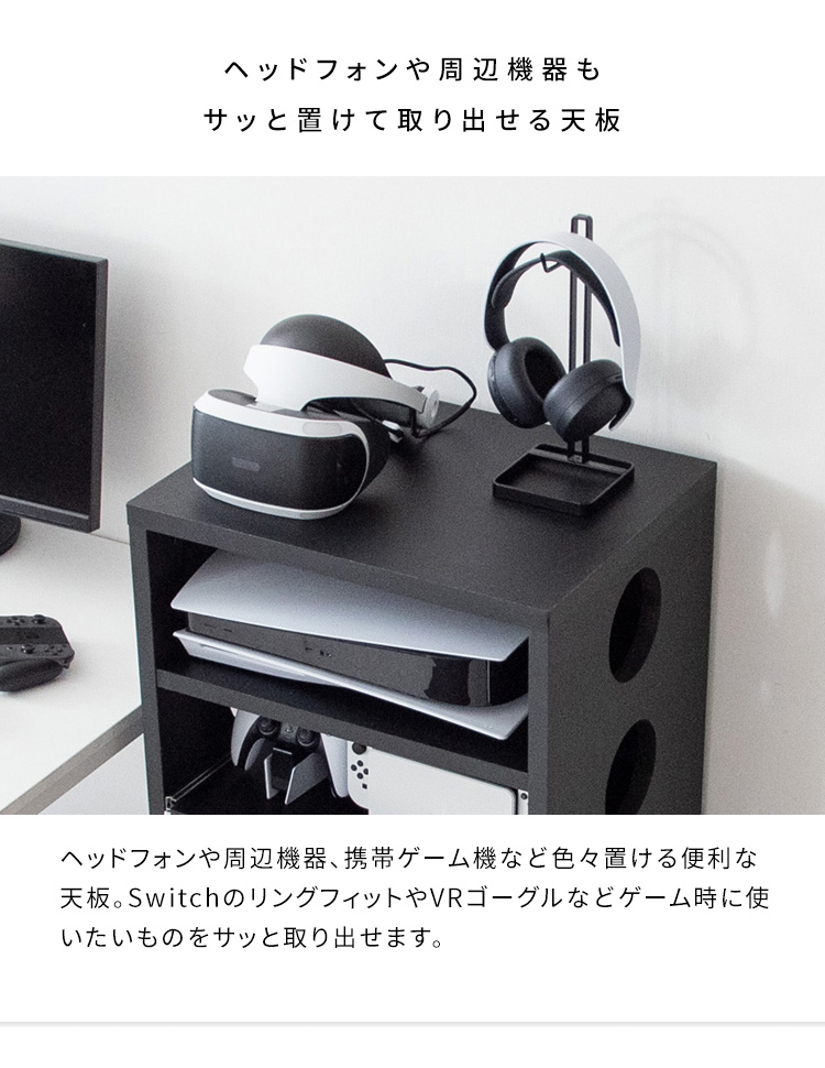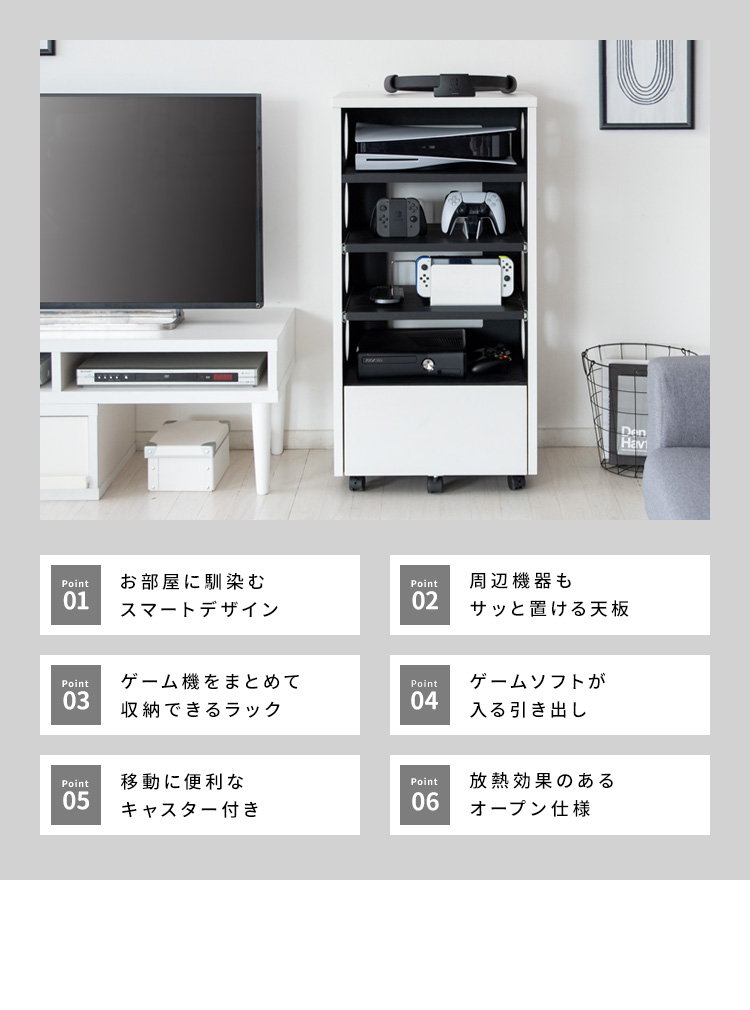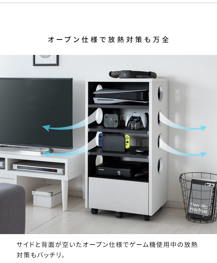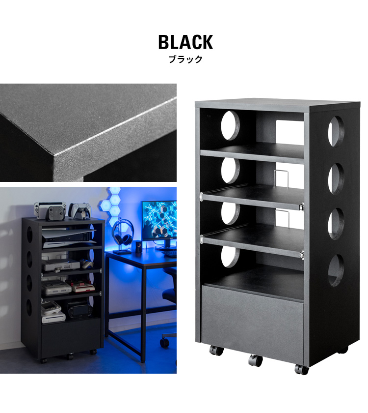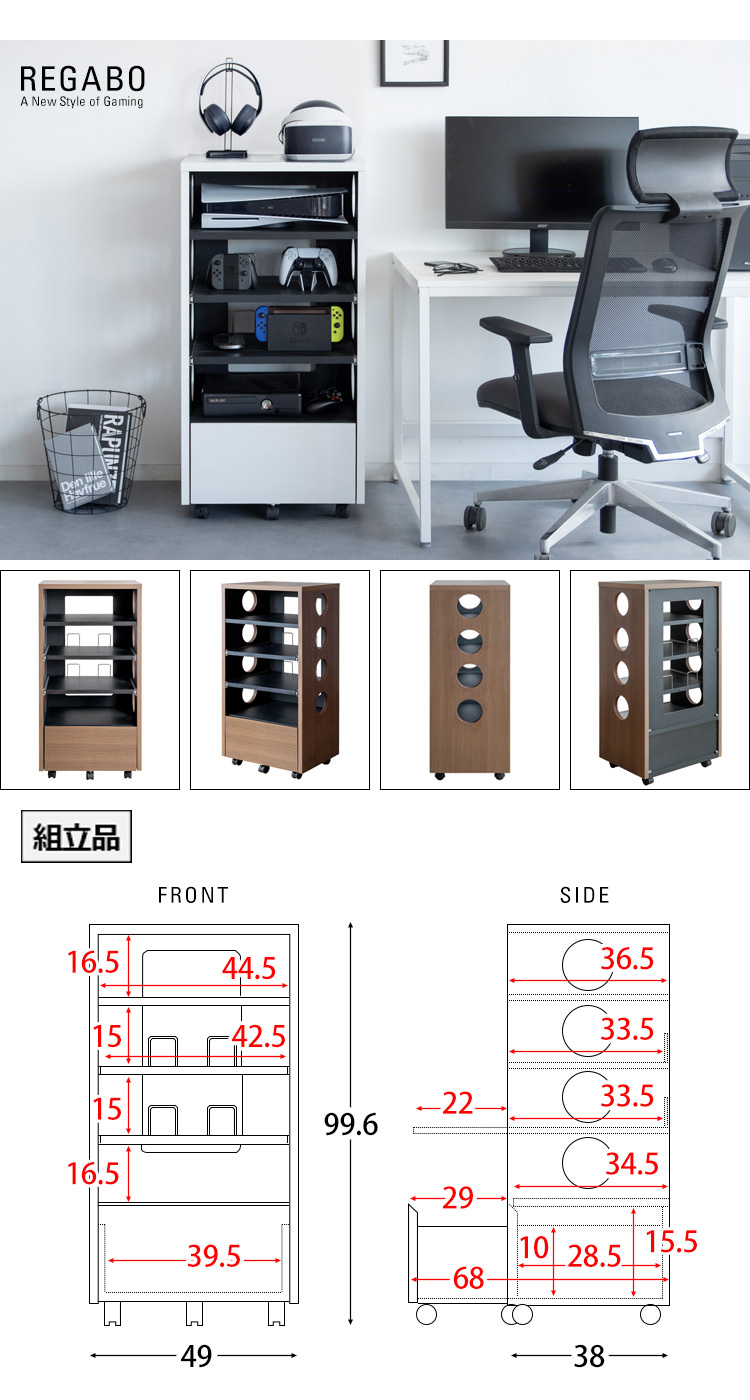 | デザイナーズゲームラック REGABO(レガボ) ゲーム機やコントローラー、ソフトや周辺機器をまとめて収納できる便利なデザイナーズゲームラック『REGABO(レガボ)』 PS5など据置型ゲーム機が収納できる棚は真ん中2段がスライド引き出しになっておりレトロゲームのソフトのセットもラクラク。 ヘッドフォンやSwitchなど携帯ゲーム機が置ける天板やゲームソフトやコントローラーが入る引き出し付きで収納力バツグン。キャスター付きで移動もラクラク。 お部屋に馴染むスマートなデザインのラックでごちゃつきなゲーム機器をまとめて収納することで、おしゃれな空間を演出します。サイドと背面オープン仕様で放熱対策も万全。 ■お部屋になじむスマートデザイン 据え置き型や携帯型ゲーム機、コントローラーや周辺機器でごちゃつきがちなゲーム機器をまとめて収納してお部屋をすっきり見せる木製ゲーム機ラック。 ゲーム機がたくさん収納できるのでゲーム生活が快適に。 ■ヘッドフォンや周辺機器もサッと置けて取り出せる天板 ヘッドフォンや周辺機器、携帯ゲーム機など色々置ける便利な天板。switchのリングフィットやVRゴーグルなどゲーム時に使いたいものをサッと取り出せます。 ■ゲーム機がたくさん収納できる大容量4段ラック ゲーム機やデッキ類がたくさん置ける4段ラック。最上段はPS5も横置きできる高さ。 真ん中の2段が引き出せるスライド棚になっており、レトロゲームのカセットやディスク操作、コントローラーの取り出しなどサッと引き出して快適に行えます。 背面には落下防止のストッパーがあり余ったコードも巻けます。 ■ゲームソフトやコントローラーが収納できるスライドレール引き出し 引き出しはゲームソフトが縦に収納できるサイズ。散らかりがちなコントローラーもまとめて収納できます。 フルスライドレール仕様とキャスター付きでたくさん収納しても引き出しラクラク。 ■ゲーム機を引き寄せたい時でも楽に移動できるキャスター付き ラックにはスムーズに移動できる360度回転のキャスターが5輪付いており、コードを繋ぐ時やお掃除の時もラクに移動できます。 前輪2輪はストッパー付きキャスターで動かしたくない時はしっかりと固定できます。 ■オープン仕様で放熱対策も万全 サイドと背面が空いたオープン仕様でゲーム機使用中の放熱対策もバッチリ ■長く使えるこだわり素材と設計 ・傷に強い合成樹脂貼りの素材でゲーム機を安心して置けます。 ・背面にはガタツキ防止器具付きで引き出しの出し入れも快適です。 ※こちらの商品はお客様組み立てとなります。組み立て時間:約30分 ※この製品は株式会社ソニー及び任天堂株式会社のライセンス商品ではありません。 ※PS5は株式会社ソニー・インタラクティブエンタティンメントの商標、SwitchはNintendoSwitchは任天堂の商標です。 ※本製品は収納ラックのみです。ゲーム本体やコントローラーなどは含まれておりません。 ※若干の個体差によって、表記サイズと完成形のサイズに多少の誤差が生じる場合がございます。 | |