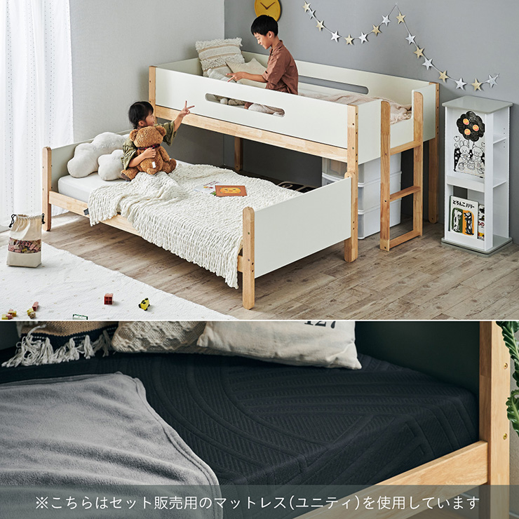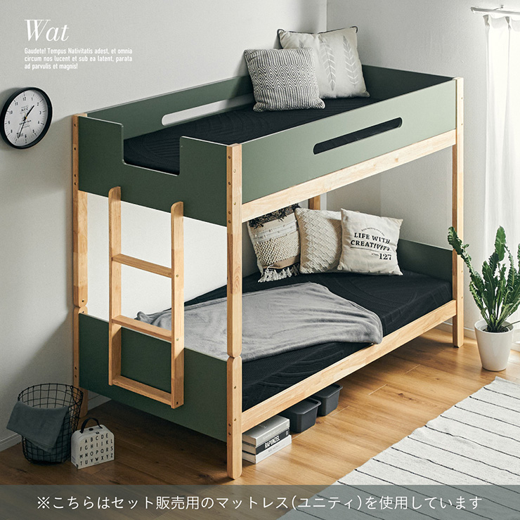 | 2段ベッド マットレスセット Wat(ワット)+Unity(ユニティ) ベッド本体+マットレス2枚セットの販売ページです。 ■大きくなっても使えるポイントがたくさん ・選べる4color ・分割仕様OK ・省スペースな垂直はしご ・広い収納スペース ■Point 01.分割仕様で長く使える セパレートタイプなのでシングルベッドとしても◎ ■Point 02.ベッド下を収納に使える高めの設計 ベッド下を収納など自由なスペースに。 ■Point 03.省スペースな固定式はしご お子様の寝顔も見られる、ベッド高107cm ■safety 毎日安心して使える角丸設計 ■耐震仕様 連結部はダボだけでなくビスで固定する二重固定で、横揺れの対策をしています。 第三者検査機関の耐荷重試験を合格 ※耐荷重検査は静止耐荷重です。ベッドの上で激しく動く、急激な力を加える、飛び跳ねるなど1点に集中して負荷をかける行為はお控えください。 ※本商品はお客様による組み立てが必要です。 ※こちらの商品はベッド本体+マットレス2枚セットの販売となります。 ※組み立て方や個体差により、表記サイズと完成サイズに誤差が生じる場合があります。 ※マットレスは厚さ15cm以上20cm未満の硬めタイプをご使用ください。 ※LVLポードは素材の特性上、キズや加工跡が見られる場合がありますが、強度や性能に影響はありません。見た目による返品・交換は承れません。。 | |