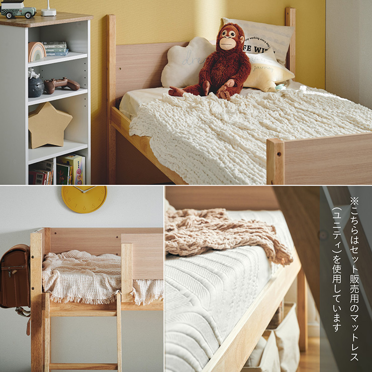 | 2段ベッド マットレスセット Saber(サーベル)+Unity(ユニティ) ベッド本体+マットレス2枚セットの販売ページです。 ■長く使えるポイントがたくさん ・シンプルなデザイン&カラー ・分割仕様OK ・斜めはしごで登りやすい ・ベッド下に収納スペース ■ラバーウッド材×ナチュラルカラー どんな空間にも溶け込む柔らかな存在感 ■Point 01.広い下段スペース シーズンオフ用品の収納に最適なスペース 広い空間高で成長後も安心、ゆとりの空間 ■Point 02.分割仕様で長く使える 子供部屋に。 一人暮らし用のベッドとしても ■Point 03.斜めはしごで登りやすい安全設計 はしごは左右付け替えが可能。 お部屋の間取りに合わせて左右どちらに付けるか選べるので、レイアウトで迷う必要もありません。 ■耐震仕様 連結部はダボだけでなくビスで固定する二重固定で、横揺れの対策をしています。 第三者検査機関の耐荷重試験を合格 ※耐荷重検査は静止耐荷重です。ベッドの上で激しく動く、急激な力を加える、飛び跳ねるなど1点に集中して負荷をかける行為はお控えください。 ※本商品はお客様による組み立てが必要です。 ※こちらの商品はベッド本体+マットレス2枚セットの販売となります。 ※組み立て方や個体差により、表記サイズと完成サイズに誤差が生じる場合があります。 ※マットレスは厚さ15cm以上20cm未満の硬めタイプをご使用ください。 ※LVLポードは素材の特性上、キズや加工跡が見られる場合がありますが、強度や性能に影響はありません。見た目による返品・交換は承れません。 | |
