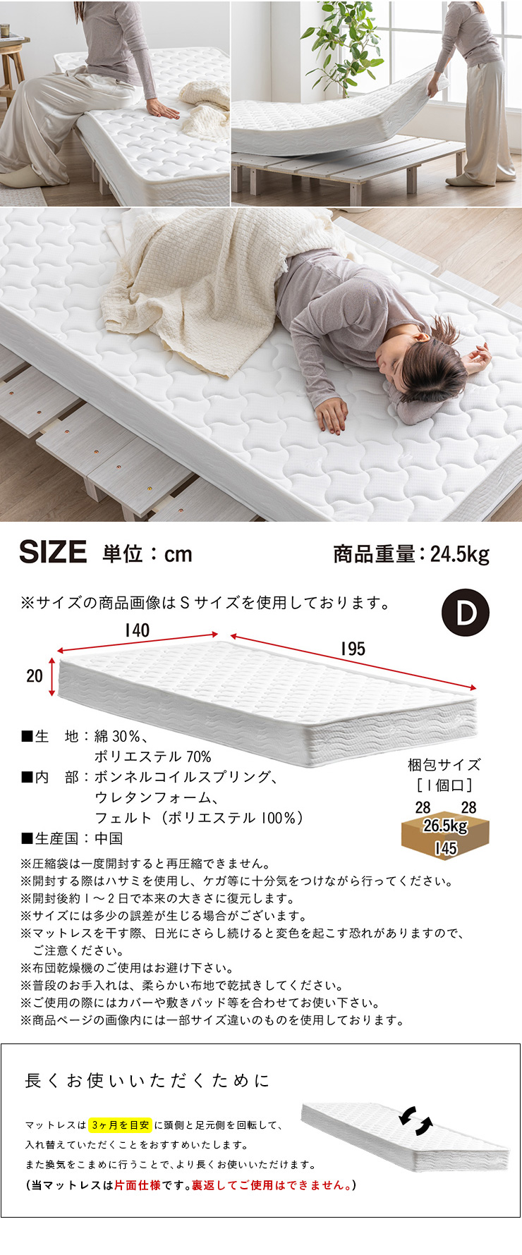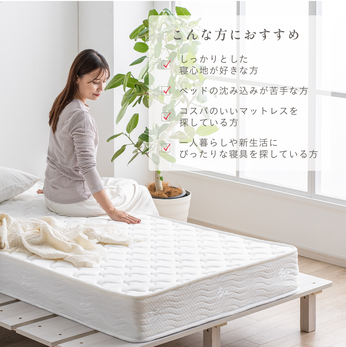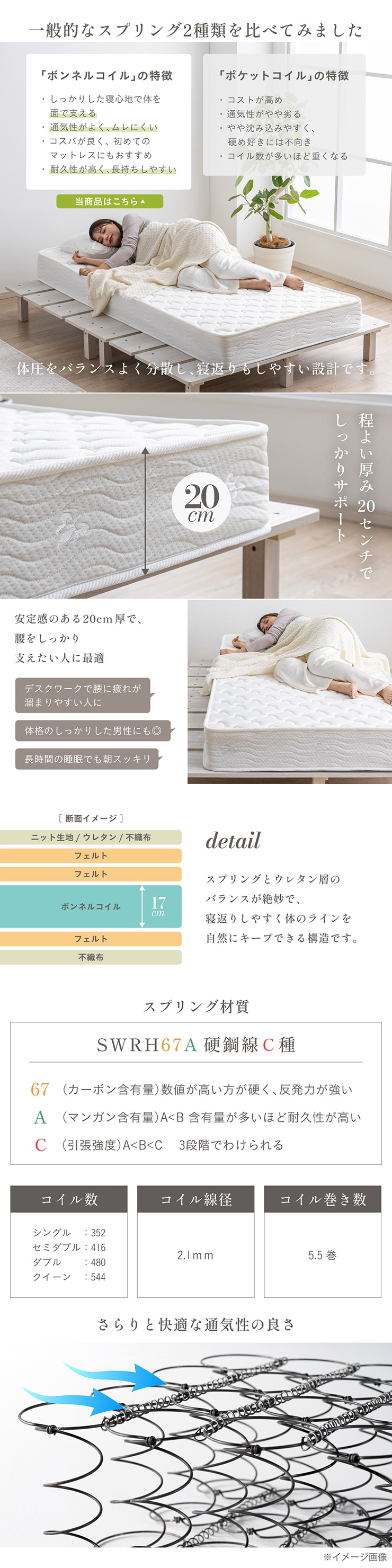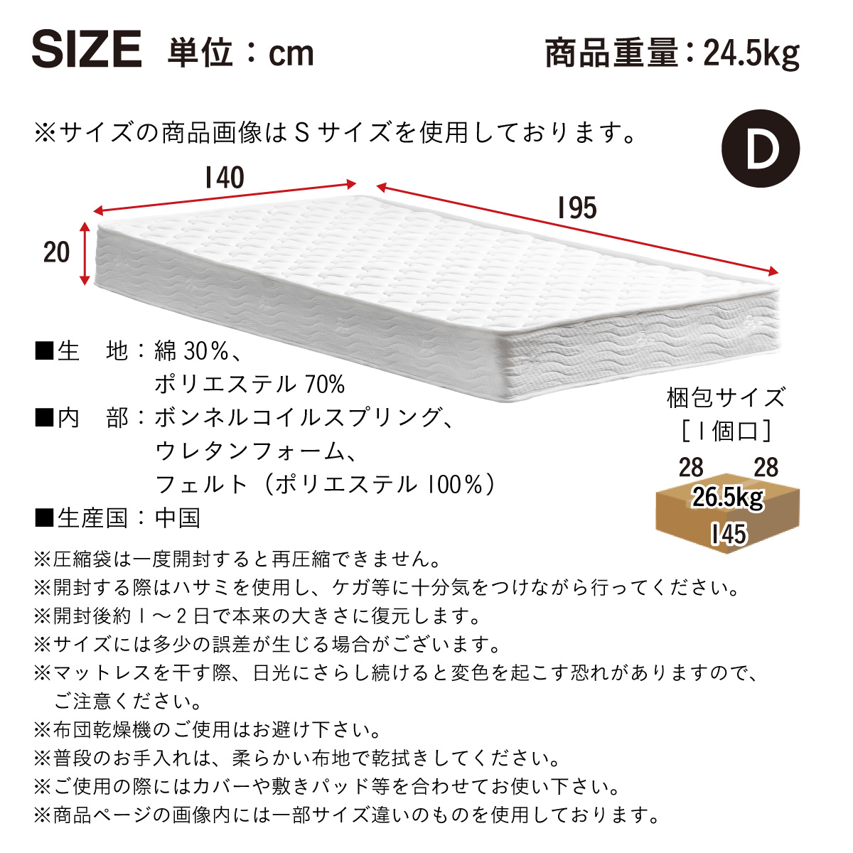 | ボンネルコイルマットレス ダブルサイズ Ciel(シエル) 厚み20cmのボンネルコイルマットレスは、「しっかり支えるx快適な寝心地x清潔設計」を兼ね備えた万能モデル。 毎日の眠りを心地よくサポートする一枚です。 ■程よい厚み20cmでしっかりサポート 安定感のある20cm厚で、腰をしっかり支えたい人に最適 ■detail スプリングとウレタン層のバランスが絶妙で、寝返りしやすく体のラインを自然にキープできる構造です。 スプリング素材:SWRH67A硬鋼線C種 ■伸縮性にすぐれたニット生地 伸縮性があるため、寝返りをうっても生地が突っ張らず、ふんわりとした寝心地。 ※サイズ画像はSサイズを使用しております。 ※圧縮袋は一度開封すると再圧縮できません。 ※開封する際はハサミを使用し、ケガ等に十分気をつけながら行ってください。 ※開封後約1~2日で本来の大きさに復元します。 ※サイズには多少の誤差が生じる場合がございます。 ※マットレスを干す際、日光にさらし続けると変色を起こす恐れがありますので、ご注意ください。 ※布団乾燥機のご使用はお避け下さい。 ※普段のお手入れは、柔らかい布地で乾拭きしてください。 ※ご使用の際にはカバーや敷きバッド等を合わせてお使い下さい。 ※商品ページの画像内には一部サイズ違いのものを使用しております。 ※マットレスは3か月を目安に頭と足元側を回転して、入れ替えていただくことをおすすめします。また喚起をこまめに行うことで、より長くお使いいただけます。 ※当マットレスは片面仕様です。裏返してご使用はできません。 | |