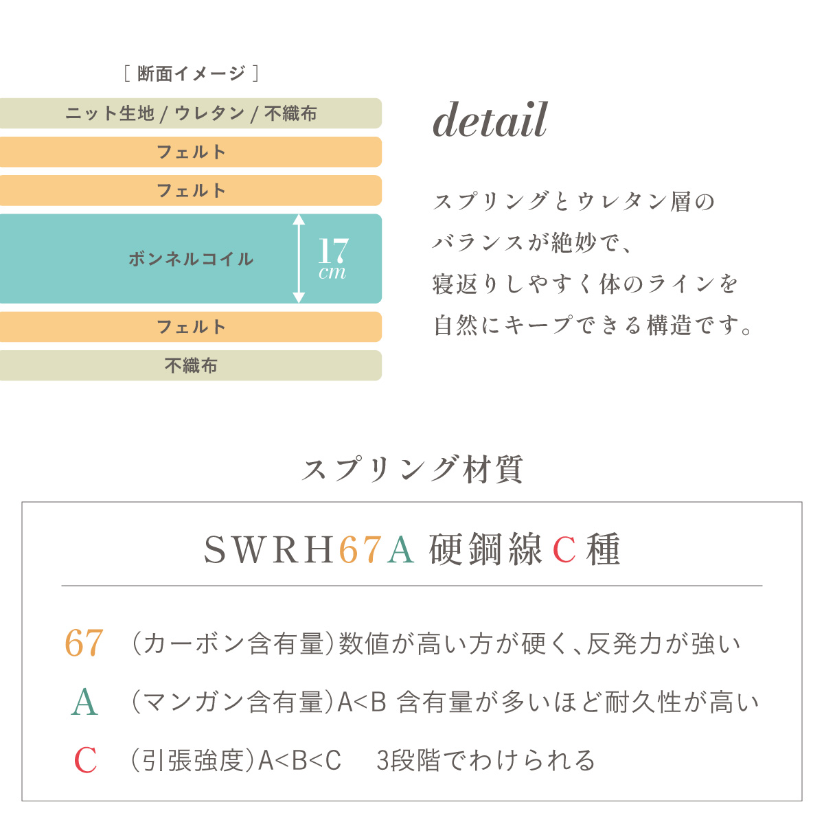 | 材質・素材 | 生地:綿30%・ポリエステル70% 内部:ボンネルコイルスプリング・ウレタンフォーム・フェルト(ポリエステル100%) |