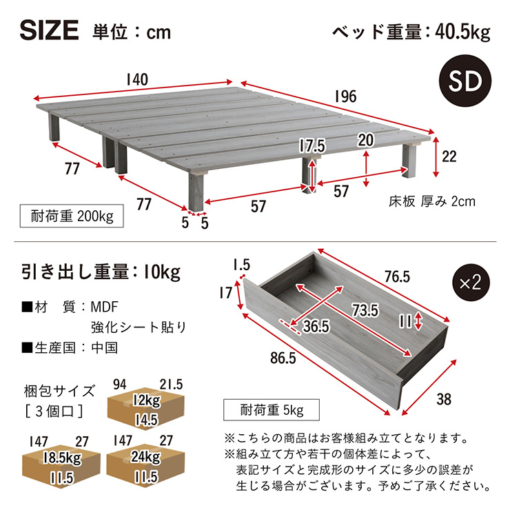 | サイズ | ベッド:約W140 x D196 x H22cm(重量:約40.5kg) 床板の厚み:約2cm 耐荷重:200kg 引き出し:約W86.5 x D38 x H17cm(重量:約10kg) 内寸:約W73.5 x D36.5 x H11cm 耐荷重:5kg 梱包(3個口):約147 x 27 x 11.5cm(重量:約18.5kg)・約147 x 27 x 11.5cm(重量:約24kg)・約94 x 21.5 x 14.5cm(重量:約12kg) |