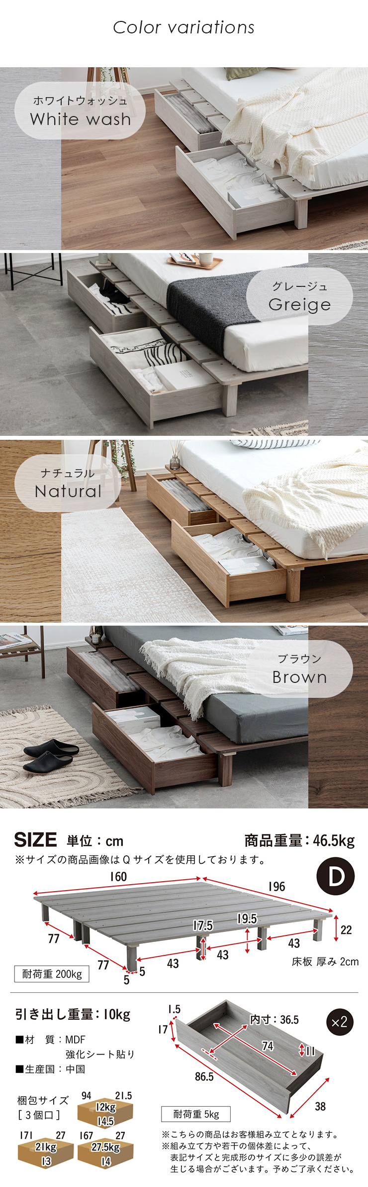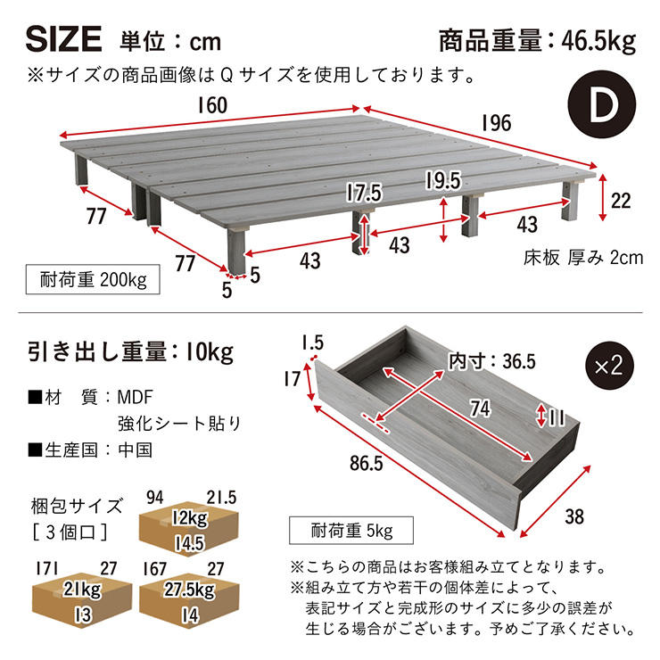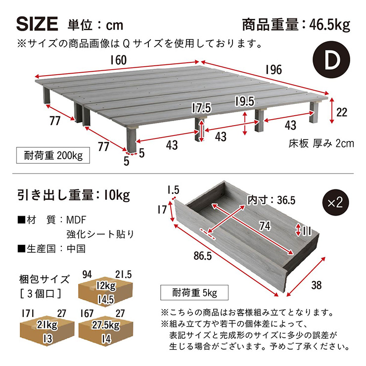 | サイズ | 本体:約W160 x D196 x H22cm(重量:約46.5kg) 床板の厚み:約2cm 耐荷重:200kg 引き出し:約W86.5 x D38 x H17cm(重量:約10kg) 内寸:約W74 x D36.5 x H11cm 耐荷重:5kg 梱包(3個口):約171 x 27 x 13cm(重量:約21kg)・約167 x 27 x 14cm(重量:約27.5kg)・約94 x 21.5 x 14.5cm(重量:約12kg) |