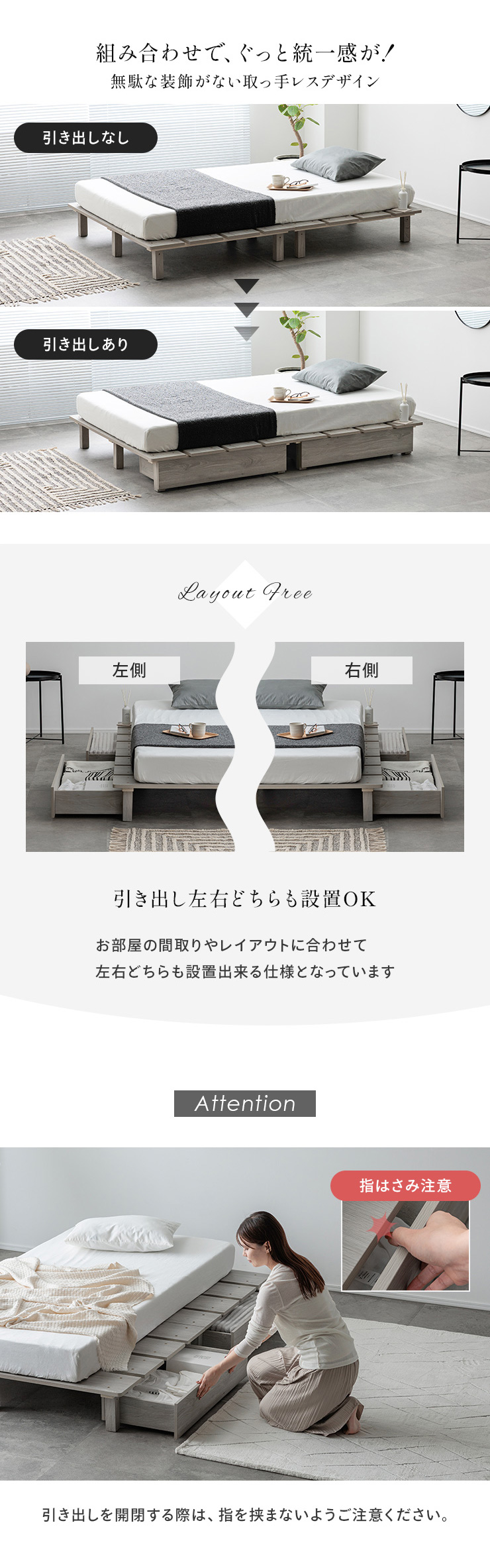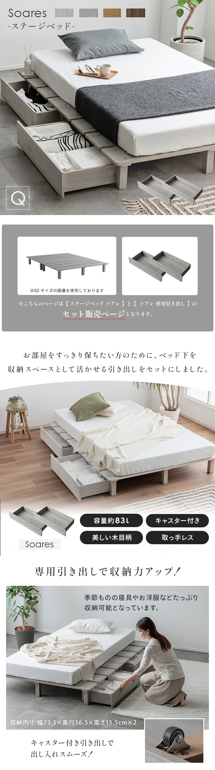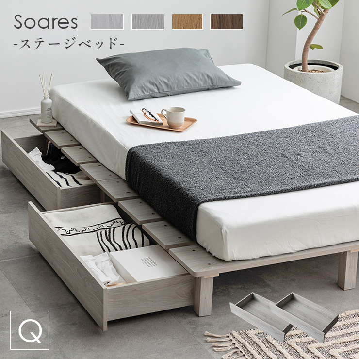 | ステージベッド+専用引き出し 2杯セット Soares(ソアレ) 【ステージベッドソアレ】と【ソアレ専用引き出し】のセットページとなります。 お部屋をすっきり保ちたい方のために、ベッド下を収納スペースとして活かせる引き出しをセットにしました。 ■専用引き出しで収納アップ! 季節ものの寝具やお洋服などたっぷり収納可能となっています。 キャスター付き引き出しで出し入れスムーズ! ■組み合わせで、グッと統一感が! 無駄な装飾がない取っ手レスデザイン ■引き出し左右どちらも設置OK お部屋の間取りやレイアウトに合わせて左右どちらも設置できる仕様となっています。 ※こちらの商品はお客様組み立てとなります。 ※こちらの商品はステージベッド+引き出しのセット販売となります。 ※引き出しを開閉する際は、指を挟まないようご注意ください。 ※組み立て方や若干の個体差によって、表記サイズと完成形のサイズに多少の誤差が生じる場合がございます。予めご了承ください。 | |