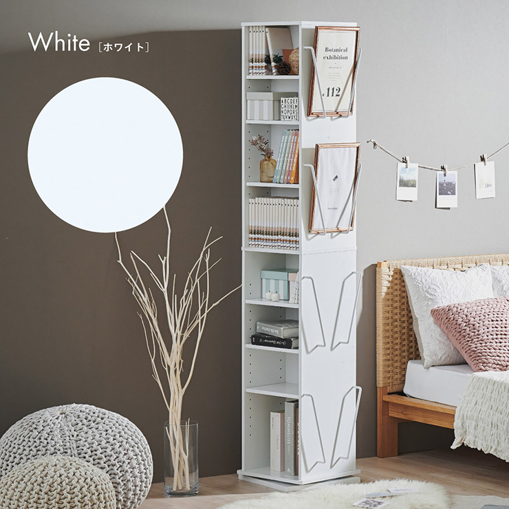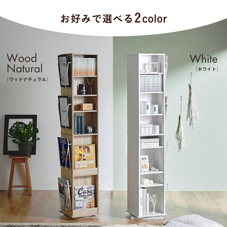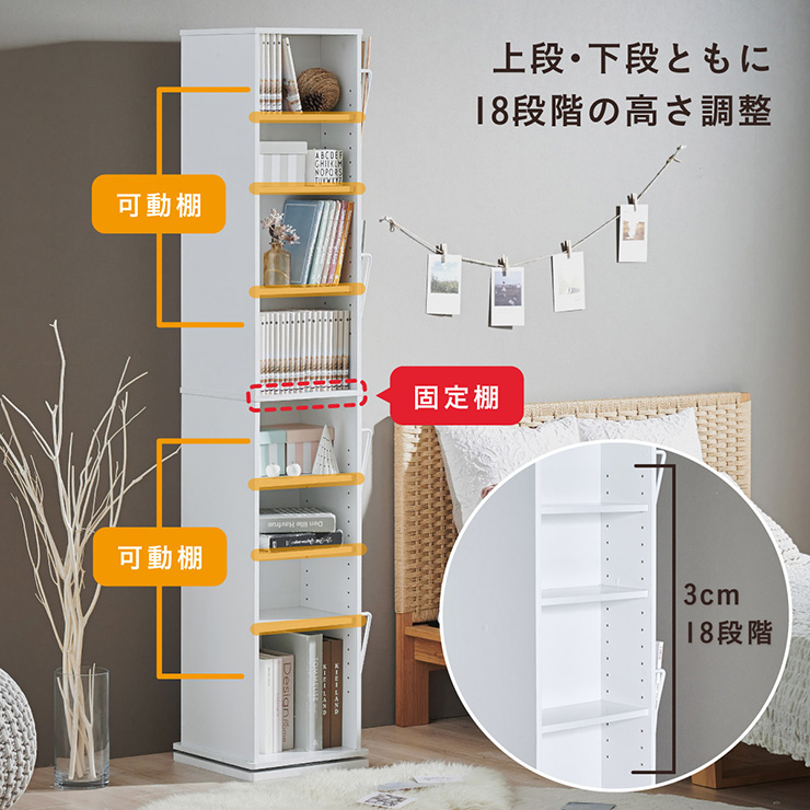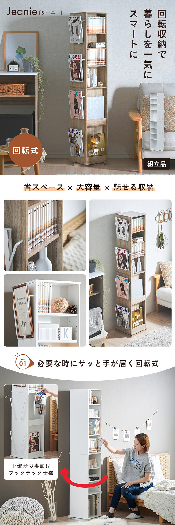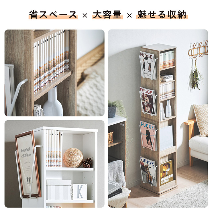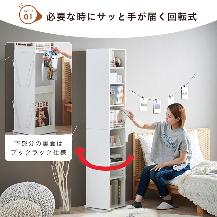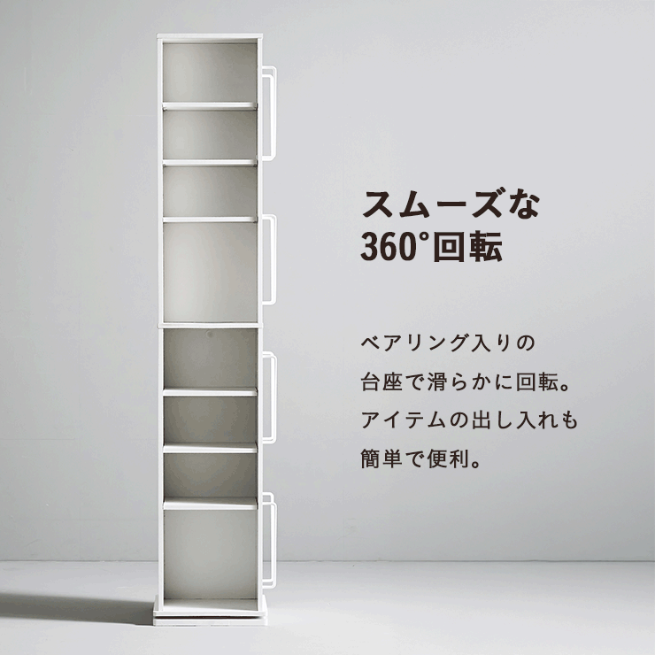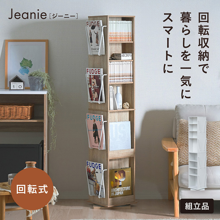 | 回転収納で暮らしを一気にスマートに Jeanie(ジーニー) 省スペース×大容量×魅せる収納 ■必要なときにサッと手が届く圧倒的に使いやすい回転式 下部分の裏面はブックラック仕様 ■省スペース設計 限られたスペースにもスッキリ収まるスリムなデザイン ※回転式のため設置の際は約42cm四方のスペースが必要となります。 ■奥行き違いの上下×6枚の可動棚 サイズに合わせて本や小物を無駄なく収納◎ 「使いやすさ」を極限まで追求 スリムな奥行き ワイドな奥行き 上段・下段ともに18段階の高さ調節 ■魅せて楽しむ収納 収納もインテリアも一気に格上げする、スマートデザイン おしゃれなアイアンで魅せる、スタイリッシュ空間 ■2段のブックラックがお部屋を彩る 厚み3cmの本や雑誌も飾れる、魅せるインテリア◎ ■家族で使えるスマート収納 みんなが使いやすい共有スペースに ※こちらの商品はお客様組み立てとなります。 ※組み立て方や若干の個体差によって、表記サイズと完成形のサイズに多少の誤差が生じる場合がございます。あらかじめご了承ください。 | |