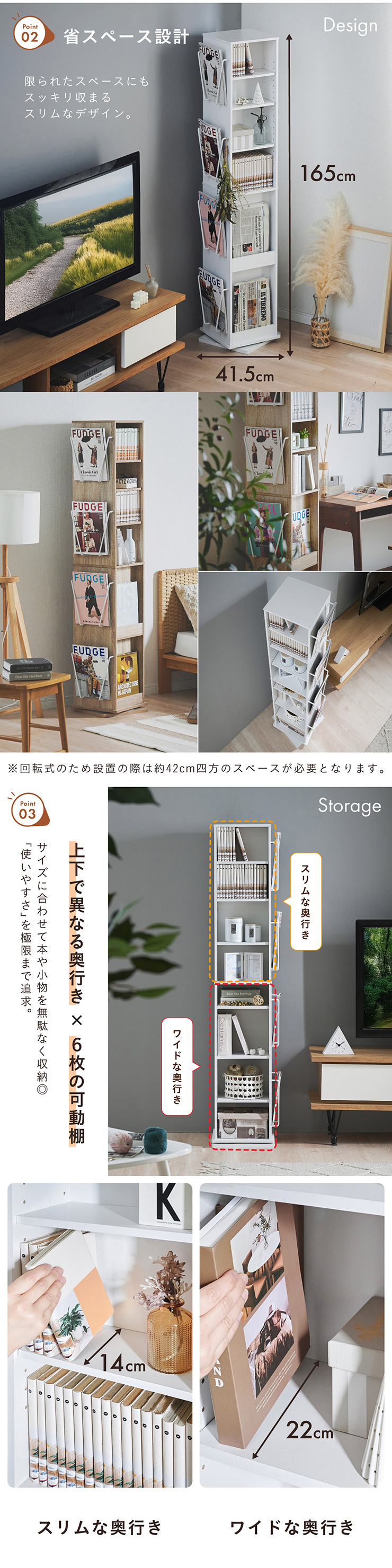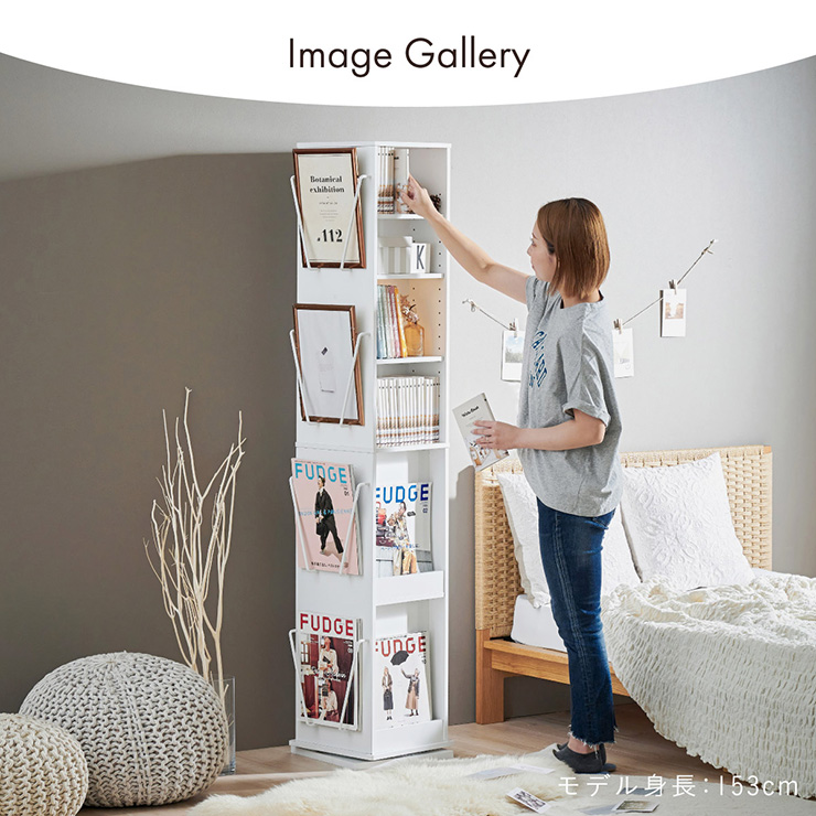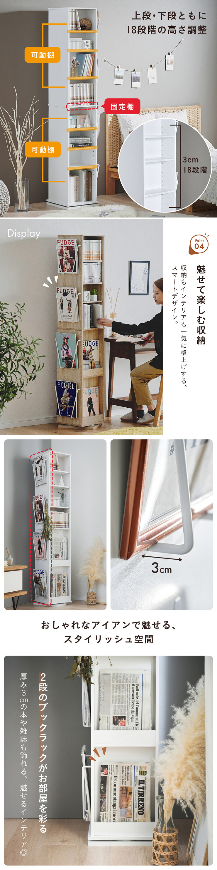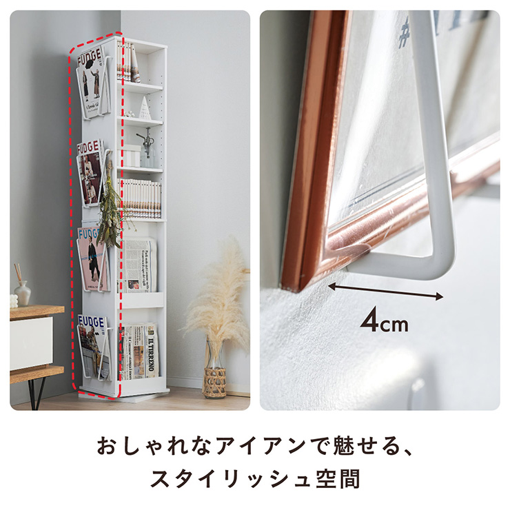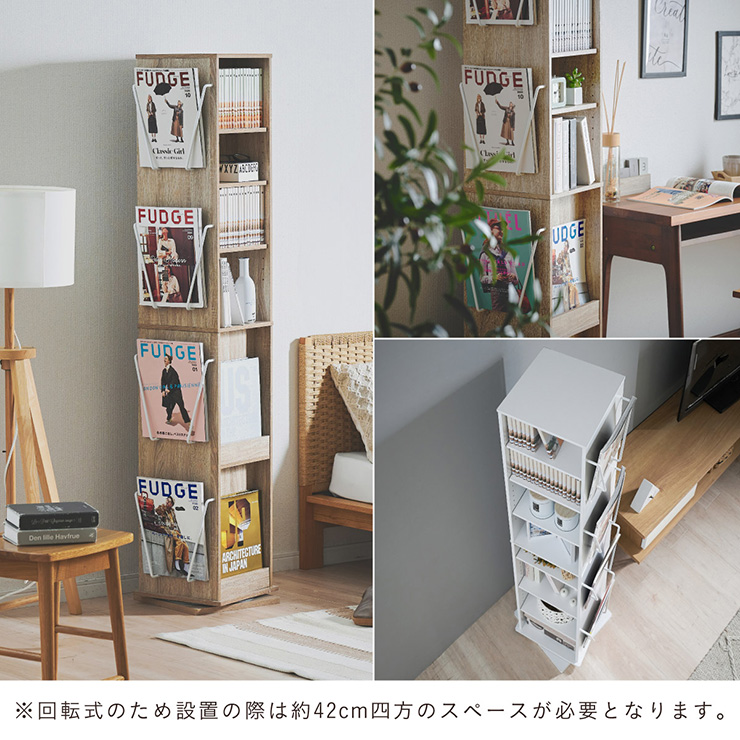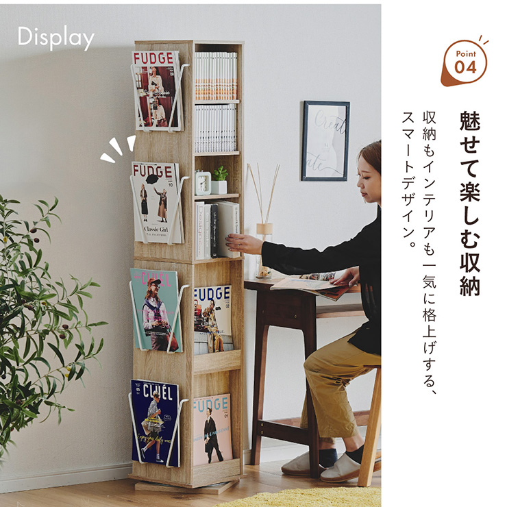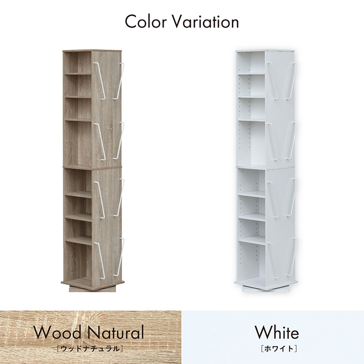 | 回転収納で暮らしを一気にスマートに Jeanie(ジーニー) 省スペース×大容量×魅せる収納 ■必要なときにサッと手が届く圧倒的に使いやすい回転式 下部分の裏面はブックラック仕様 ■省スペース設計 限られたスペースにもスッキリ収まるスリムなデザイン ※回転式のため設置の際は約42cm四方のスペースが必要となります。 ■奥行き違いの上下×6枚の可動棚 サイズに合わせて本や小物を無駄なく収納◎ 「使いやすさ」を極限まで追求 スリムな奥行き ワイドな奥行き 上段・下段ともに18段階の高さ調節 ■魅せて楽しむ収納 収納もインテリアも一気に格上げする、スマートデザイン おしゃれなアイアンで魅せる、スタイリッシュ空間 ■2段のブックラックがお部屋を彩る 厚み3cmの本や雑誌も飾れる、魅せるインテリア◎ ■家族で使えるスマート収納 みんなが使いやすい共有スペースに ※こちらの商品はお客様組み立てとなります。 ※組み立て方や若干の個体差によって、表記サイズと完成形のサイズに多少の誤差が生じる場合がございます。あらかじめご了承ください。 | |