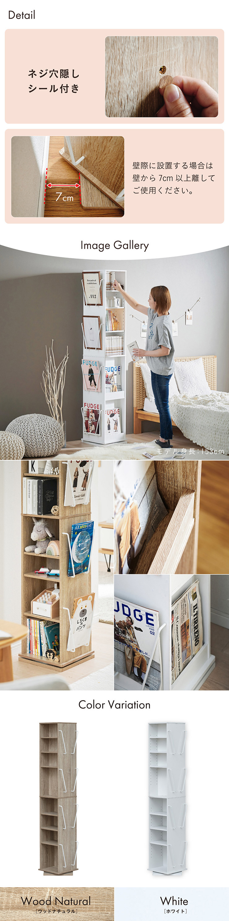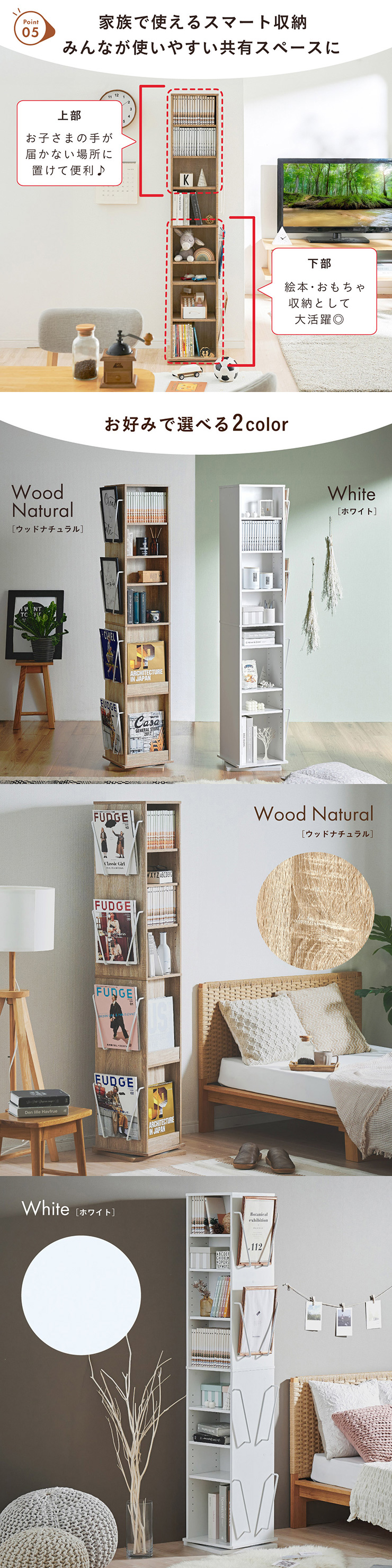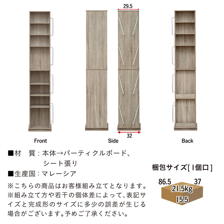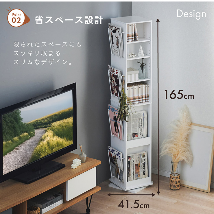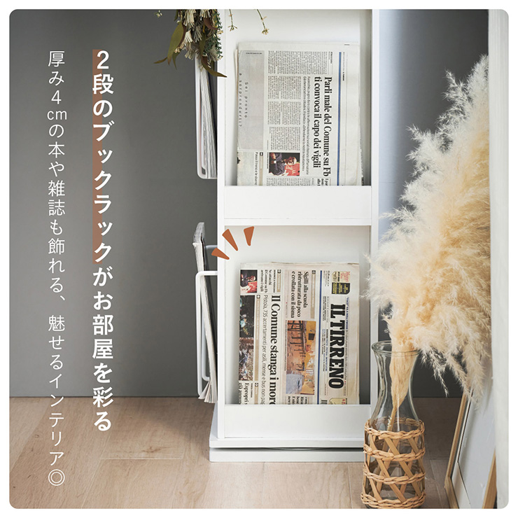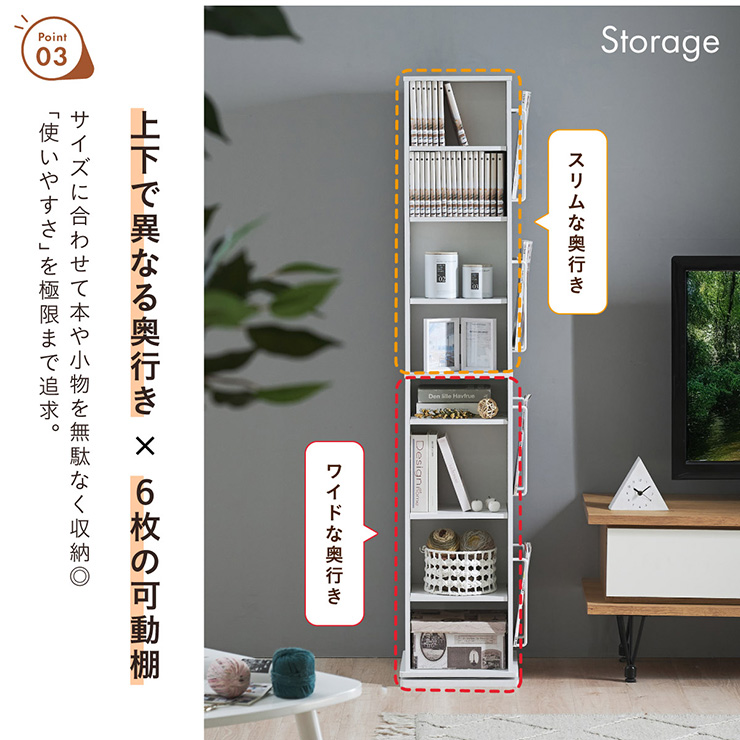 | 回転収納で暮らしを一気にスマートに Jeanie(ジーニー) 省スペース×大容量×魅せる収納 ■必要なときにサッと手が届く圧倒的に使いやすい回転式 下部分の裏面はブックラック仕様 ■省スペース設計 限られたスペースにもスッキリ収まるスリムなデザイン ※回転式のため設置の際は約42cm四方のスペースが必要となります。 ■奥行き違いの上下×6枚の可動棚 サイズに合わせて本や小物を無駄なく収納◎ 「使いやすさ」を極限まで追求 スリムな奥行き ワイドな奥行き 上段・下段ともに18段階の高さ調節 ■魅せて楽しむ収納 収納もインテリアも一気に格上げする、スマートデザイン おしゃれなアイアンで魅せる、スタイリッシュ空間 ■2段のブックラックがお部屋を彩る 厚み3cmの本や雑誌も飾れる、魅せるインテリア◎ ■家族で使えるスマート収納 みんなが使いやすい共有スペースに ※こちらの商品はお客様組み立てとなります。 ※組み立て方や若干の個体差によって、表記サイズと完成形のサイズに多少の誤差が生じる場合がございます。あらかじめご了承ください。 | |