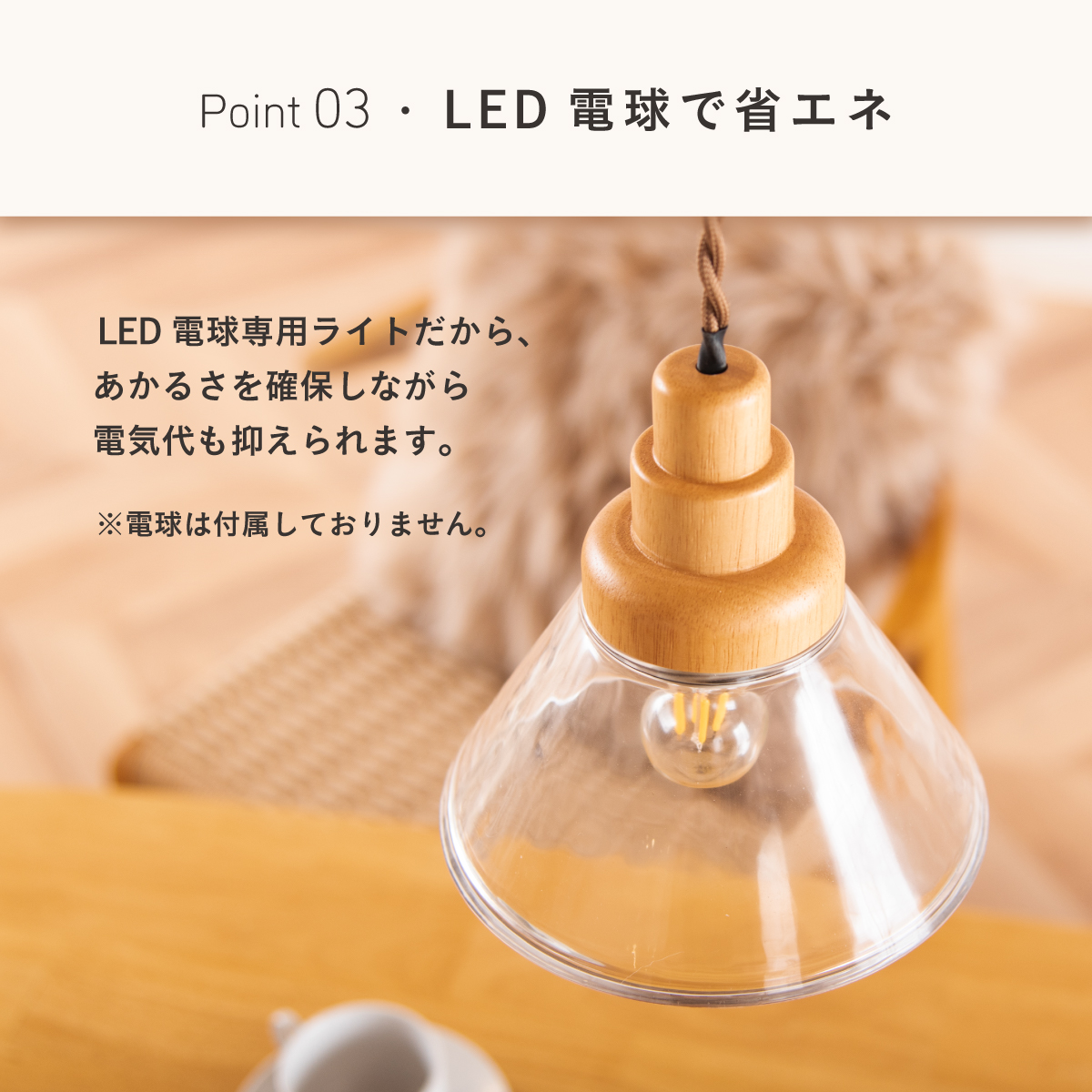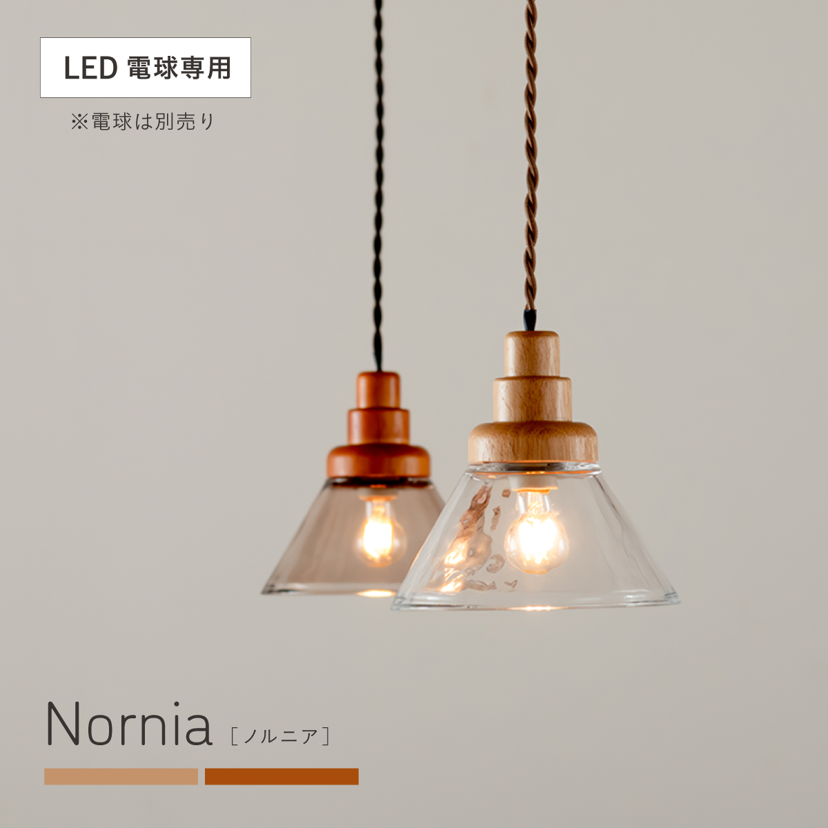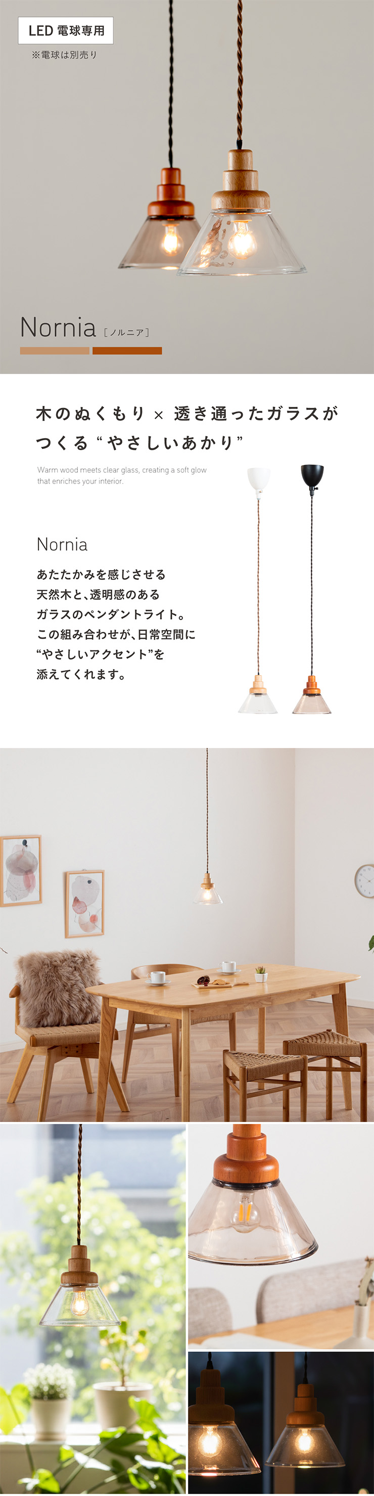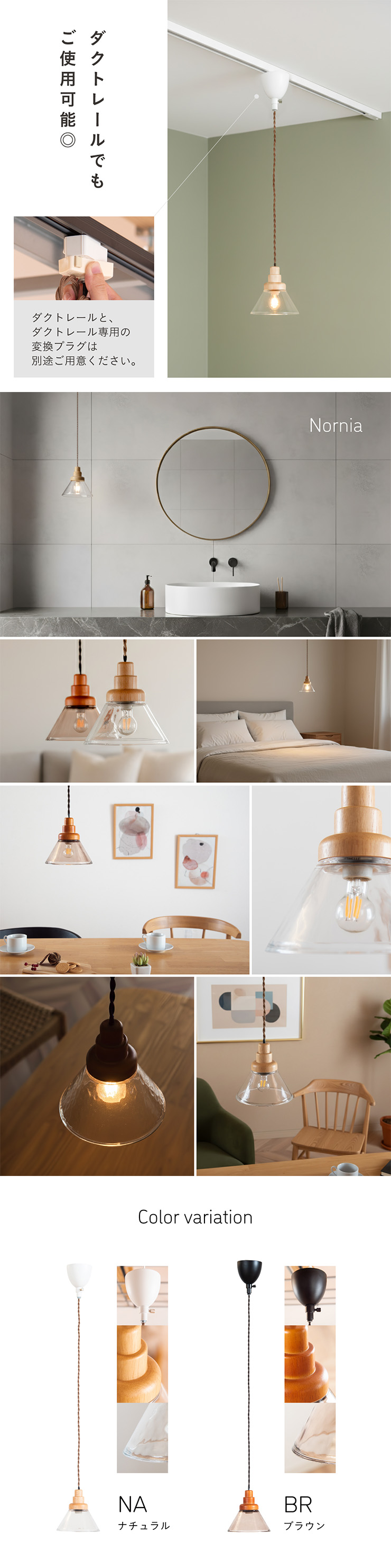 | LED電球専用 ペンダントライト Nornia(ノルニア) 木のぬくもりx透き通ったガラスがつくる“やさしいあかり” あたたかみを感じさせる天然木と、透明感のあるガラスのペンダントライト。 この組み合わせが、日常空間に“やさしいアクセント”を添えてくれrます。 ■シンプルだけど印象的 木とガラスの組み合わせで、主張しすぎないけれど、“おしゃれだな”と感じさせるたたずまいに ■コードの長さを調節可能 コード長さを自由に調節できるから、天井の高さに合わせてベストな配置が可能 ■LED電球で省エネ LED電球専用ライトだから、あかるさを確保しながら電気代も抑えられます。 ■シーンを選ばないデザイン 住まいのあらゆるシーンにフィットする万能デザイン。幅広いテイストのお部屋で活躍してくれます。 ■電球 ・口金:E17 ・定格消費電力:8W以下(※明るさ40W相当以下) ・定格電圧:100V ・この器具はLED電球専用です。 ・白熱電球や蛍光灯電球は使用できません。 ・電球は付属しておりません。 ・電球をご購入される前に、必ずロ金・ワット数のご確認をお願いいたします。 ・調光調色機能付き電球やリモコン付き電球などは対応可能です。 ■引掛けシーリング 一般的なご家庭に設置されている、下記のいずれかのシーリングがあれば、特別な工具や工事なしで簡単に取り付けが可能です。 ・角型引掛けシーリング ・丸型引掛けシーリング ・丸型フル引掛けシーリング ・フル引掛けシーリング ・引掛け埋込ローゼット ※シーリングが設置されていない場合は、別途電気工事が必要になります。 ※種類によっては、シーリングカバー内に完全に収まらない場合があります。ご了承ください。 ■取り付け場所 次のような天井には取り付けないでください。 ・突出部のある天井 ・たわみやすい天井、補強のない薄い天井(ベニヤ板、石膏ボードなど) ・傾斜した天井 ・凸凹のある天井 ※指定以外の場所に取り付けると、火災・落下などの原因になります。 調光機能がついた壁スイッチには取り付けできません。 ※火災の原因になるため、一般のスイッチに交換する取り付けないでください。 ■ダクトレールでもご使用可能〇 ダクトレールとダクトレール専用の変換プラグは別途ご用意ください。 ※電球は付属しておりません。 ※電気用品安全法(PSE法)および日本の安全規格に適合した製品です。 | |