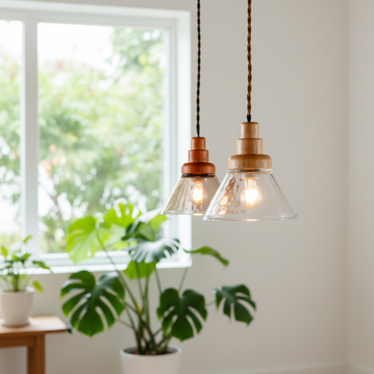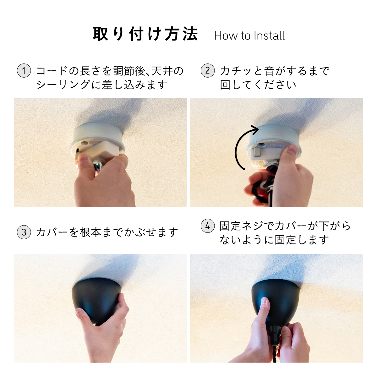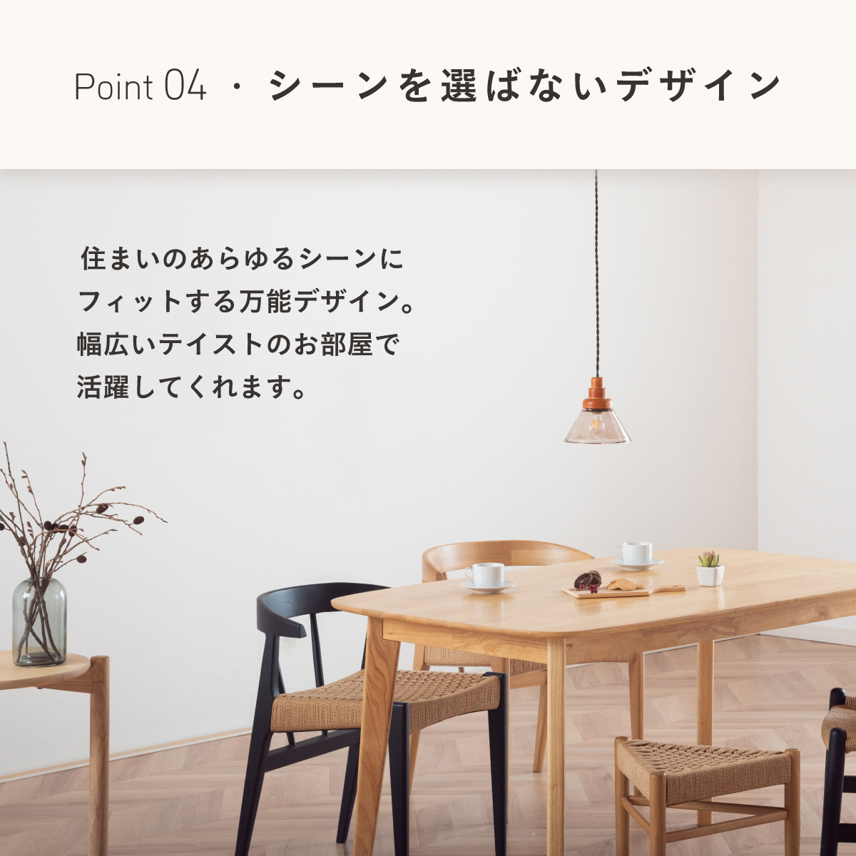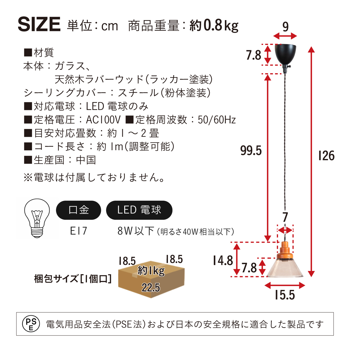 | 材質・素材 | 本体:ガラス・天然木ラバーウッド(ラッカー塗装) シーリングカバー:スチール(粉体塗装) 対応電球:LED電球のみ 定格電圧:AC100V 定格周波数:50/60Hz 目安対応畳数:約1~2畳 コードの長さ:約1m(調節可能) |