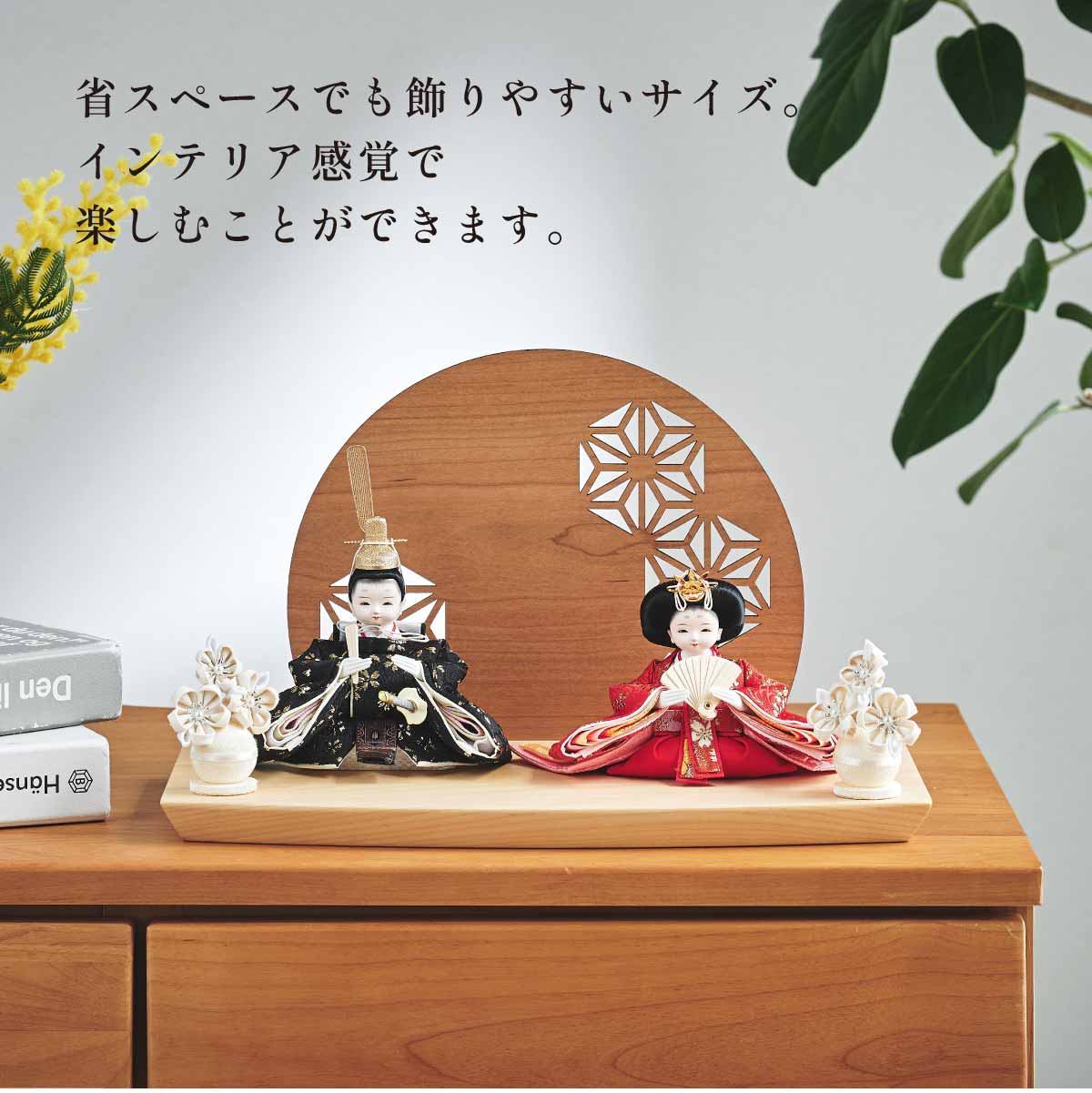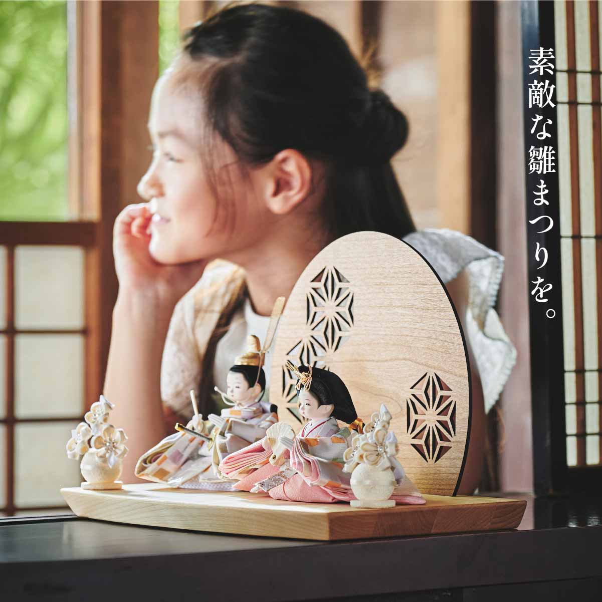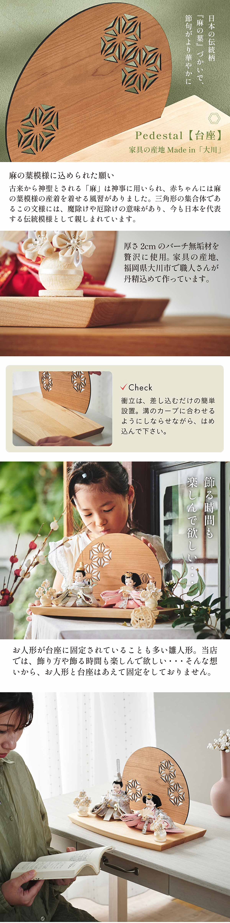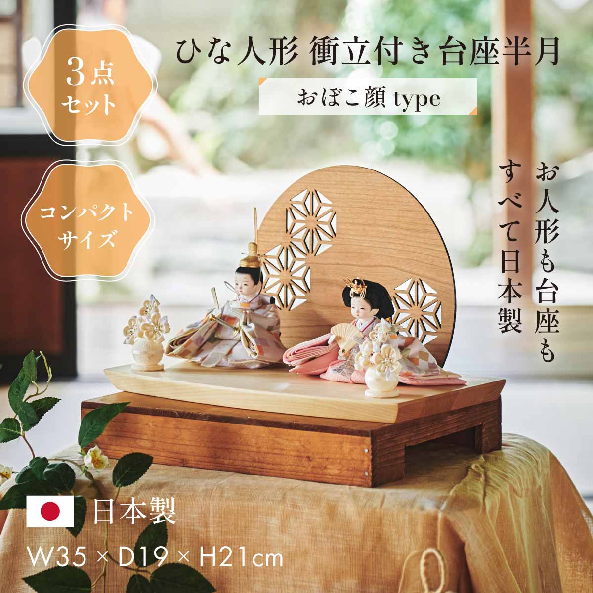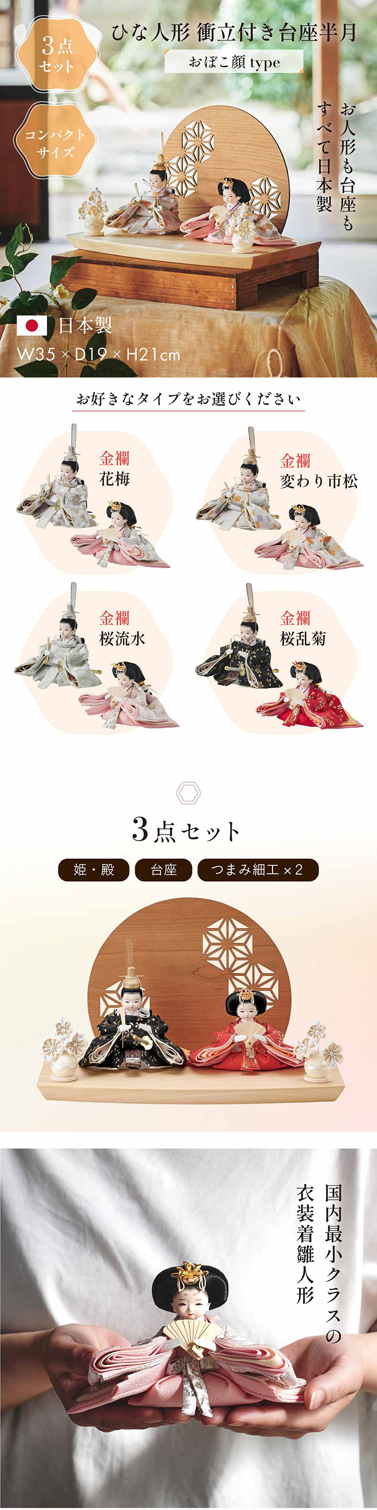 | ひな人形 衝立付き台座半月 おぼこ顔type お人形もケースもすべて日本製 国内最小クラスの衣装着雛人形 穏やかで気品を感じさせる、凛とした表情。伝統的な深みのある美しさが魅力です。 省スペースでも飾りやすいサイズ。インテリア感覚で楽しむことができます。 ■生地は贅沢に、伝統的な金襴を使いました。 金襴とは、400年以上も前から日本に受け継がれる、伝統的な織物です。きらびやかで色彩豊かな風合いや質感をお楽しみください。 ■Flower【花飾り】 200年以上の歴史を持つ「つまみ細工」は、小さな布をおったりつまんだりして組み合わせ、四季折々の花鳥風月を表現する、日本の伝統技術です。 ■Pedestal【台座】 厚さ2cmのバーチ無垢材を贅沢に使用。福岡県大川市で職人さんが丹精込めて作っています。 ※カビや変形、変色が早まる恐れがあるため、使用時保管時ともに、高温多湿、直射日光を避けてご愛用ください。 ※糸の染色加工の性質上、水や摩擦による色移り、色落ちすることがございますのでご注意ください。 ※水洗いはお避けください。 ※本商品は食べ物ではあリません。ロの中には絶対に入れないでください。 ※小さなお子様が手を触れない場所にお飾リください。 ※平らな安定した場所にお飾りください。 ※ギフトラッピング&熨斗には対応していませんのでご了承ください。 ※天然無垢素材の質感を生かした商材です。木目や色、節の有無など、一つひとつ違いがあります。また、湿気や乾燥などで膨張や収縮、反りなどの変化が発生する場合があります。天然素材の特徴をご理解いただいた上でご購入ください。 ※1つ1つ手作りのため、表記サイズと完成形のサイズに多少の誤差が生じる場合がございます。予めご了承ください。 ※本商品は屋内用です。屋外でのご使用はおやめください。 ※衝立は、差し込むだけの簡単設置です。溝のカーブに合わせるようにしならせながら、はめ込んでください。 ※太刀は刀身が鞘から抜ける構造になっています。刃の先が尖っておりますので、お取り扱いには十分お気を付けください。 ※職人が一つひとつ制作しております。お顔や着物、装飾品含め、すべて手作りや手描きで制作しております。そのため、お顔や衣装の柄や色目の出方などには個体差があり雰囲気が変わる場合もございます。あらかじめご了承ください。 ※金糸の小さい穴のように見える部分は、織りの際に糸がヨレることで発生する穴です。当お人形は、衣装着では業界最小クラスの設計で、価格面においても、可能な限りコストを抑えられるよう職人が鋭意努力し、製作を行っております。一点ごと手作りのため、左右が対象でないなどの個体差や、小さなほつれ、糸の飛び出しなどが発生する場合がございますが、いずれも不良品ではございません。あらかじめご了承ください。 | |