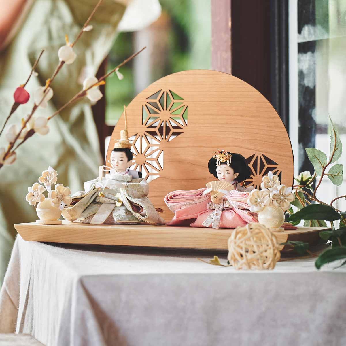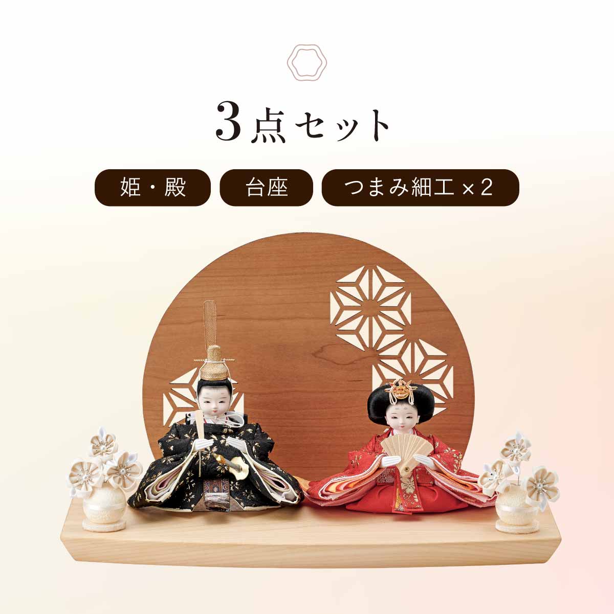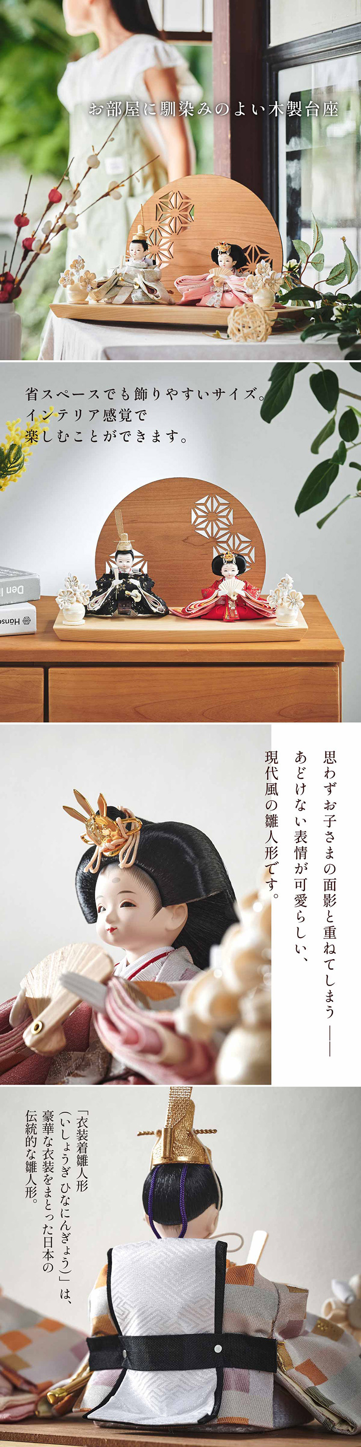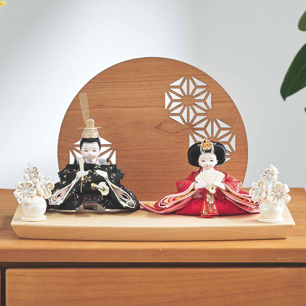 | ひな人形 衝立付き台座半月 おぼこ顔type お人形もケースもすべて日本製 国内最小クラスの衣装着雛人形 穏やかで気品を感じさせる、凛とした表情。伝統的な深みのある美しさが魅力です。 省スペースでも飾りやすいサイズ。インテリア感覚で楽しむことができます。 ■生地は贅沢に、伝統的な金襴を使いました。 金襴とは、400年以上も前から日本に受け継がれる、伝統的な織物です。きらびやかで色彩豊かな風合いや質感をお楽しみください。 ■Flower【花飾り】 200年以上の歴史を持つ「つまみ細工」は、小さな布をおったりつまんだりして組み合わせ、四季折々の花鳥風月を表現する、日本の伝統技術です。 ■Pedestal【台座】 厚さ2cmのバーチ無垢材を贅沢に使用。福岡県大川市で職人さんが丹精込めて作っています。 ※カビや変形、変色が早まる恐れがあるため、使用時保管時ともに、高温多湿、直射日光を避けてご愛用ください。 ※糸の染色加工の性質上、水や摩擦による色移り、色落ちすることがございますのでご注意ください。 ※水洗いはお避けください。 ※本商品は食べ物ではあリません。ロの中には絶対に入れないでください。 ※小さなお子様が手を触れない場所にお飾リください。 ※平らな安定した場所にお飾りください。 ※ギフトラッピング&熨斗には対応していませんのでご了承ください。 ※天然無垢素材の質感を生かした商材です。木目や色、節の有無など、一つひとつ違いがあります。また、湿気や乾燥などで膨張や収縮、反りなどの変化が発生する場合があります。天然素材の特徴をご理解いただいた上でご購入ください。 ※1つ1つ手作りのため、表記サイズと完成形のサイズに多少の誤差が生じる場合がございます。予めご了承ください。 ※本商品は屋内用です。屋外でのご使用はおやめください。 ※衝立は、差し込むだけの簡単設置です。溝のカーブに合わせるようにしならせながら、はめ込んでください。 ※太刀は刀身が鞘から抜ける構造になっています。刃の先が尖っておりますので、お取り扱いには十分お気を付けください。 ※職人が一つひとつ制作しております。お顔や着物、装飾品含め、すべて手作りや手描きで制作しております。そのため、お顔や衣装の柄や色目の出方などには個体差があり雰囲気が変わる場合もございます。あらかじめご了承ください。 ※金糸の小さい穴のように見える部分は、織りの際に糸がヨレることで発生する穴です。当お人形は、衣装着では業界最小クラスの設計で、価格面においても、可能な限りコストを抑えられるよう職人が鋭意努力し、製作を行っております。一点ごと手作りのため、左右が対象でないなどの個体差や、小さなほつれ、糸の飛び出しなどが発生する場合がございますが、いずれも不良品ではございません。あらかじめご了承ください。 | |