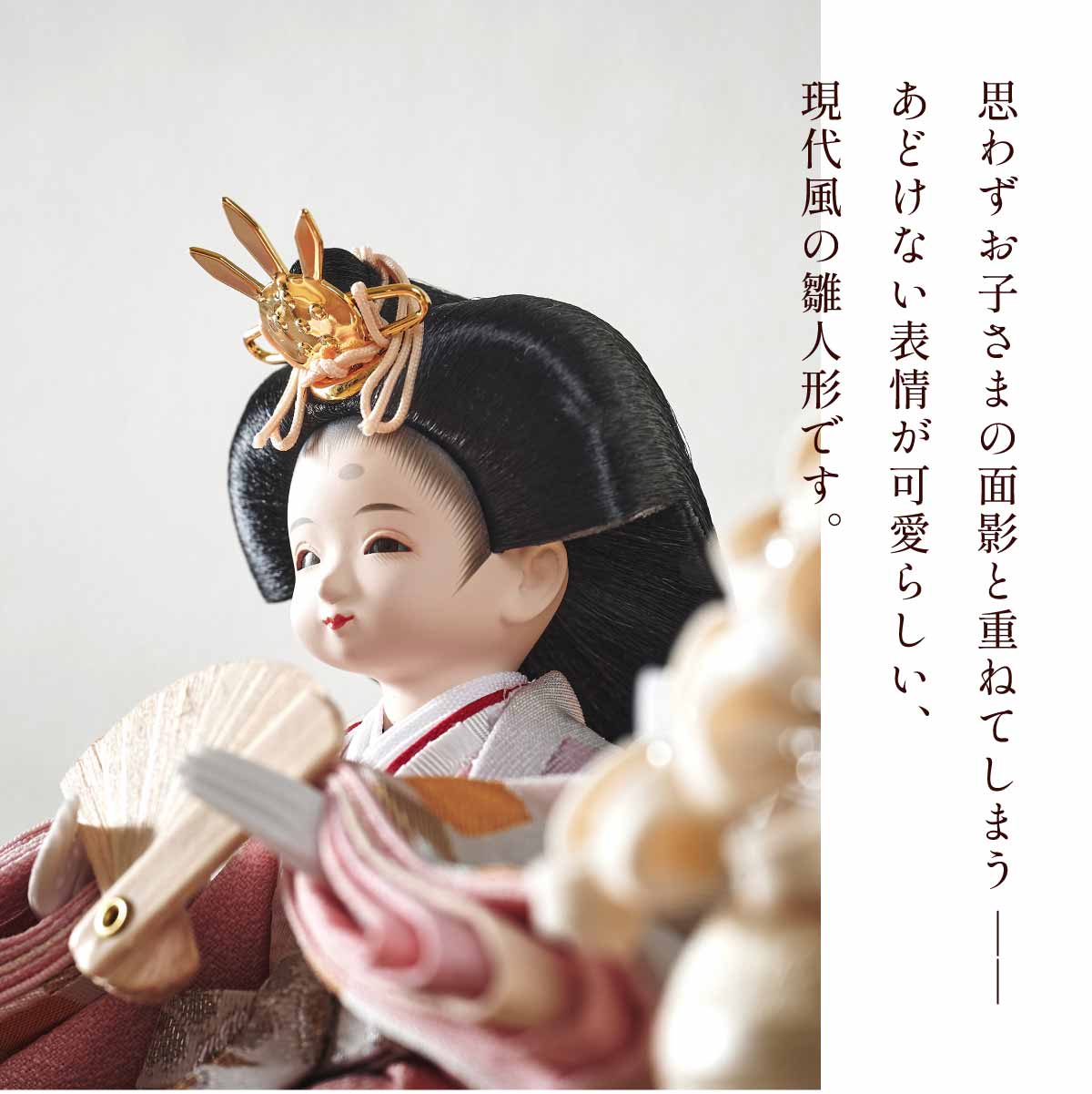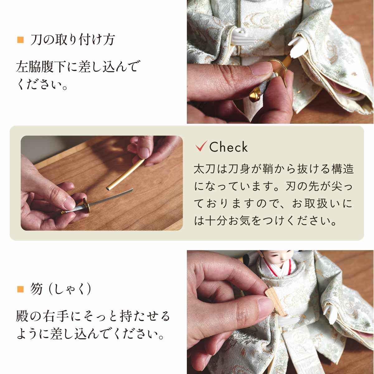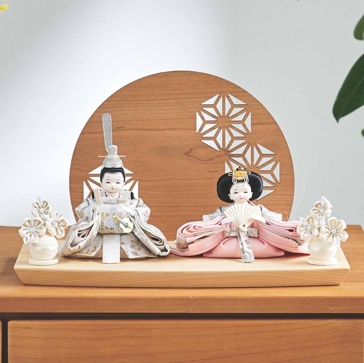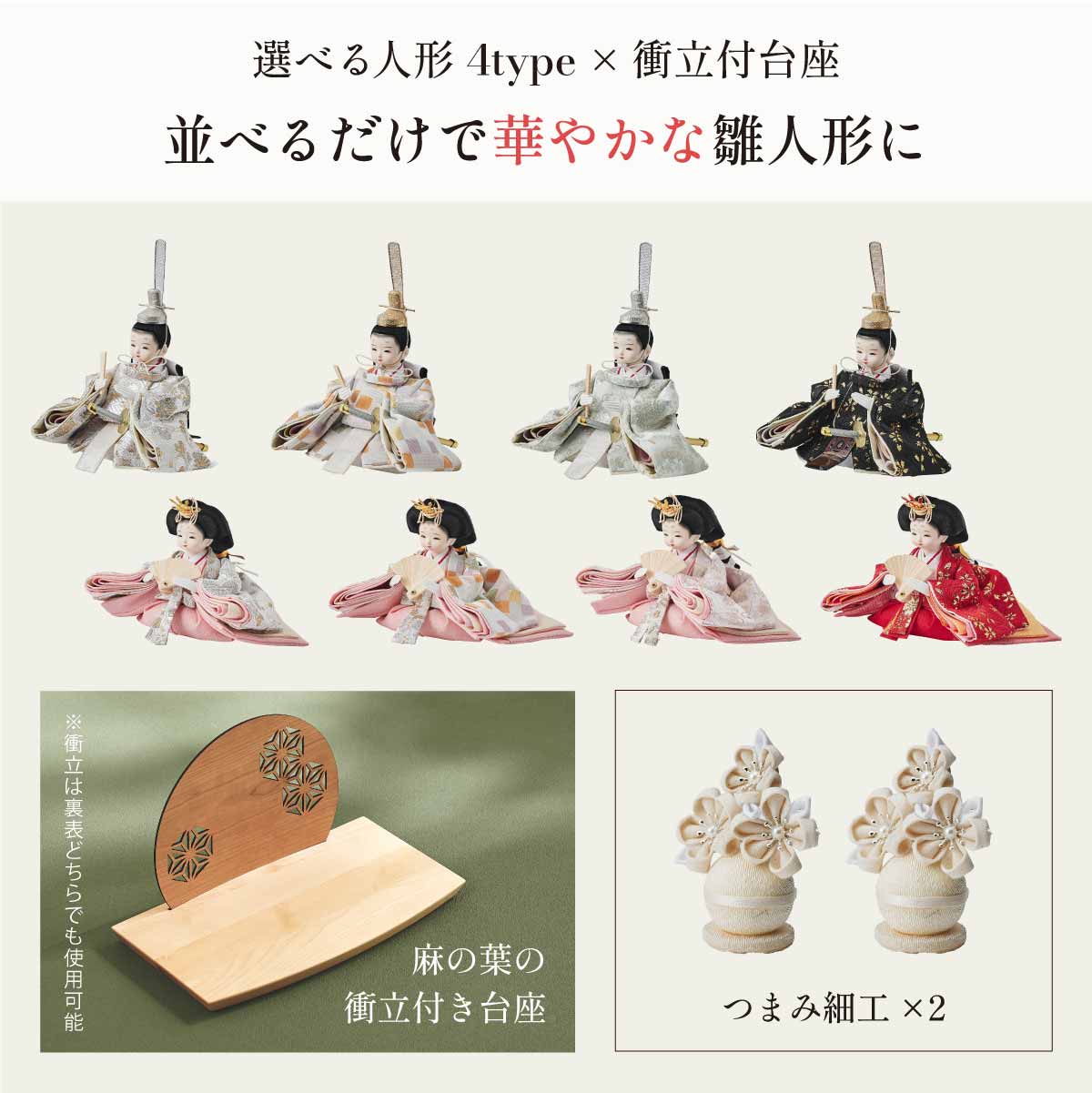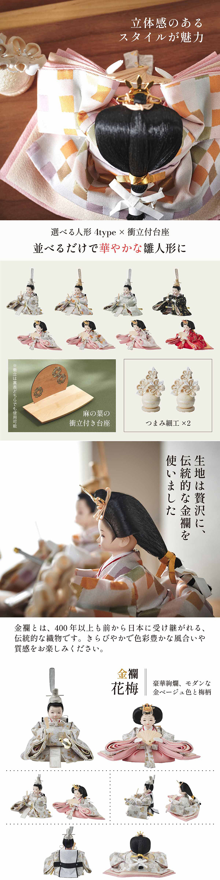 | ひな人形 衝立付き台座半月 おぼこ顔type お人形もケースもすべて日本製 国内最小クラスの衣装着雛人形 穏やかで気品を感じさせる、凛とした表情。伝統的な深みのある美しさが魅力です。 省スペースでも飾りやすいサイズ。インテリア感覚で楽しむことができます。 ■生地は贅沢に、伝統的な金襴を使いました。 金襴とは、400年以上も前から日本に受け継がれる、伝統的な織物です。きらびやかで色彩豊かな風合いや質感をお楽しみください。 ■Flower【花飾り】 200年以上の歴史を持つ「つまみ細工」は、小さな布をおったりつまんだりして組み合わせ、四季折々の花鳥風月を表現する、日本の伝統技術です。 ■Pedestal【台座】 厚さ2cmのバーチ無垢材を贅沢に使用。福岡県大川市で職人さんが丹精込めて作っています。 ※カビや変形、変色が早まる恐れがあるため、使用時保管時ともに、高温多湿、直射日光を避けてご愛用ください。 ※糸の染色加工の性質上、水や摩擦による色移り、色落ちすることがございますのでご注意ください。 ※水洗いはお避けください。 ※本商品は食べ物ではあリません。ロの中には絶対に入れないでください。 ※小さなお子様が手を触れない場所にお飾リください。 ※平らな安定した場所にお飾りください。 ※ギフトラッピング&熨斗には対応していませんのでご了承ください。 ※天然無垢素材の質感を生かした商材です。木目や色、節の有無など、一つひとつ違いがあります。また、湿気や乾燥などで膨張や収縮、反りなどの変化が発生する場合があります。天然素材の特徴をご理解いただいた上でご購入ください。 ※1つ1つ手作りのため、表記サイズと完成形のサイズに多少の誤差が生じる場合がございます。予めご了承ください。 ※本商品は屋内用です。屋外でのご使用はおやめください。 ※衝立は、差し込むだけの簡単設置です。溝のカーブに合わせるようにしならせながら、はめ込んでください。 ※太刀は刀身が鞘から抜ける構造になっています。刃の先が尖っておりますので、お取り扱いには十分お気を付けください。 ※職人が一つひとつ制作しております。お顔や着物、装飾品含め、すべて手作りや手描きで制作しております。そのため、お顔や衣装の柄や色目の出方などには個体差があり雰囲気が変わる場合もございます。あらかじめご了承ください。 ※金糸の小さい穴のように見える部分は、織りの際に糸がヨレることで発生する穴です。当お人形は、衣装着では業界最小クラスの設計で、価格面においても、可能な限りコストを抑えられるよう職人が鋭意努力し、製作を行っております。一点ごと手作りのため、左右が対象でないなどの個体差や、小さなほつれ、糸の飛び出しなどが発生する場合がございますが、いずれも不良品ではございません。あらかじめご了承ください。 | |